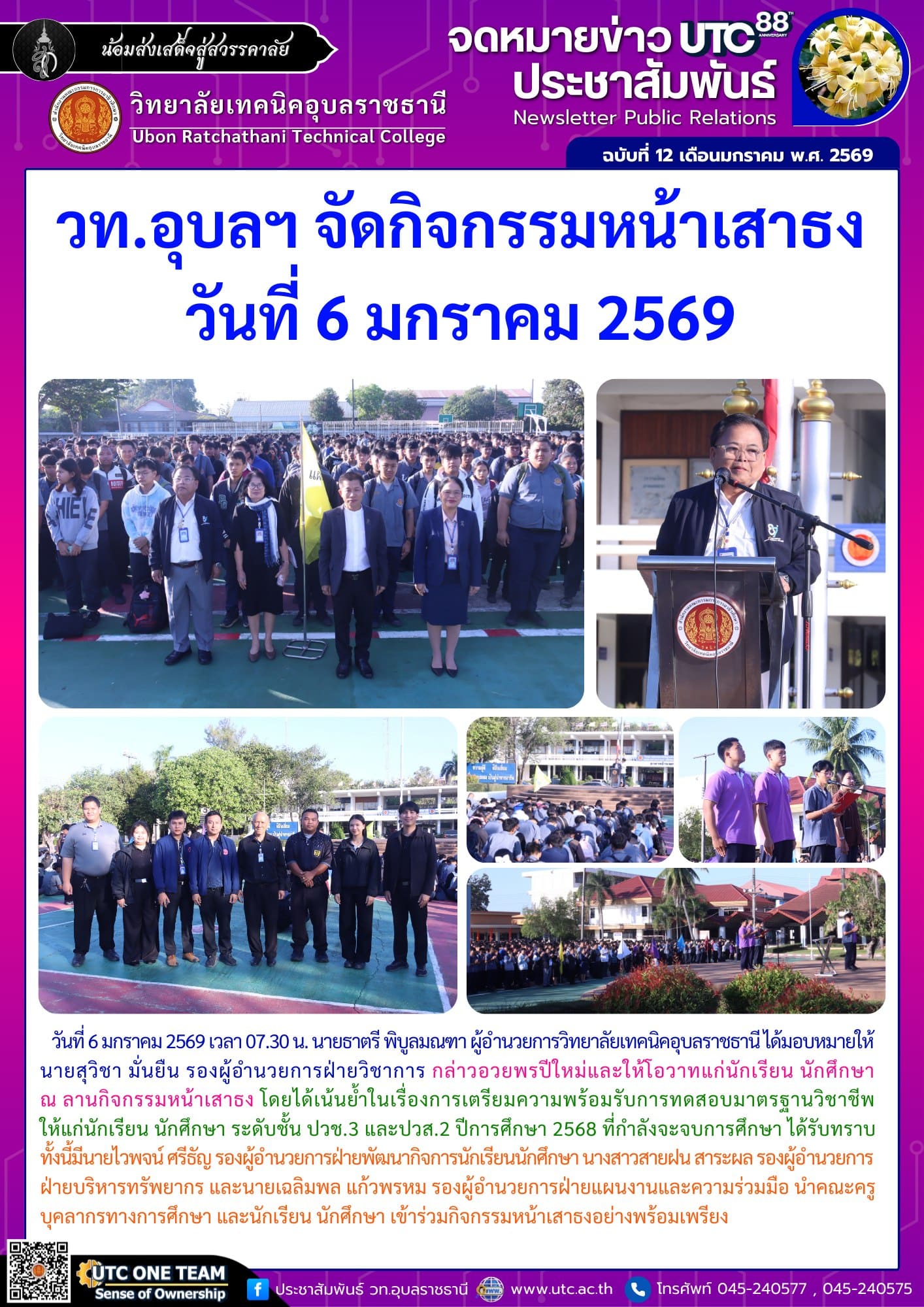 วันที่ 6 มกราคม 2569 เวลา 07.30 น. นายธาตรี พิบูลมณฑา ผู้อำนวยการวิทยาลัยเทคนิคอุบลราชธานี ได้มอบหมายให้ นายสุวิชา มั่นยืน รองผู้อำนวยการฝ่ายวิชาการ กล่าวอวยพรปีใหม่และให้โอวาทแก่นักเรียน นักศึกษา ณ ลานกิจกรรมหน้าเสาธง โดยได้ (เพิ่มเติม…)