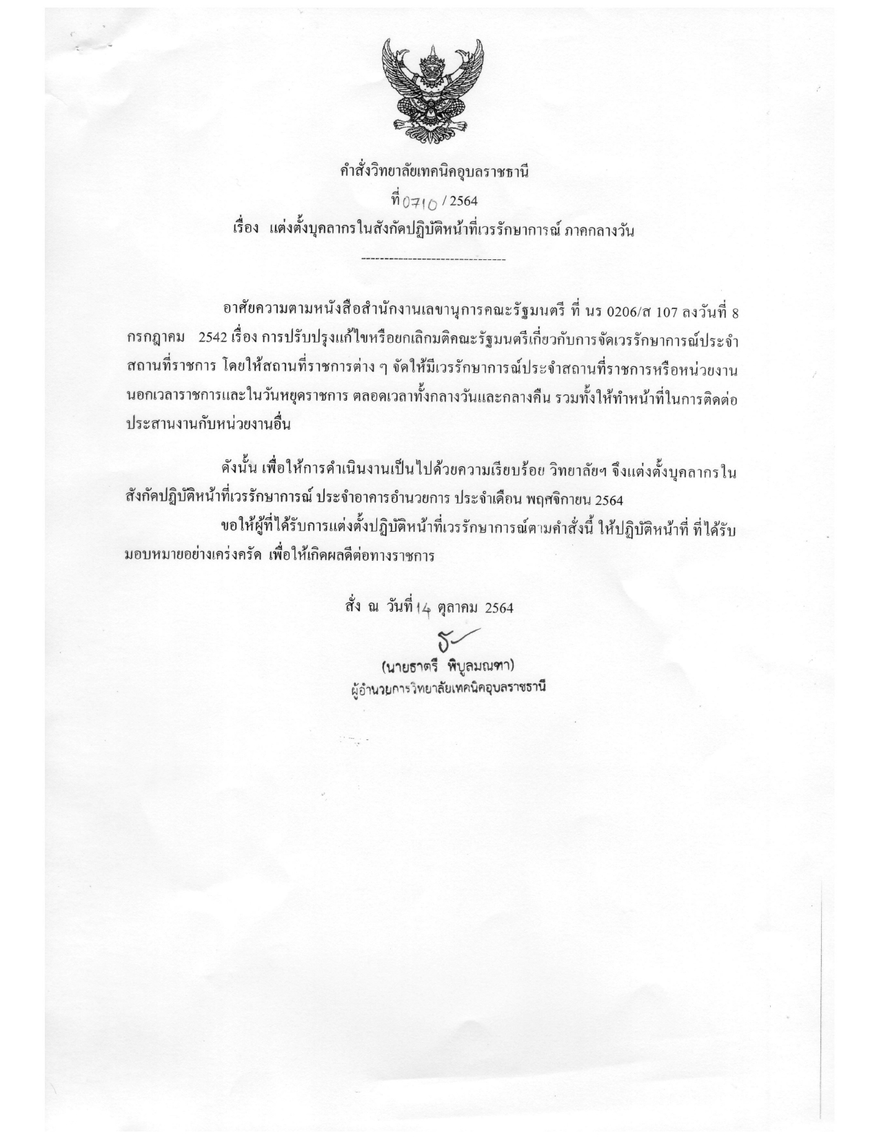 แต่งตั้งบุคคลากรในสังกัดปฏิบัติหน้าที่เวรรักษาการณ์ ภาคกลางวัน ประจำเดือนพฤศจิกายน 2564