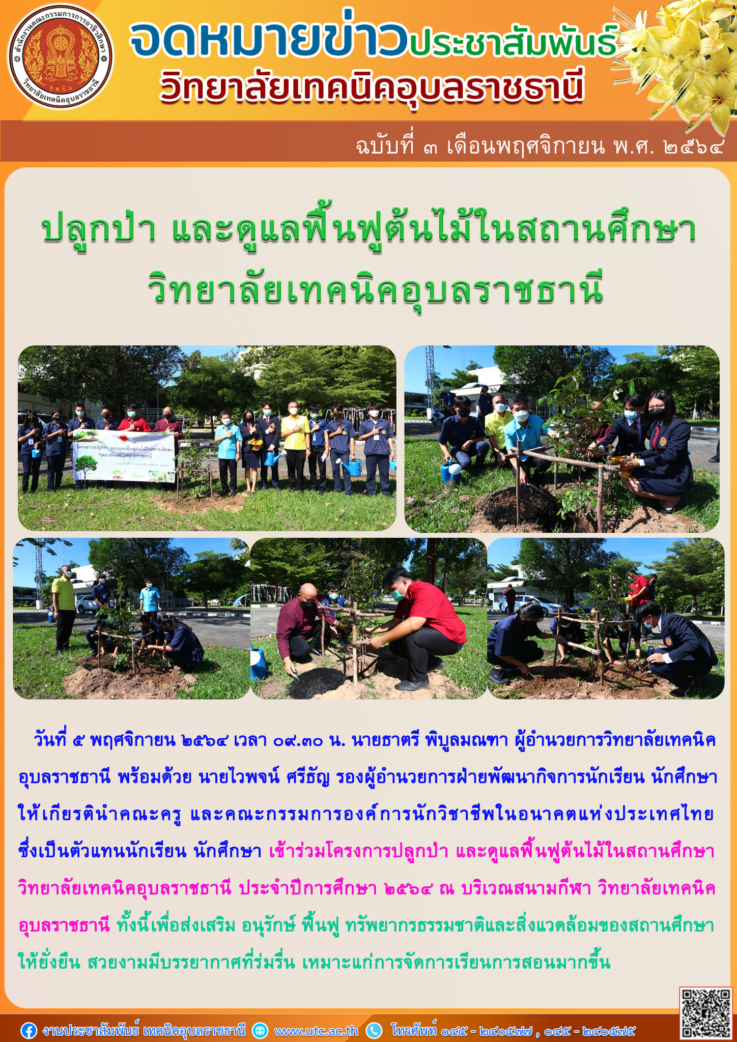 วันที่ ๕ พฤศจิกายน ๒๕๖๔ เวลา ๐๙.๓๐ น.นายธาตรี พิบูลมณฑา ผู้อำนวยการวิทยาลัยเทคนิคอุบลราชธานี พร้อมด้วย นายไวพจน์ ศรีธัญ รองผู้อำนวยการฝ่ายพัฒนากิจการนักเรียน นักศึกษา ให้เกียรตินำคณะครู และคณะกรรมการองค์การนักวิชาชีพในอนาคตแห่งประเทศไทย ซึ่งเป็นตัวแทนนักเรียน นักศึกษา เข้าร่วมโครงการปลูกป่า และดูแลฟื้นฟูต้นไม้ในสถานศึกษา วิทยาลัยเทคนิคอุบลราชธานี ประจำปีการศึกษา ๒๕๖๔ ณ บริเวณสนามกีฬา วิทยาลัยเทคนิคอุบลราชธานี ทั้งนี้เพื่อส่งเสริม อนุรักษ์ ฟื้นฟู ทรัพยากรธรรมชาติและสิ่งแวดล้อมของสถานศึกษาให้ยั่งยืน สวยงามมีบรรยากาศที่ร่มรื่น เหมาะแก่การจัดการเรียนการสอนมากขึ้น