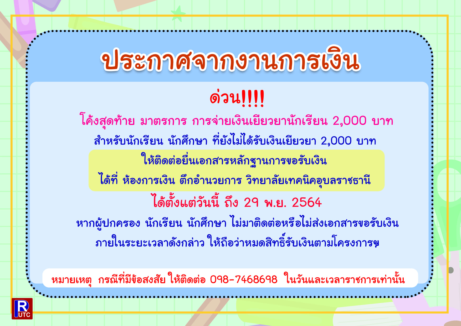 สำหรับนักเรียน นักศึกษาที่ยังไม่ได้รับเงินเยียวยา 2,000 บาทให้ติดต่อยื่นเอกสารหลักฐานการขอรับเงิน ได้ที่ ห้องการเงิน ตึกอำนวยการ วิทยาลัยเทคนิคอุบลราชธานี ได้ตั้งแต่วันนี้ ถึง 29 พ.ย. 2564