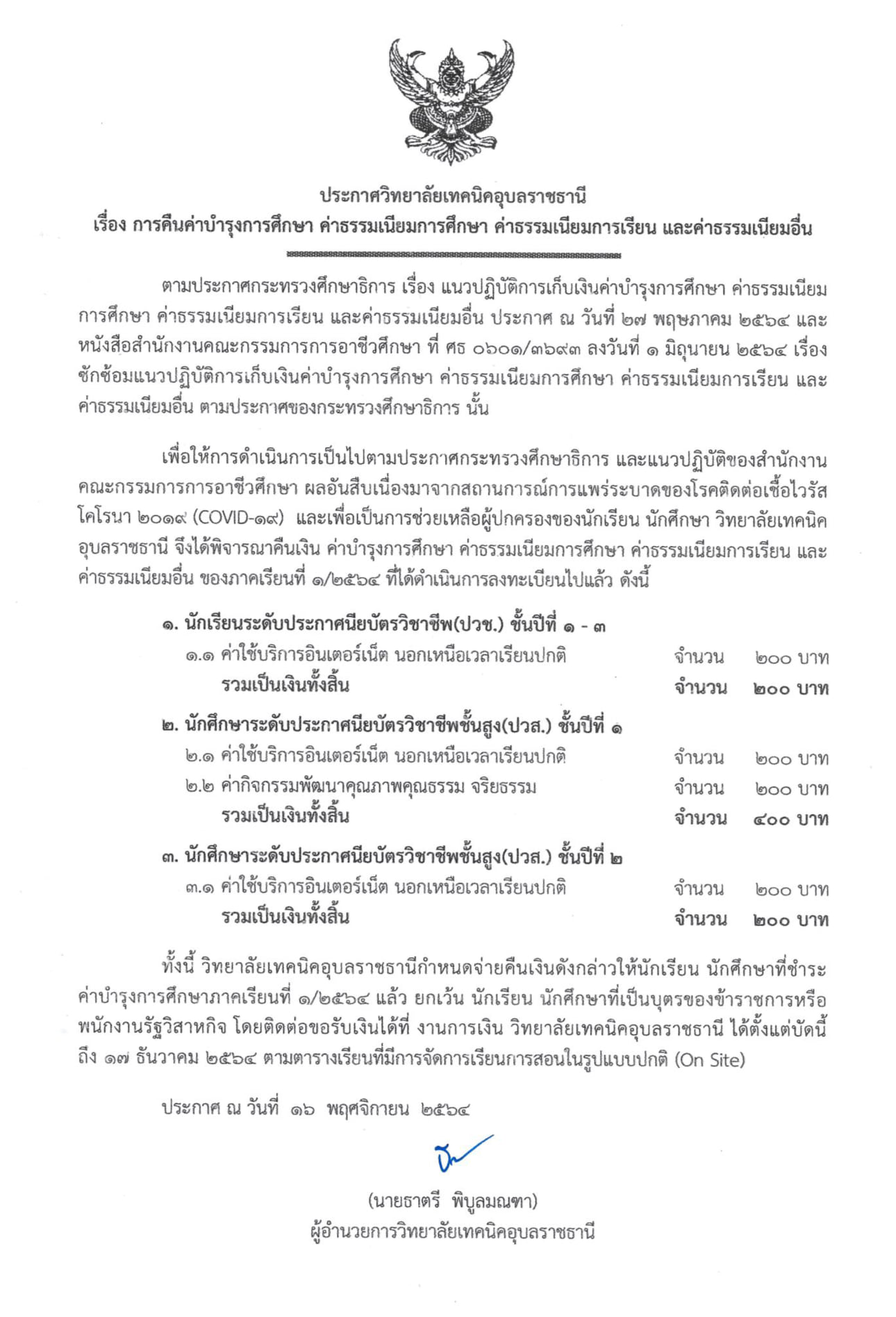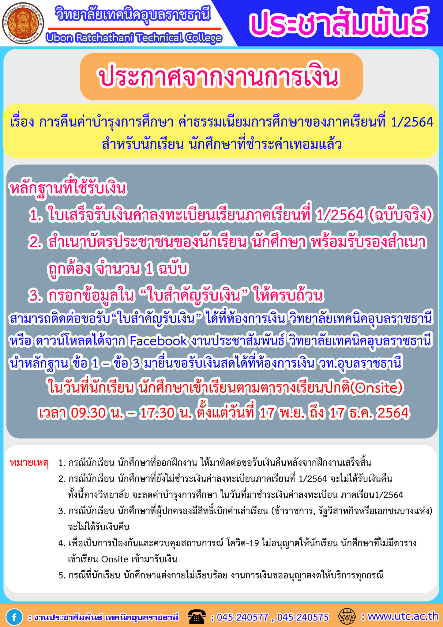 เรื่อง การคืนค่าบำรุงการศึกษาค่าธรรมเนียมการศึกษาของภาคเรียนที่ 1/2564 สำหรับนักเรียน นักศึกษาที่ชำระค่าเทอมแล้ว
