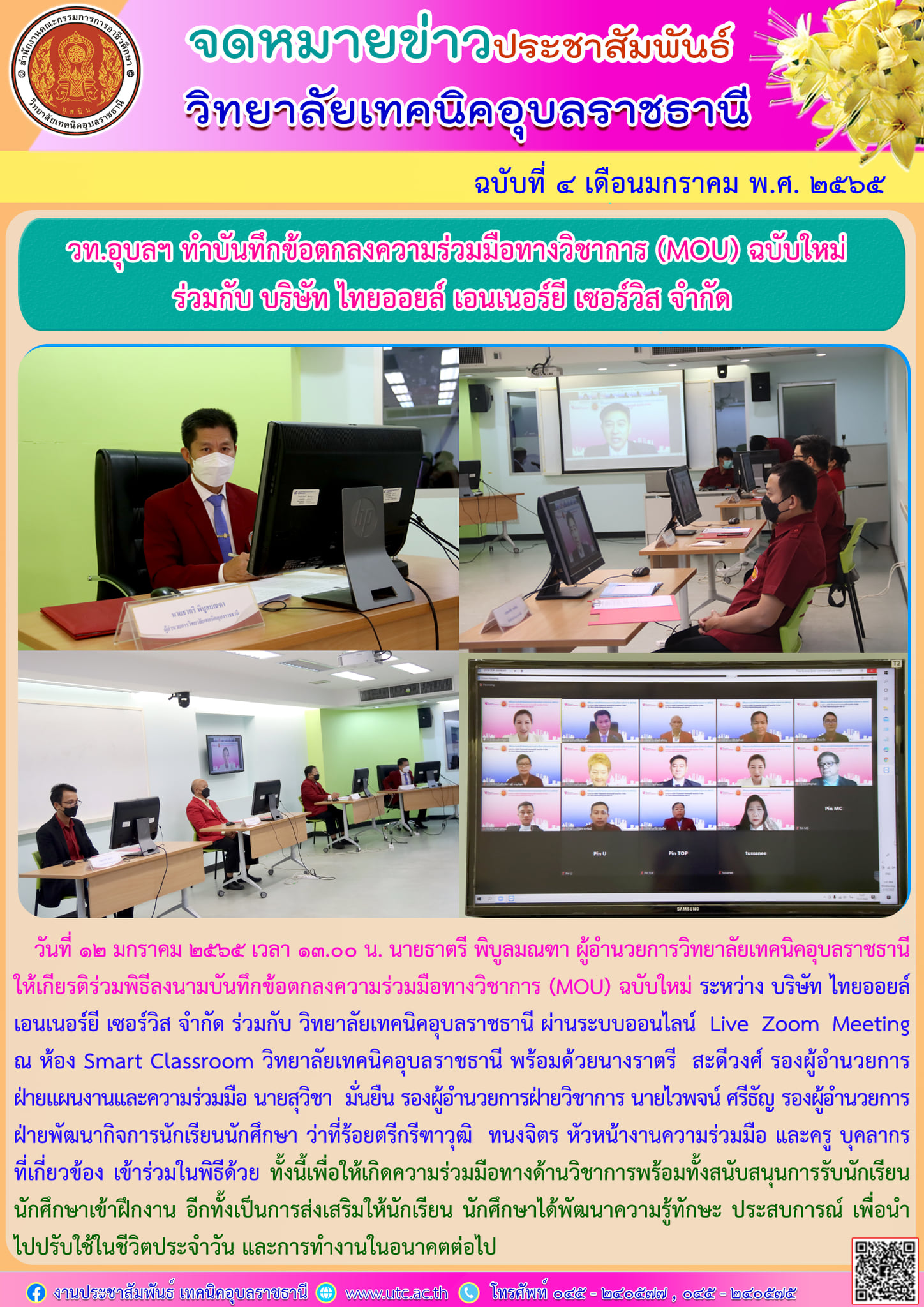 วันที่ ๑๒ มกราคม๒๕๖๕ เวลา ๑๓.๐๐ น. นายธาตรี พิบูลมณฑา ผู้อำนวยการวิทยาลัยเทคนิคอุบลราชธานีให้เกียรติร่วมพิธีลงนามบันทึกข้อตกลงความร่วมมือทางวิชาการ (MOU) ฉบับใหม่ ระหว่าง บริษัท ไทยออยล์ เอนเนอร์ยี เซอร์วิส จำกัด ร่วมกับ วิทยาลัยเทคนิคอุบลราชธานี ผ่านระบบออนไลน์ Live Zoom Meeting ณ ห้อง Smart Classroom วิทยาลัยเทคนิคอุบลราชธานี พร้อมด้วยนางราตรี สะดีวงศ์ รองผู้อำนวยการฝ่ายแผนงานและความร่วมมือ นายสุวิชา มั่นยืน รองผู้อำนวยการฝ่ายวิชาการ นายไวพจน์ ศรีธัญ รองผู้อำนวยการฝ่ายพัฒนากิจการนักเรียนนักศึกษา ว่าที่ร้อยตรีกรีฑาวุฒิ ทนงจิตร หัวหน้างานความร่วมมือ และครู บุคลากรที่เกี่ยวข้อง เข้าร่วมในพิธีด้วย ทั้งนี้เพื่อให้เกิดความร่วมมือทางด้านวิชาการพร้อมทั้งสนับสนุนการรับนักเรียน นักศึกษาเข้าฝึกงาน อีกทั้งเป็นการส่งเสริมให้นักเรียน นักศึกษาได้พัฒนาความรู้ทักษะ ประสบการณ์ เพื่อนำไปปรับใช้ในชีวิตประจำวัน และการทำงานในอนาคตต่อไป