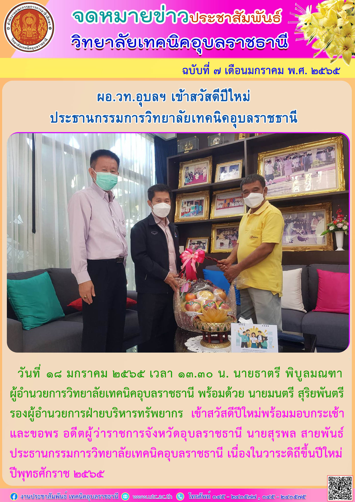 วันที่ ๑๘ มกราคม๒๕๖๕ เวลา ๑๓.๓๐ น. นายธาตรี พิบูลมณฑา ผู้อำนวยการวิทยาลัยเทคนิคอุบลราชธานี พร้อมด้วย นายมนตรี สุริยพันตรี รองผู้อำนวยการฝ่ายบริหารทรัพยากร เข้าสวัสดีปีใหม่พร้อมมอบกระเช้า และขอพร อดีตผู้ว่าราชการจังหวัดอุบลราชธานี นายสุรพล สายพันธ์ ประธานกรรมการวิทยาลัยเทคนิคอุบลราชธานี เนื่องในวาระดิถีขึ้นปีใหม่ ปีพุทธศักราช ๒๕๖๕