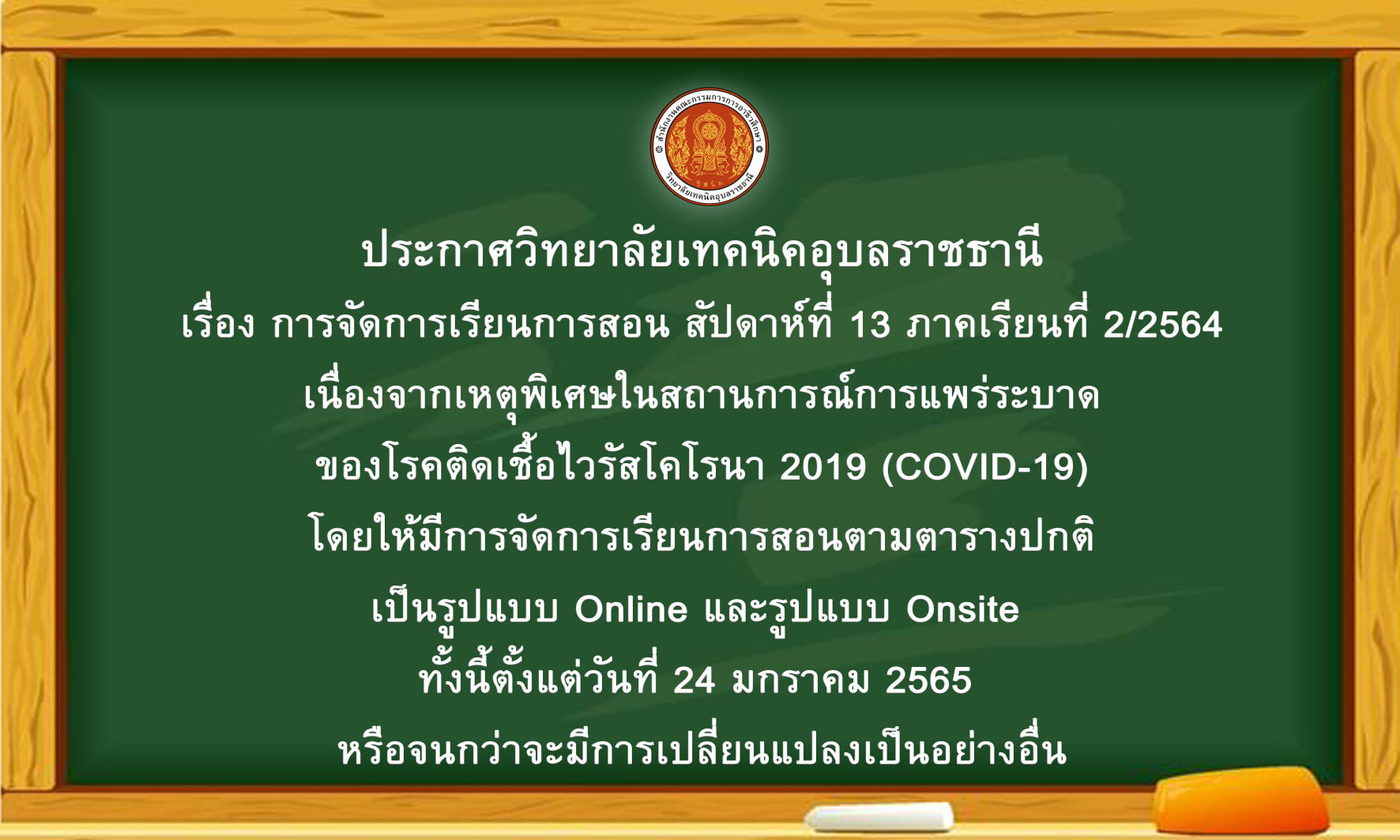 เรื่อง การจัดการเรียนการสอน สัปดาห์ที่ 13 ภาคเรียนที่ 2/2564 เนื่องจากเหตุพิเศษในสถานการณ์การแพร่ระบาดของโรคติดเชื้อไวรัสโคโรนา 2019 (COVID-19) โดยให้มีการจัดการเรียนการสอนตามตารางปกติเป็นรูปแบบ Online และรูปแบบ Onsite ทั้งนี้ตั้งแต่วันที่ 24 มกราคม 2565 หรือจนกว่าจะมีการเปลี่ยนแปลงเป็นอย่างอื่น