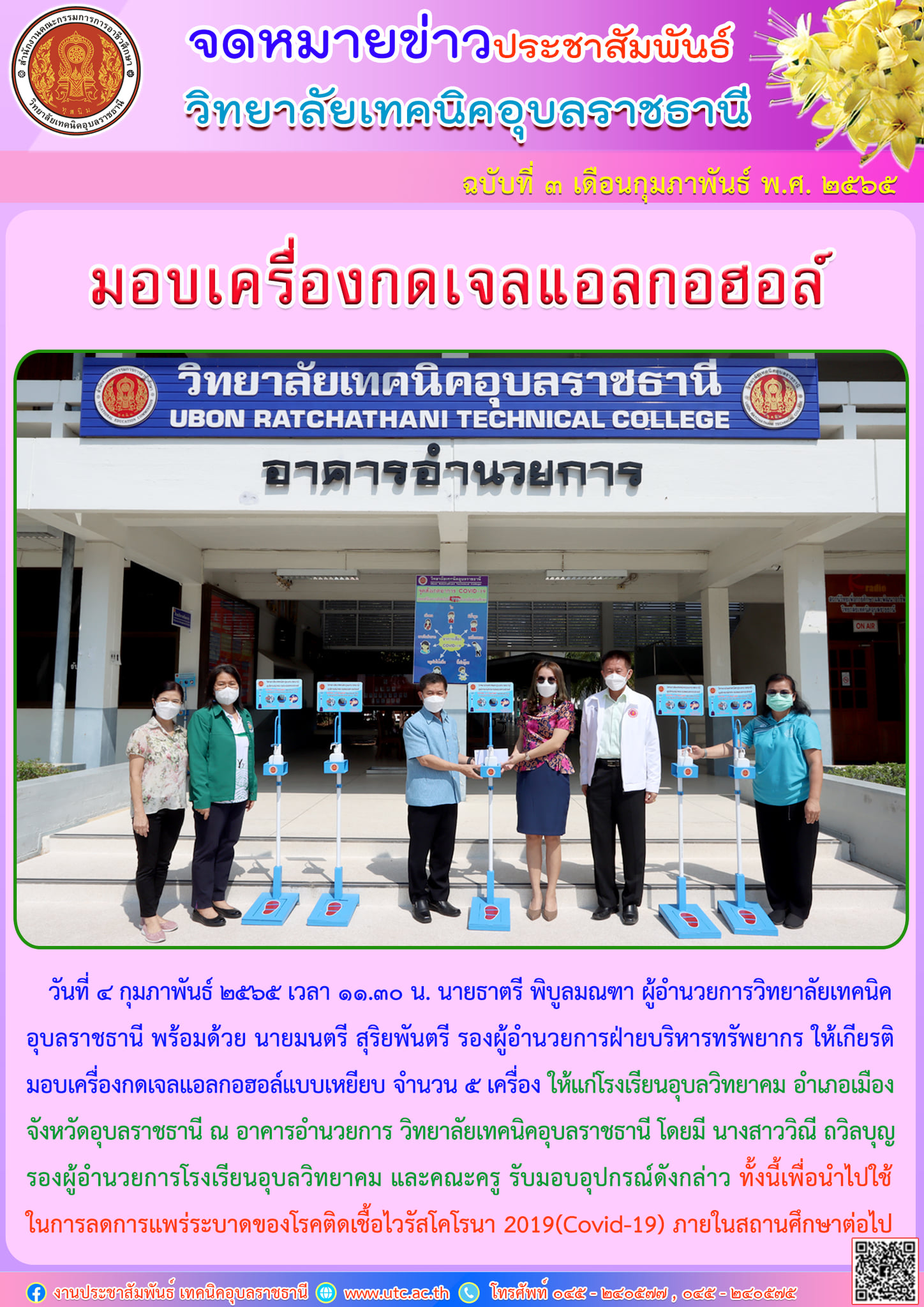 วันที่ ๔ กุมภาพันธ์ ๒๕๖๕ เวลา ๑๑.๓๐ น. นายธาตรีพิบูลมณฑา ผู้อำนวยการวิทยาลัยเทคนิคอุบลราชธานี พร้อมด้วย นายมนตรี สุริยพันตรี รองผู้อำนวยการฝ่ายบริหารทรัพยากร ให้เกียรติมอบเครื่องกดเจลแอลกอฮอล์แบบเหยียบ จำนวน ๕ เครื่อง ให้แก่โรงเรียนอุบลวิทยาคม อำเภอเมือง จังหวัดอุบลราชธานี ณ อาคารอำนวยการ วิทยาลัยเทคนิคอุบลราชธานี โดยมี นางสาววิณี ถวิลบุญ รองผู้อำนวยการโรงเรียนอุบลวิทยาคม และคณะครู รับมอบอุปกรณ์ดังกล่าว ทั้งนี้เพื่อนำไปใช้ในการลดการแพร่ระบาดของโรคติดเชื้อไวรัสโคโรนา 2019 (Covid-19) ภายในสถานศึกษาต่อไป