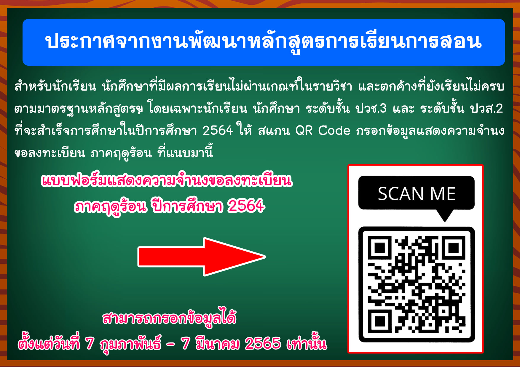 สำหรับนักเรียน นักศึกษาที่มีผลการเรียนไม่ผ่านเกณฑ์ในรายวิชา และตกค้างที่ยังเรียนไม่ครบ ตามมาตรฐานหลักสูตรฯ โดยเฉพาะนักเรียน นีักศึกษา ระดับชั้น ปวช.3 และ ระดับชั้น ปวส.2 ที่จะสำเร็จการศึกษาในปีการศึกษา 2564 ให้ สแกน QR Code กรอกข้อมูลแสดงความจำนงขอลงทะเบียน ภาคฤดูร้อน ที่แนบมานี้ หรือกรอกข้อมูลที่ลิงก์ด้านล่างนี้ >>>คลิก<<<