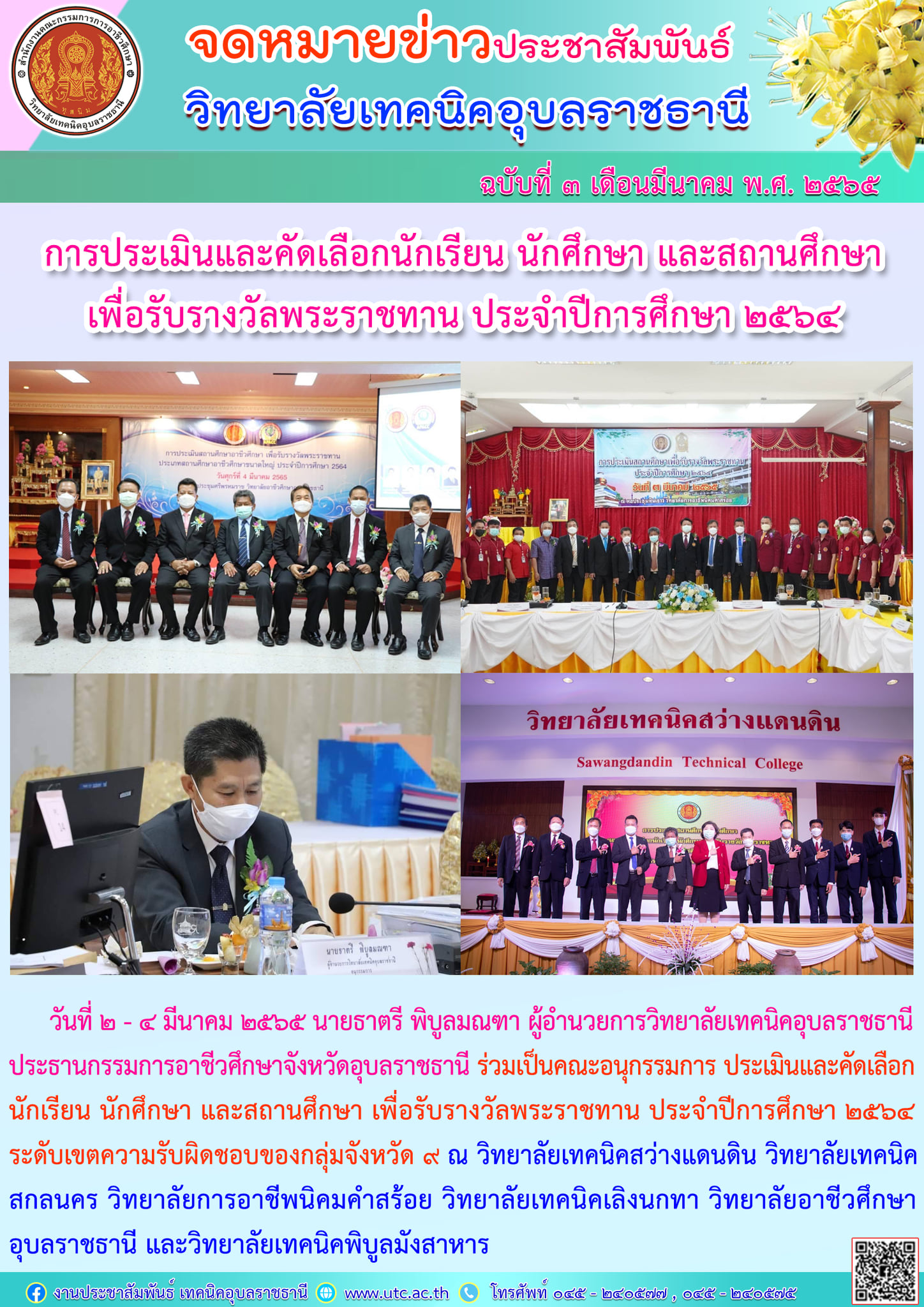 ผู้อำนวยการวิทยาลัยเทคนิคอุบลราชธานี ประธานกรรมการอาชีวศึกษาจังหวัดอุบลราชธานี ร่วมเป็นคณะอนุกรรมการ ประเมินและคัดเลือกนักเรียน นักศึกษา และสถานศึกษา เพื่อรับรางวัลพระราชทาน ประจำปีการศึกษา ๒๕๖๔ ระดับเขตความรับผิดชอบของกลุ่มจังหวัด ๙ ณ วิทยาลัยเทคนิคสว่างแดนดิน วิทยาลัยเทคนิคสกลนคร วิทยาลัยการอาชีพนิคมคำสร้อย วิทยาลัยเทคนิคเลิงนกทา วิทยาลัยอาชีวศึกษาอุบลราชธานี และวิทยาลัยเทคนิคพิบูลมังสาหาร