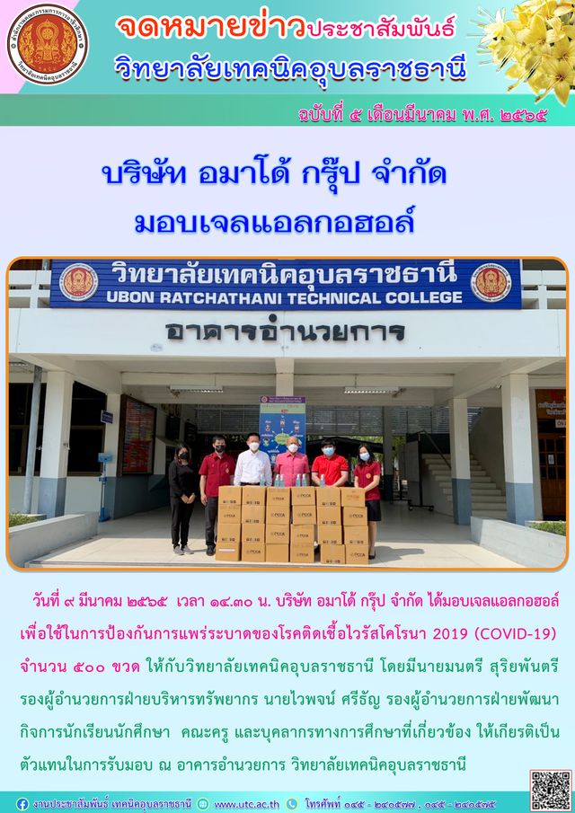 วันที่ ๙ มีนาคม ๒๕๖๕ เวลา ๑๔.๓๐ น. บริษัท อมาโด้ กรุ๊ป จำกัด ได้มอบเจลแอลกอฮอล์ เพื่อใช้ในการป้องกันการแพร่ระบาดของโรคติดเชื้อไวรัสโคโรนา 2019 (COVID-19) จำนวน ๕๐๐ ขวด ให้กับวิทยาลัยเทคนิคอุบลราชธานี โดยมีนายมนตรี สุริยพันตรี รองผู้อำนวยการฝ่ายบริหารทรัพยากร นายไวพจน์ ศรีธัญ รองผู้อำนวยการฝ่ายพัฒนากิจการนักเรียนนักศึกษา คณะครู และบุคลากรทางการศึกษาที่เกี่ยวข้อง ให้เกียรติเป็นตัวแทนในการรับมอบ ณ อาคารอำนวยการ วิทยาลัยเทคนิคอุบลราชธานี