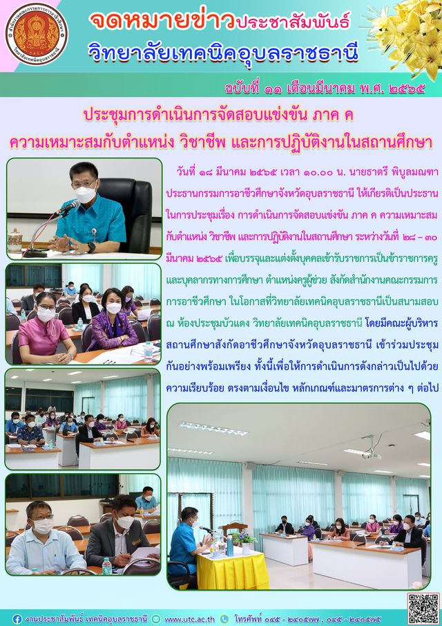 วันที่ ๑๘ มีนาคม ๒๕๖๕เวลา ๑๐.๐๐ น. นายธาตรี พิบูลมณฑา ประธานกรรมการอาชีวศึกษาจังหวัดอุบลราชธานี ให้เกียรติเป็นประธานในการประชุมเรื่อง การดำเนินการจัดสอบแข่งขัน ภาค ค ความเหมาะสมกับตำแหน่ง วิชาชีพ และการปฏิบัติงานในสถานศึกษา ระหว่างวันที่ ๒๘ – ๓๐ มีนาคม ๒๕๖๕ เพื่อบรรจุและแต่งตั้งบุคคลเข้ารับราชการเป็นข้าราชการครูและบุคลากรทางการศึกษา ตำแหน่งครูผู้ช่วย สังกัดสำนักงานคณะกรรมการการอาชีวศึกษา ในโอกาสที่วิทยาลัยเทคนิคอุบลราชธานีเป็นสนามสอบ ณ ห้องประชุมบัวแดง วิทยาลัยเทคนิคอุบลราชธานี โดยมีคณะผู้บริหารสถานศึกษาสังกัดอาชีวศึกษาจังหวัดอุบลราชธานี เข้าร่วมประชุมกันอย่างพร้อมเพรียง ทั้งนี้เพื่อให้การดำเนินการดังกล่าวเป็นไปด้วยความเรียบร้อย ตรงตามเงื่อนไข หลักเกณฑ์และมาตรการต่าง ๆ ต่อไป