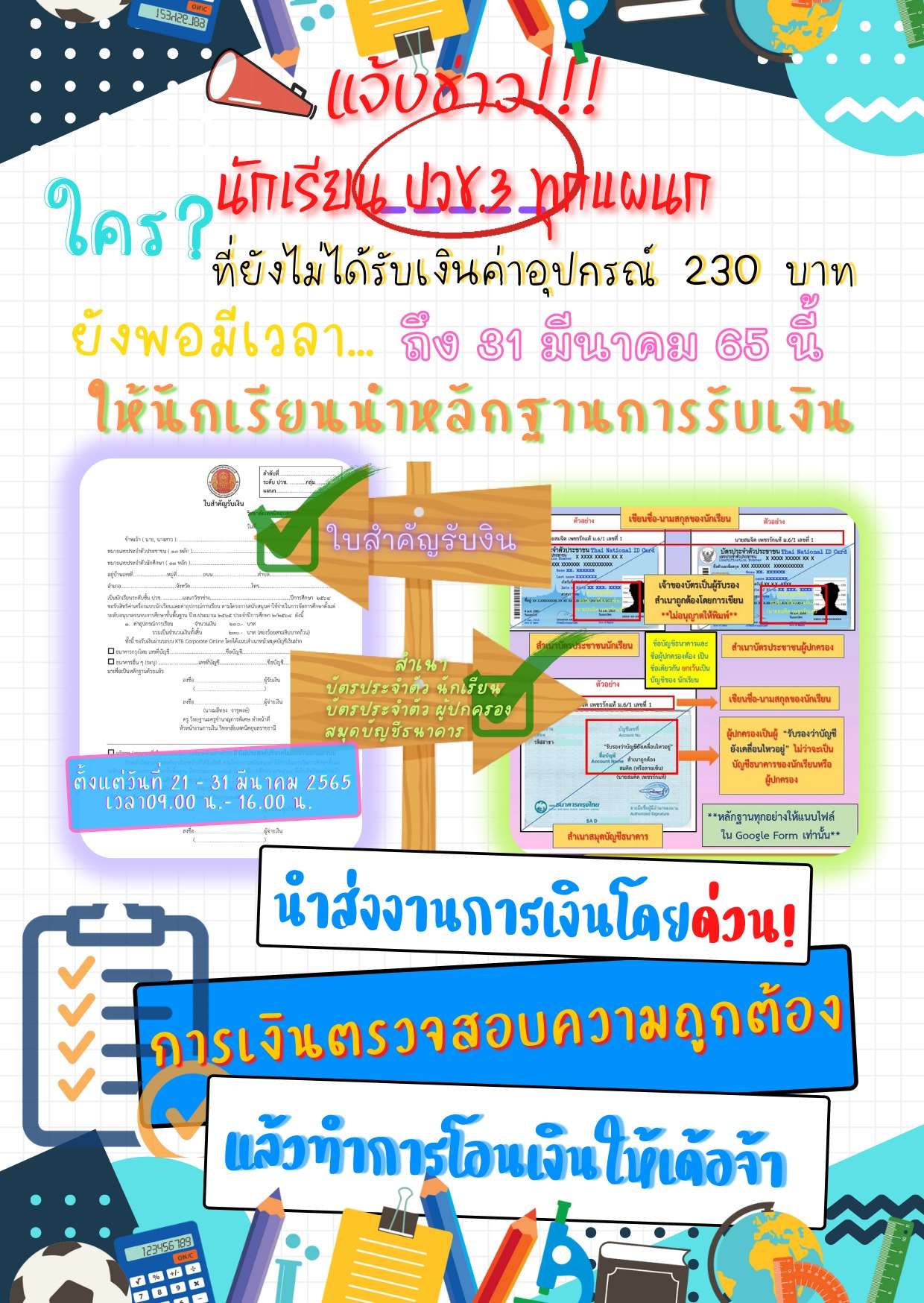 สำหรับ ปวช.3 ให้รีบดำเนินการส่งหลักฐานรับเงินค่าอุปกรณ์การเรียน ภายใน 31 มีนาคม 65