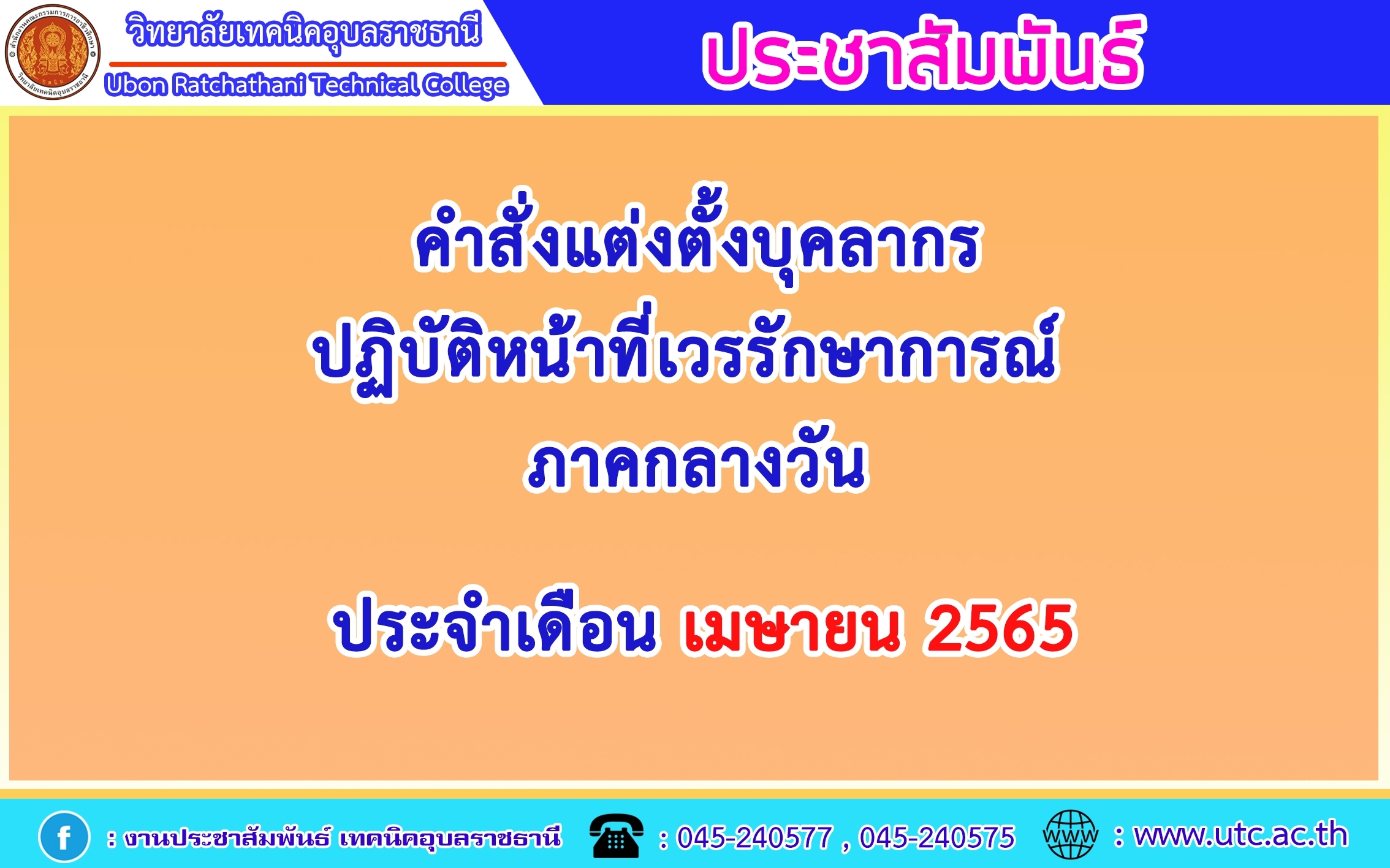 แต่งตั้งบุคคลากรในสังกัดปฏิบัติหน้าที่เวรรักษาการณ์ ภาคกลางวัน ประจำเดือนเมษายน 2565