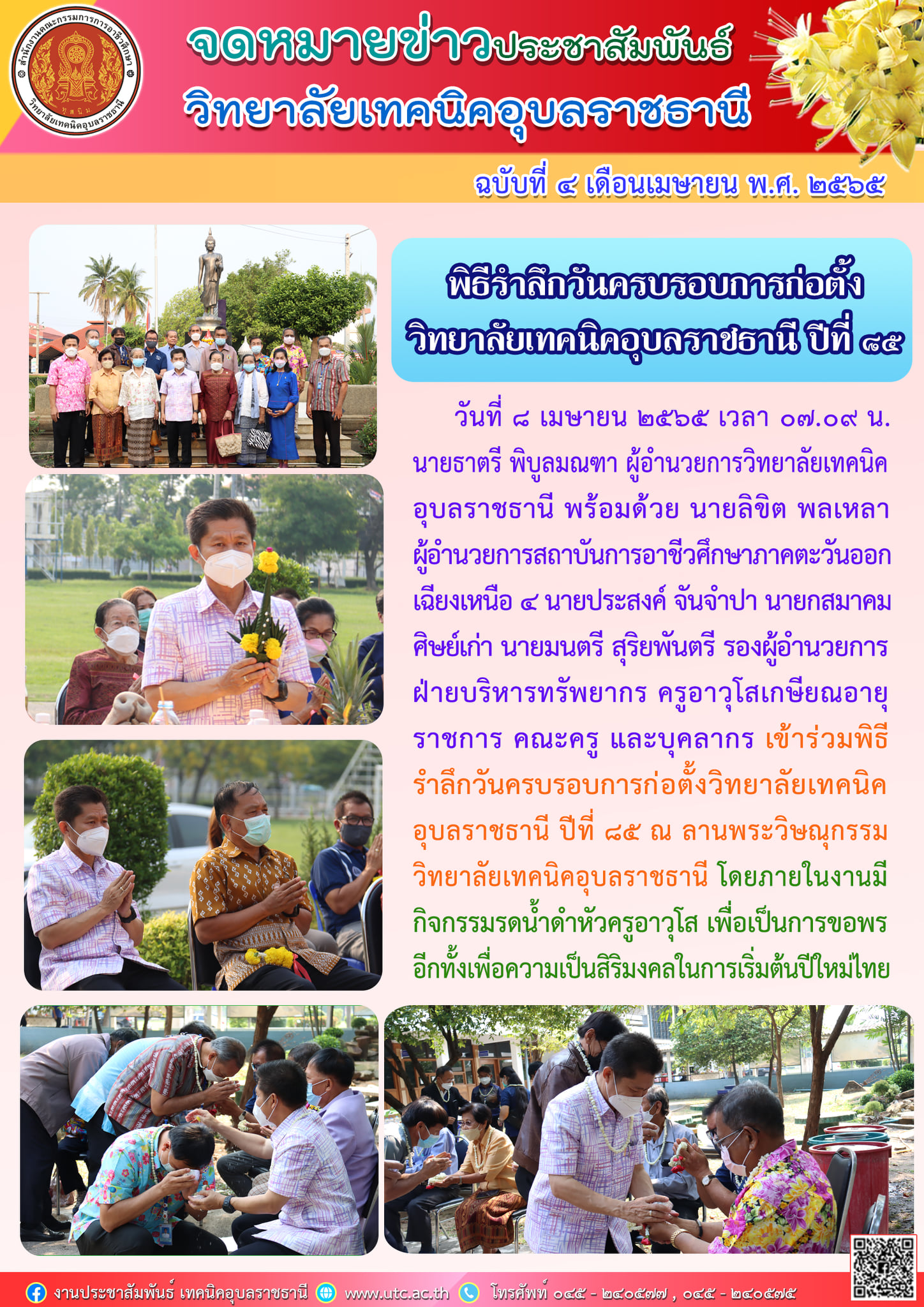 วันที่ ๘ เมษายน ๒๕๖๕ เวลา ๐๗.๐๙ น. นายธาตรี พิบูลมณฑา ผู้อำนวยการวิทยาลัยเทคนิคอุบลราชธานีพร้อมด้วย นายลิขิต พลเหลาผู้อำนวยการสถาบันการอาชีวศึกษาภาคตะวันออกเฉียงเหนือ ๔ นายประสงค์ จันจำปา นายกสมาคมศิษย์เก่า นายมนตรี สุริยพันตรี รองผู้อำนวยการฝ่ายบริหารทรัพยากร ครูอาวุโสเกษียณอายุราชการ คณะครู และบุคลากร เข้าร่วมพิธีรำลึกวันครบรอบการก่อตั้งวิทยาลัยเทคนิคอุบลราชธานี ปีที่ ๘๕ ณ ลานพระวิษณุกรรม วิทยาลัยเทคนิคอุบลราชธานี โดยภายในงานมีกิจกรรมรดน้ำดำหัวครูอาวุโส เพื่อเป็นการขอพร อีกทั้งเพื่อความเป็นสิริมงคลในการเริ่มต้นปีใหม่ไทย
