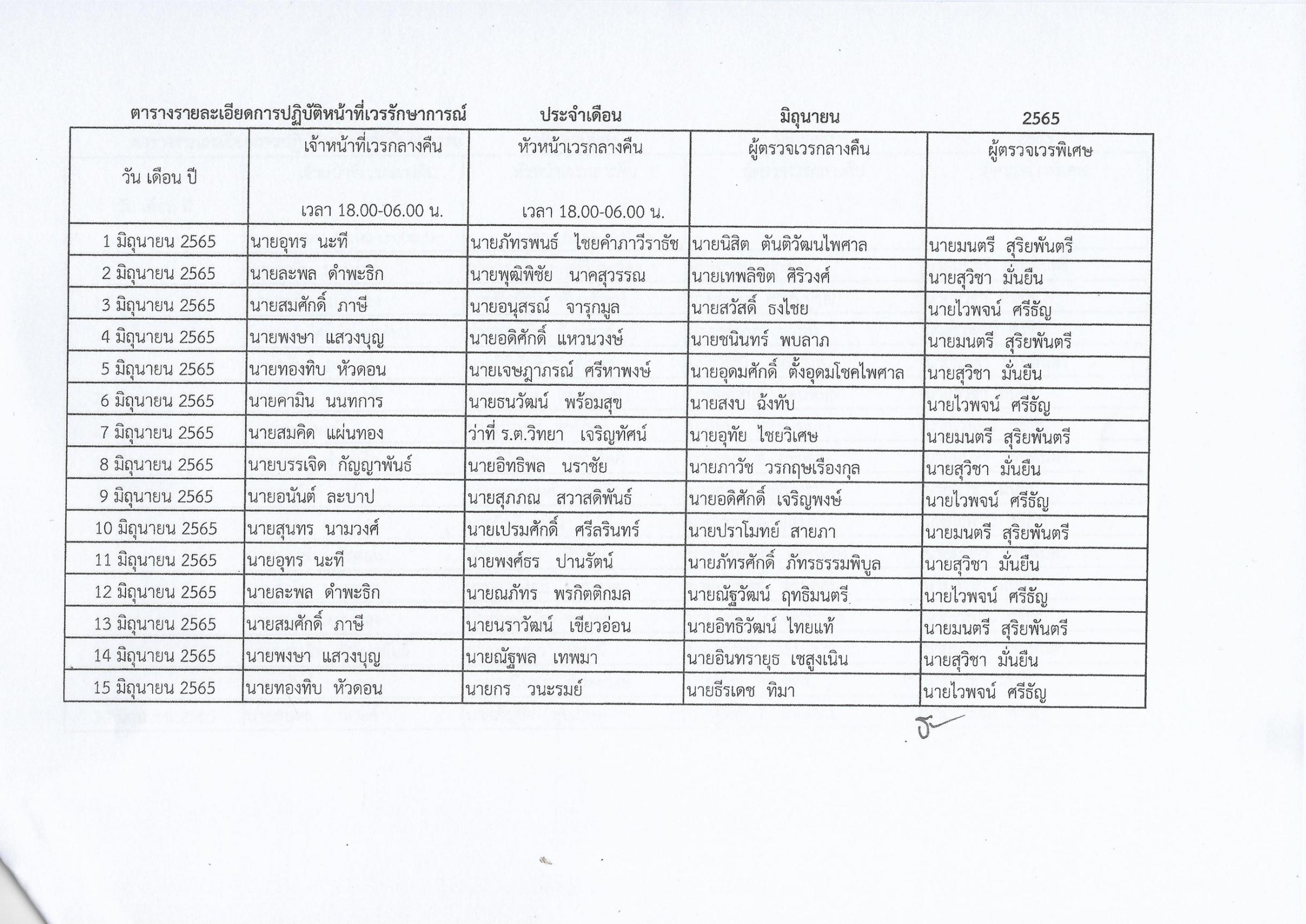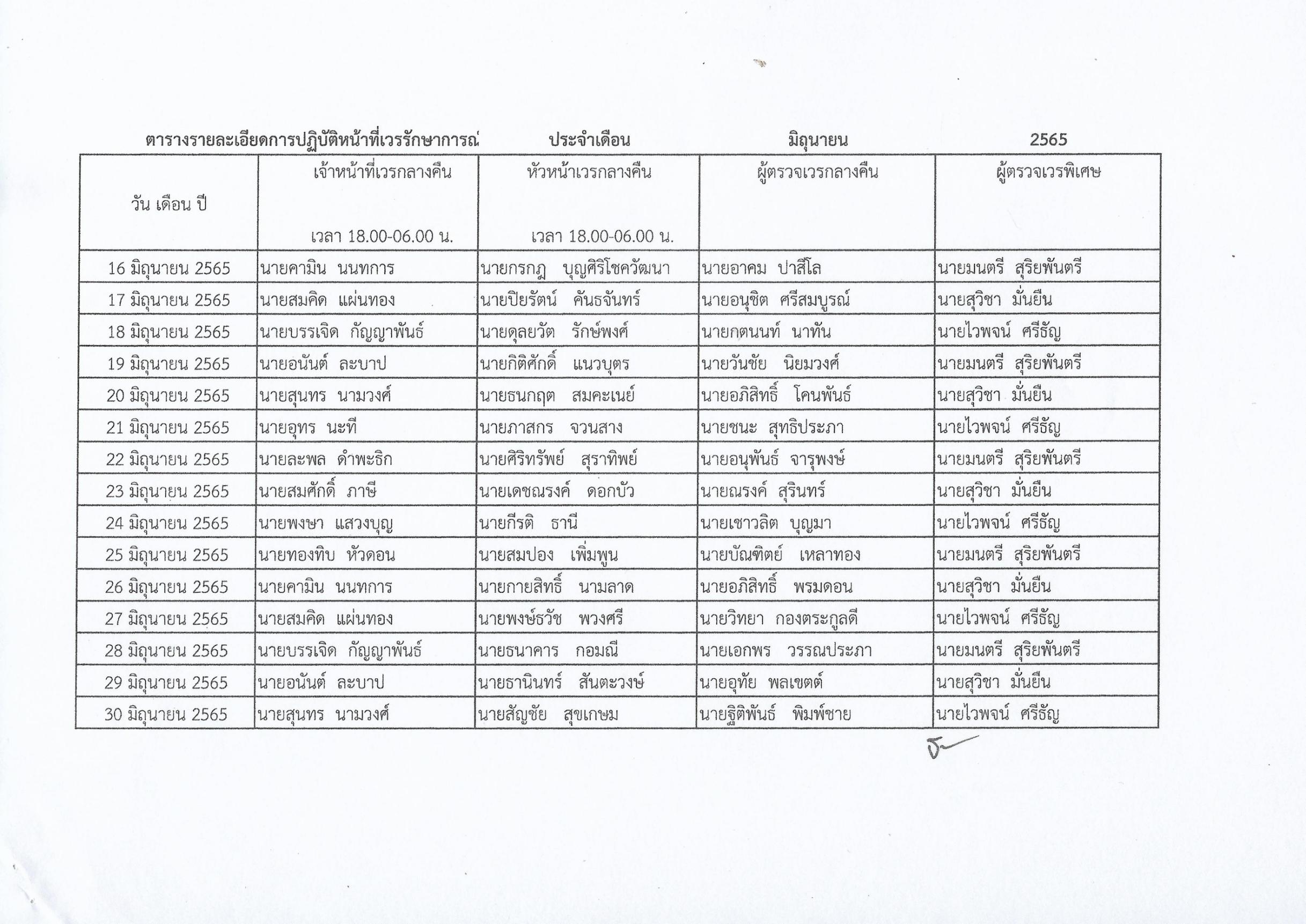 แต่งตั้งบุคคลากรในสังกัดปฏิบัติหน้าที่เวรรักษาการณ์ ภาคกลางวัน ประจำเดือนมิถนายน 2565