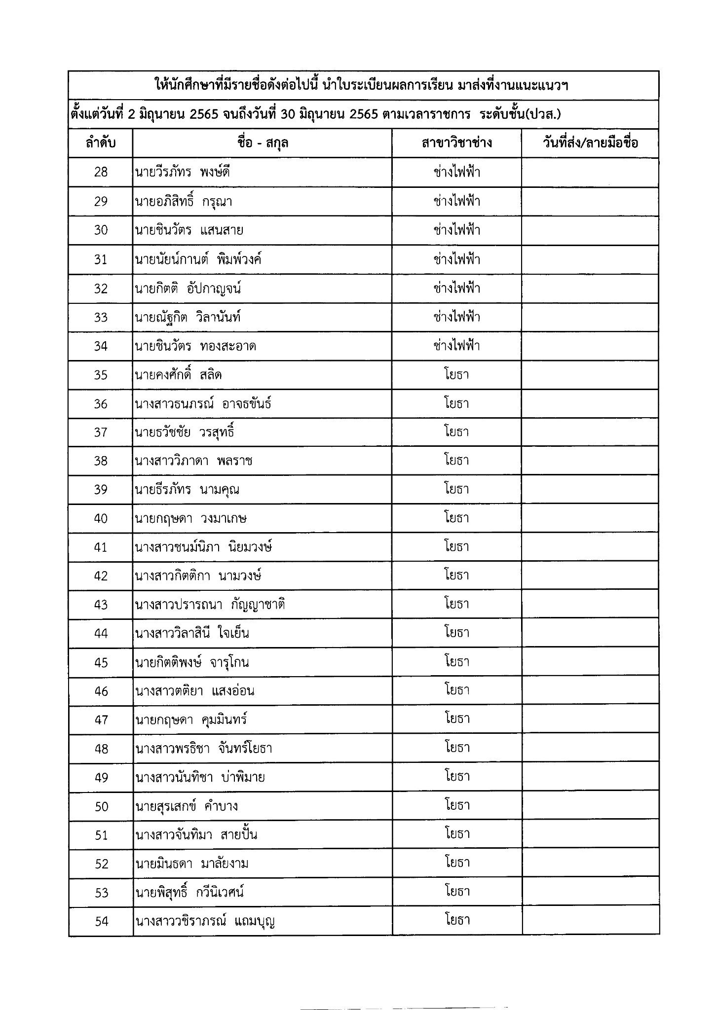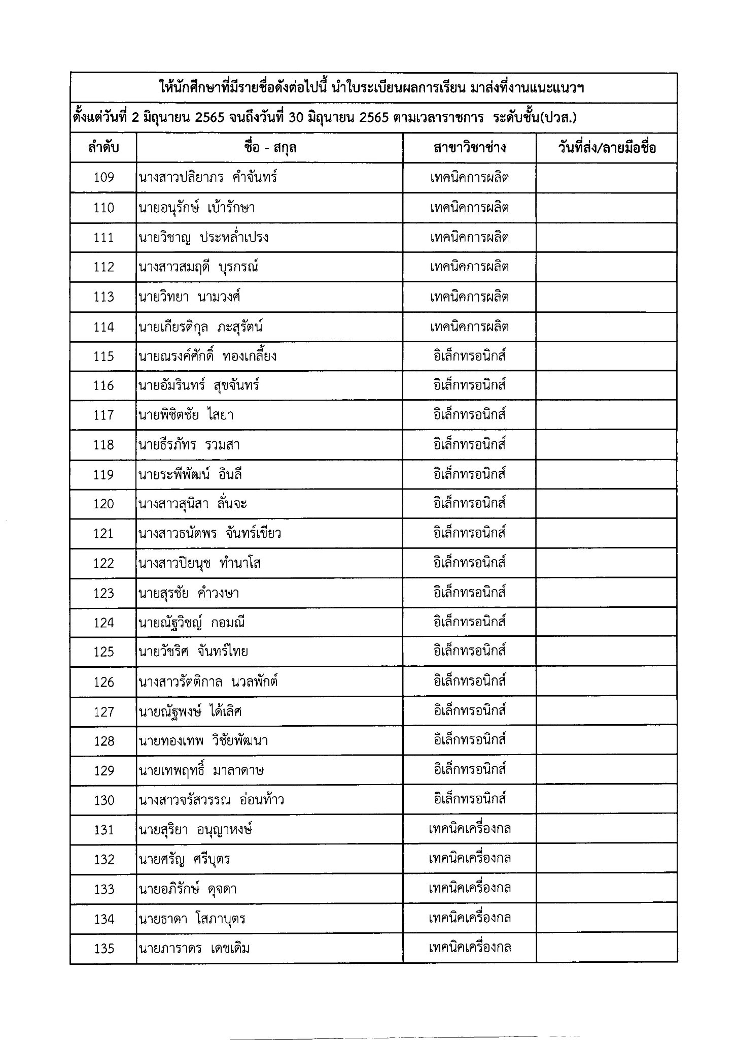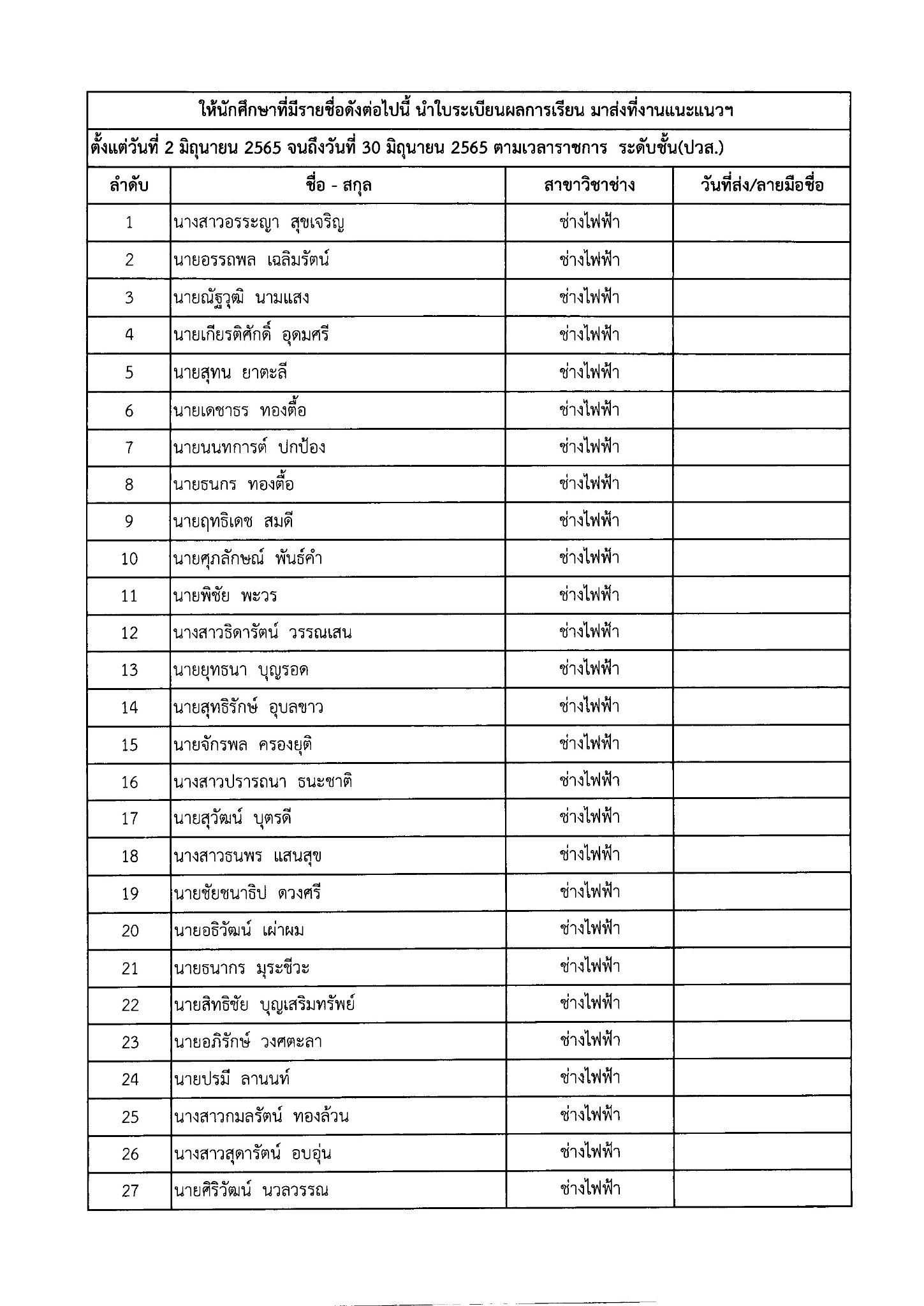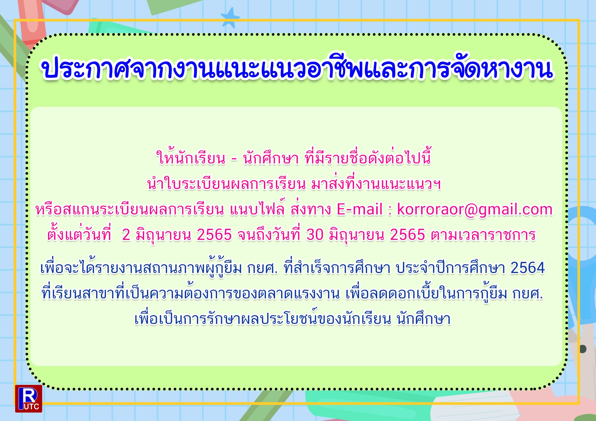 ให้นักเรียน – นักศึกษา ที่มีรายชื่อดังต่อไปนี้ นำใบระเบียนผลการเรียน มาส่งที่งานแนะแนวฯ หรือสแกนระเบียนผลการเรียน แนบไฟล์ ส่งทาง