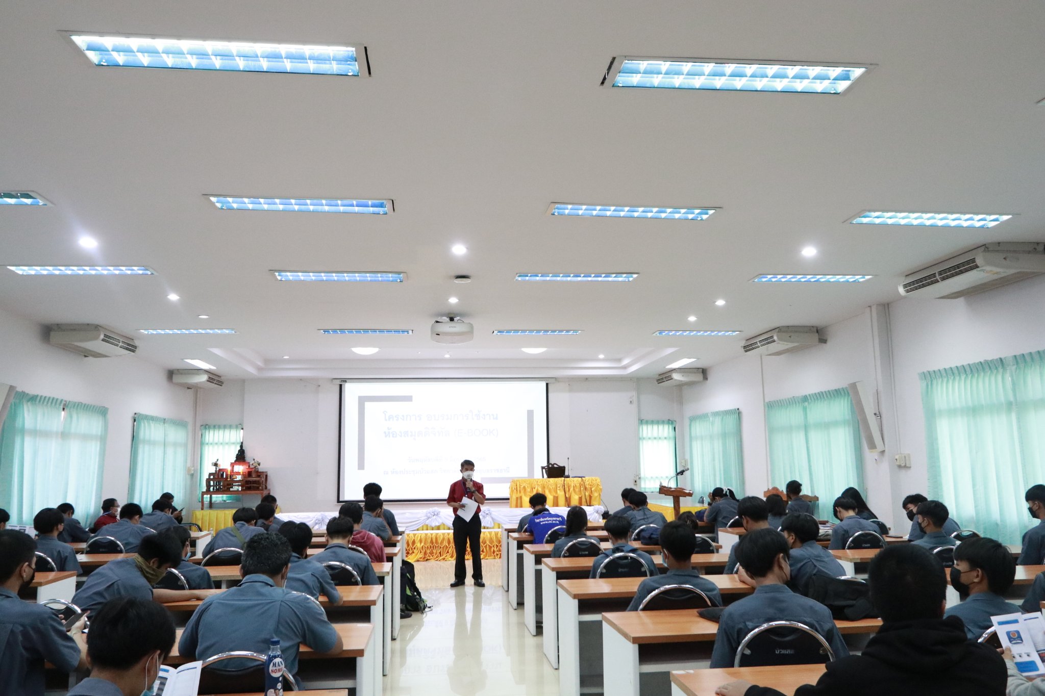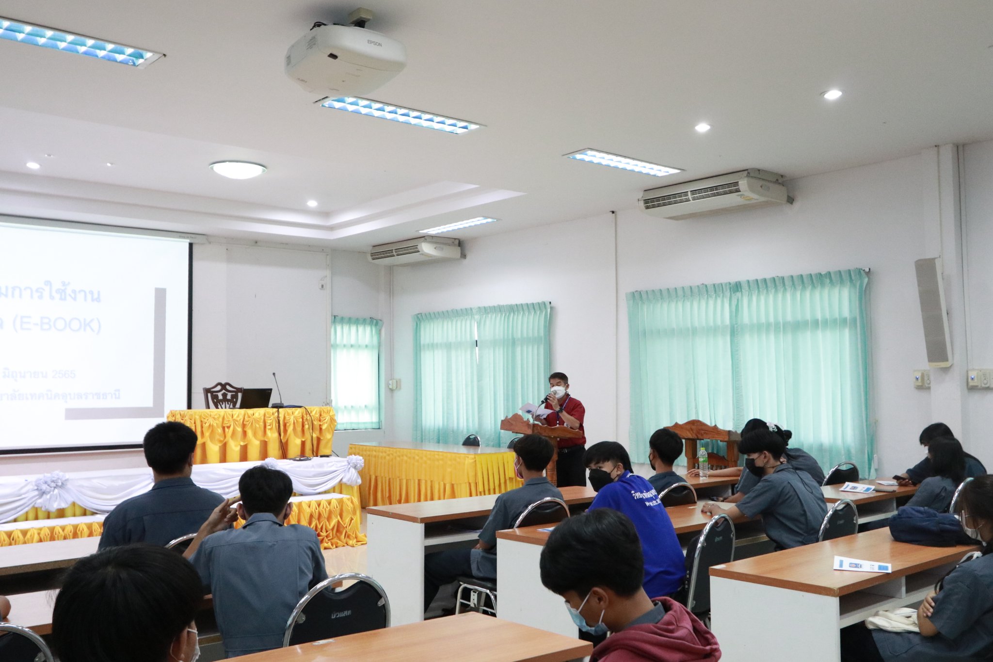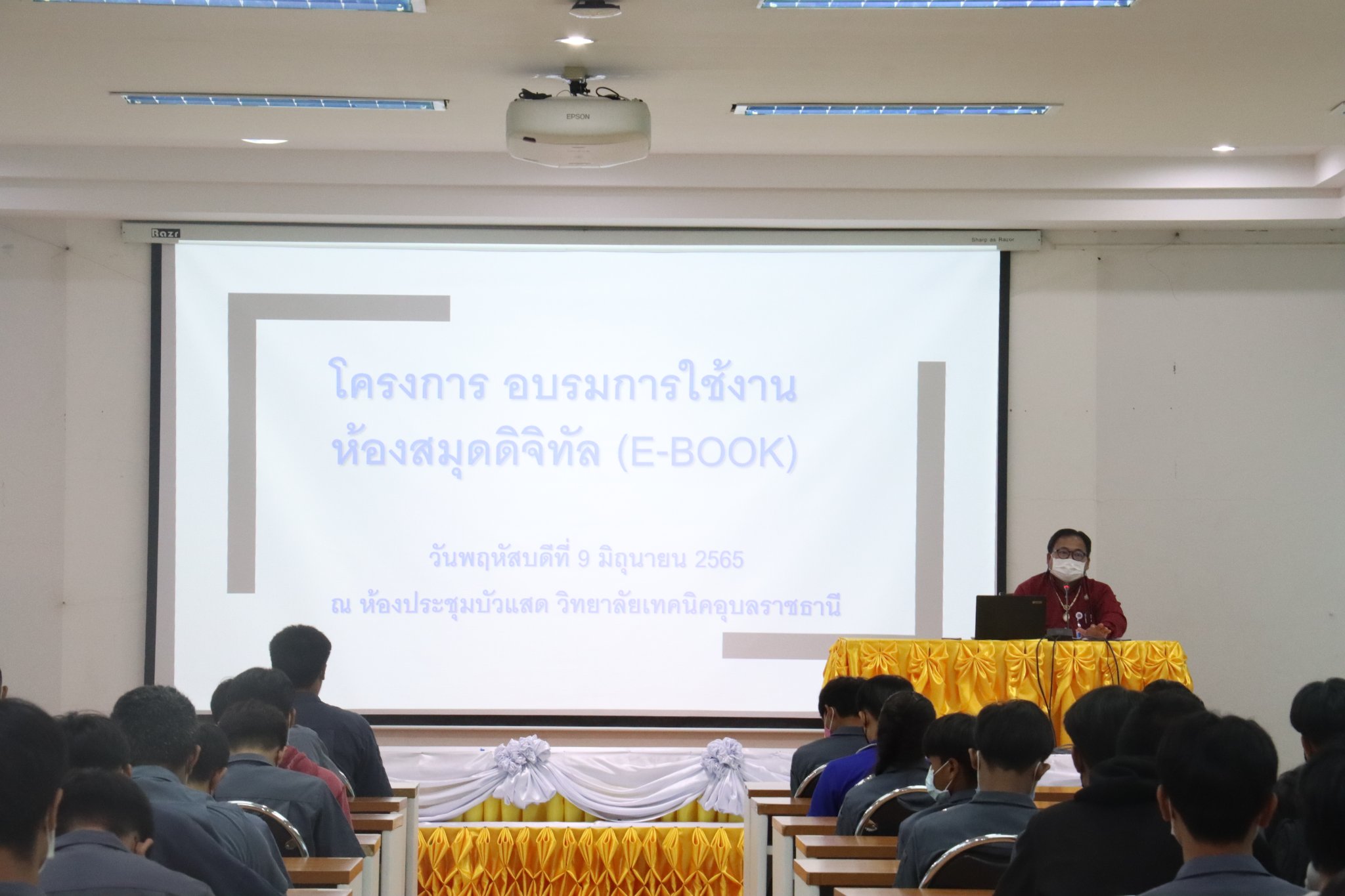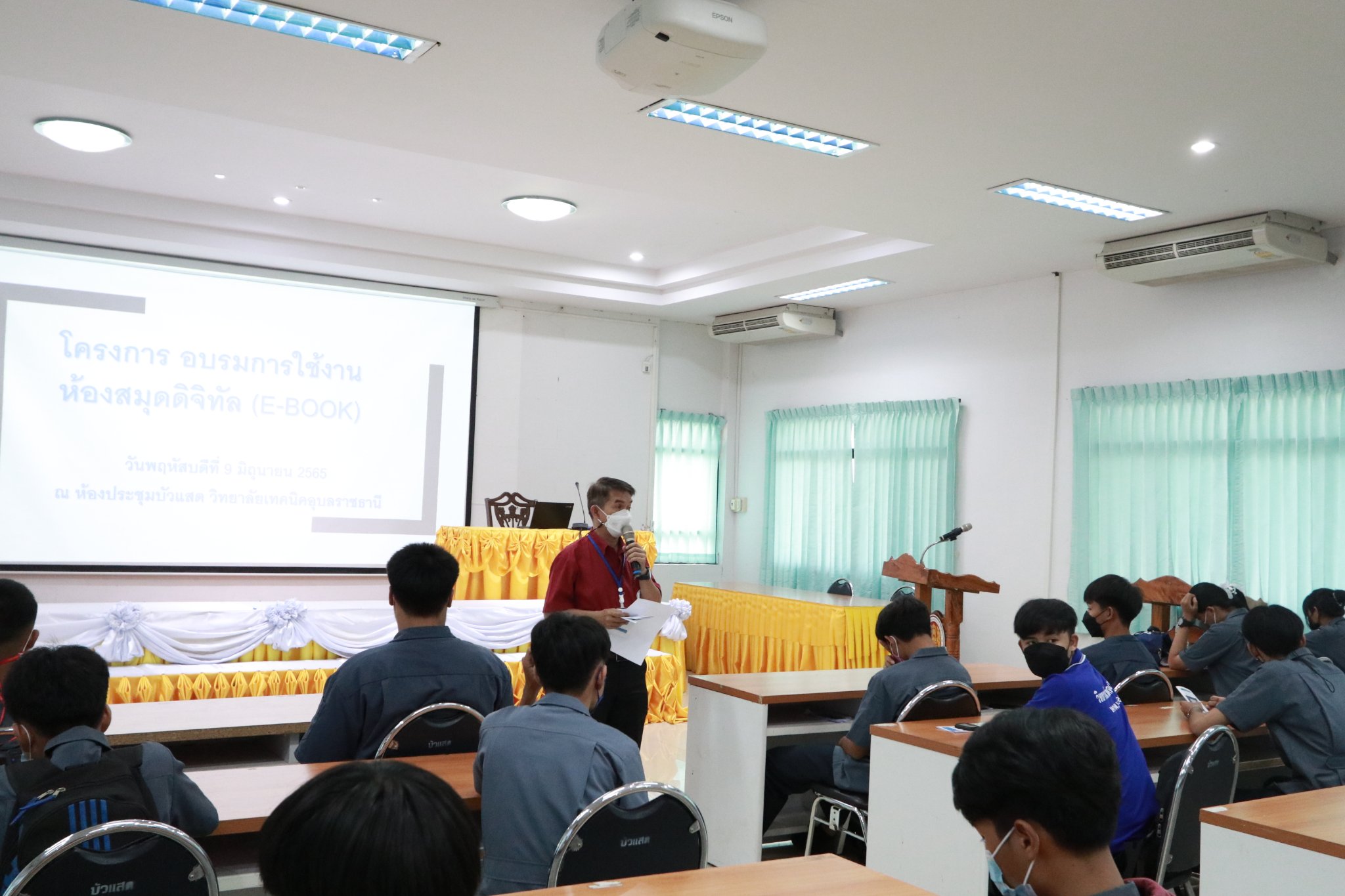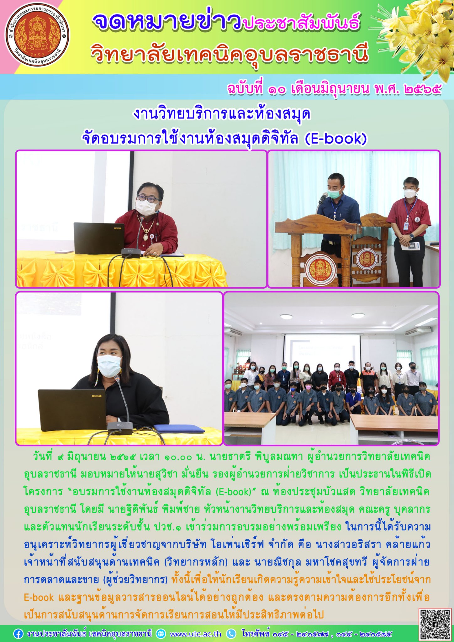 วันที่ ๙ มิถุนายน ๒๕๖๕ เวลา ๑๐.๐๐ น. นายธาตรี พิบูลมณฑาผู้อำนวยการวิทยาลัยเทคนิคอุบลราชธานี มอบหมายให้นายสุวิชา มั่นยืน รองผู้อำนวยการฝ่ายวิชาการ เป็นประธานในพิธีเปิดโครงการ “อบรมการใช้งานห้องสมุดดิจิทัล (E-book)” ณ ห้องประชุมบัวแสด วิทยาลัยเทคนิคอุบลราชธานี โดยมี นายฐิติพันธ์ พิมพ์ชาย หัวหน้างานวิทยบริการและห้องสมุด คณะครู บุคลากร และตัวแทนนักเรียนระดับชั้น ปวช.๑ เข้าร่วมการอบรมอย่างพร้อมเพรียง ในการนี้ได้รับความอนุเคราะห์วิทยากรผู้เชี่ยวชาญจากบริษัท โอเพ่นเซิร์ฟ จำกัด คือ นางสาวอริสรา คล้ายแก้ว เจ้าหน้าที่สนับสนุนด้านเทคนิค (วิทยากรหลัก) และ นายณิชกุล มหาโชคสุขทวี ผู้จัดการฝ่ายการตลาดและขาย (ผู้ช่วยวิทยากร) ทั้งนี้เพื่อให้นักเรียนเกิดความรู้ความเข้าใจและใช้ประโยชน์จาก E-book และฐานข้อมูลวารสารออนไลน์ได้อย่างถูกต้อง และตรงตามความต้องการอีกทั้งเพื่อเป็นการสนับสนุนด้านการจัดการเรียนการสอนให้มีประสิทธิภาพต่อไป