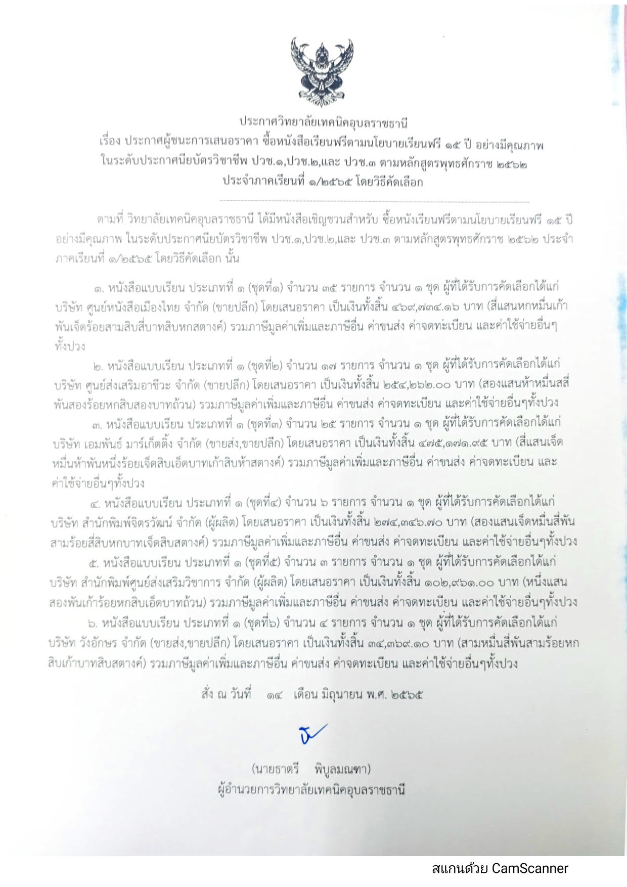 ประกาศผู้ชนะการเสอนราคา ซื้อหนังสือเรียนฟรีตามนโยบายเรียนฟรี 15 ปี อย่างมีคุณภาพ ในระดับประกาศนียบัตรวิชาชีพ ปวช.1,ปวช.2, และ ปวช.3 ตามหลักสูตรพุทธศัพราช 2562 ประจำภาคเรียนที่ 1/2565 โดยวิธีคัดเลือก