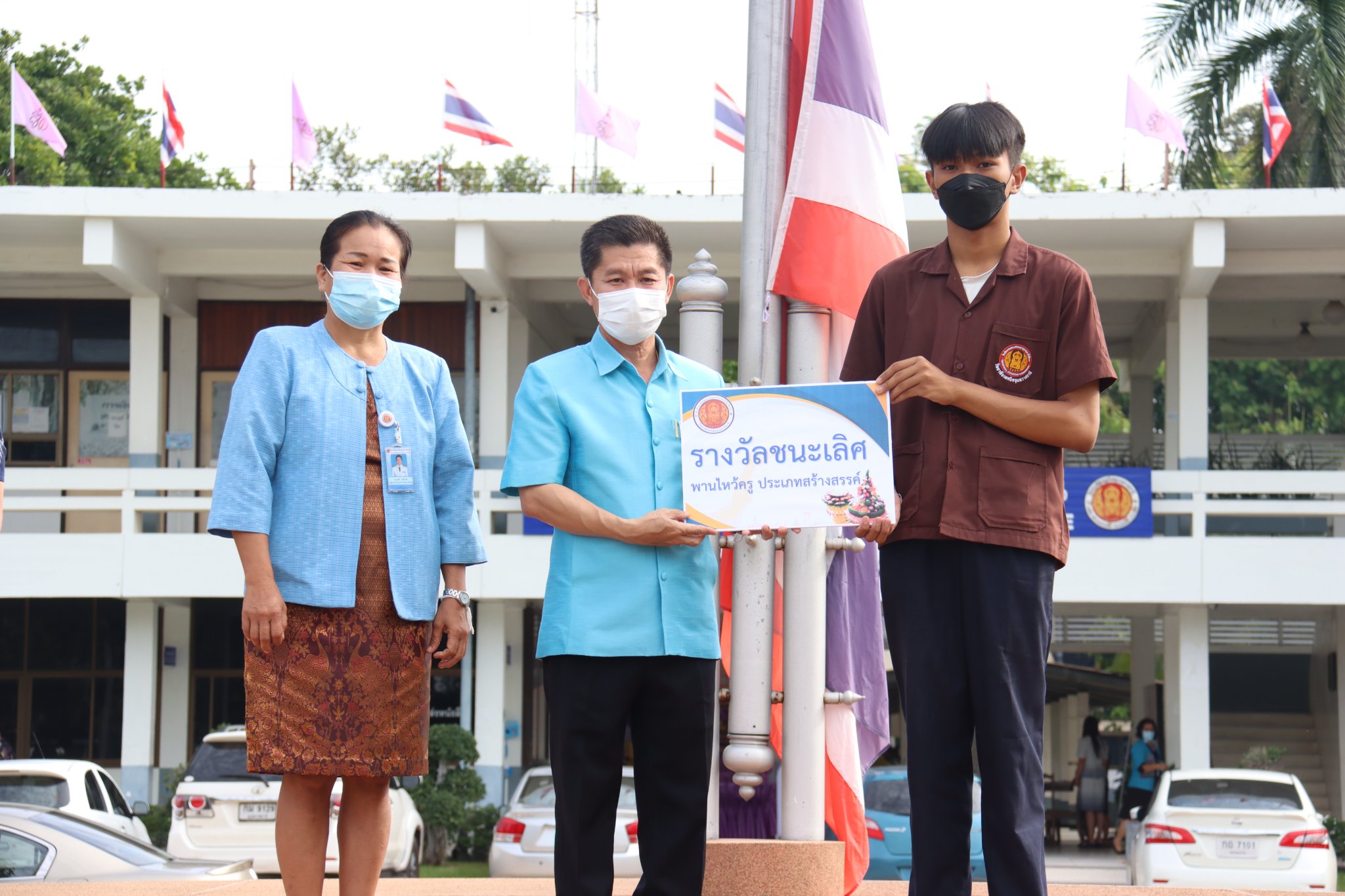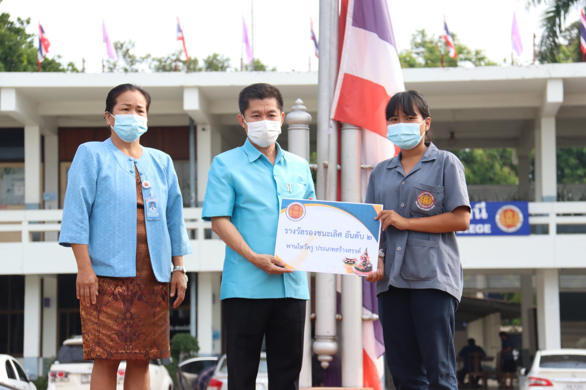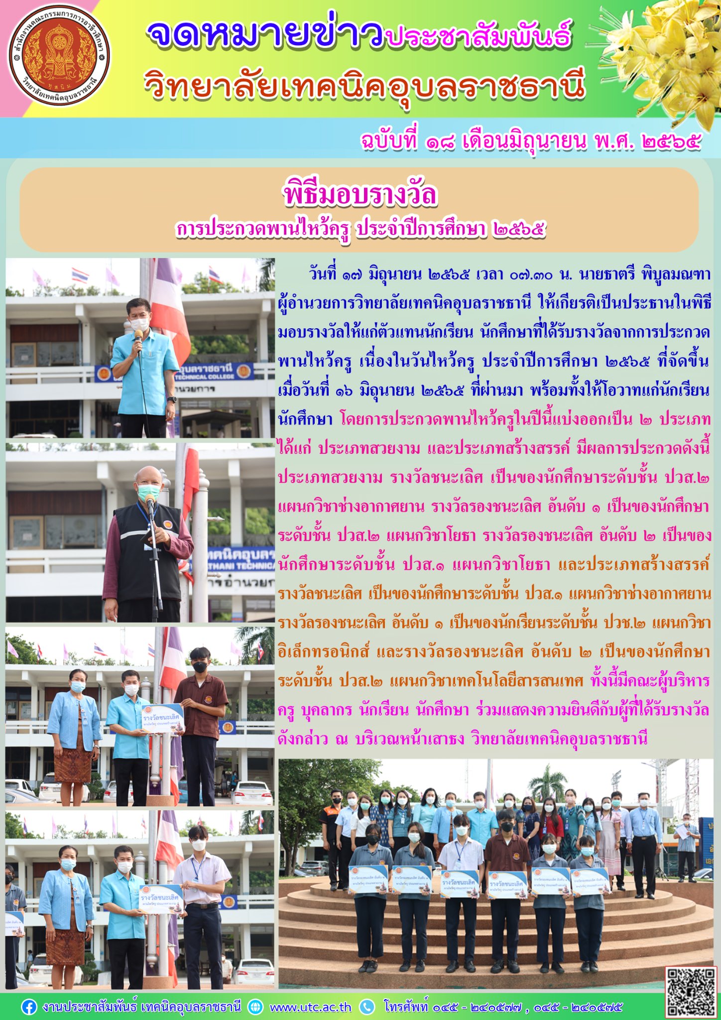 วันที่ ๑๗ มิถุนายน ๒๕๖๕ เวลา ๐๗.๓๐ น. นายธาตรี พิบูลมณฑา ผู้อำนวยการวิทยาลัยเทคนิคอุบลราชธานีให้เกียรติเป็นประธานในพิธีมอบรางวัลให้แก่ตัวแทนนักเรียน นักศึกษาที่ได้รับรางวัลจากการประกวดพานไหว้ครู เนื่องในวันไหว้ครู ประจำปีการศึกษา ๒๕๖๕ ที่จัดขึ้นเมื่อวันที่ ๑๖ มิถุนายน ๒๕๖๕ ที่ผ่านมา พร้อมทั้งให้โอวาทแก่นักเรียนนักศึกษา โดยการประกวดพานไหว้ครูในปีนี้แบ่งออกเป็น ๒ ประเภท ได้แก่ ประเภทสวยงาม และประเภทสร้างสรรค์ มีผลการประกวดดังนี้ประเภทสวยงาม รางวัลชนะเลิศ เป็นของนักศึกษาระดับชั้น ปวส.๒ แผนกวิชาช่างอากาศยาน รางวัลรองชนะเลิศ อันดับ ๑ เป็นของนักศึกษาระดับชั้น ปวส.๒ แผนกวิชาโยธา รางวัลรองชนะเลิศ อันดับ ๒ เป็นของนักศึกษาระดับชั้น ปวส.๑ แผนกวิชาโยธา และประเภทสร้างสรรค์ รางวัลชนะเลิศ เป็นของนักศึกษาระดับชั้น ปวส.๑ แผนกวิชาช่างอากาศยานรางวัลรองชนะเลิศ อันดับ ๑ เป็นของนักเรียนระดับชั้น ปวช.๒ แผนกวิชาอิเล็กทรอนิกส์ และรางวัลรองชนะเลิศ อันดับ ๒ เป็นของนักศึกษาระดับชั้น ปวส.๒ แผนกวิชาเทคโนโลยีสารสนเทศ ทั้งนี้มีคณะผู้บริหารครู บุคลากร นักเรียน นักศึกษา ร่วมแสดงความยินดีกับผู้ที่ได้รับรางวัลดังกล่าว ณ บริเวณหน้าเสาธง วิทยาลัยเทคนิคอุบลราชธานี
