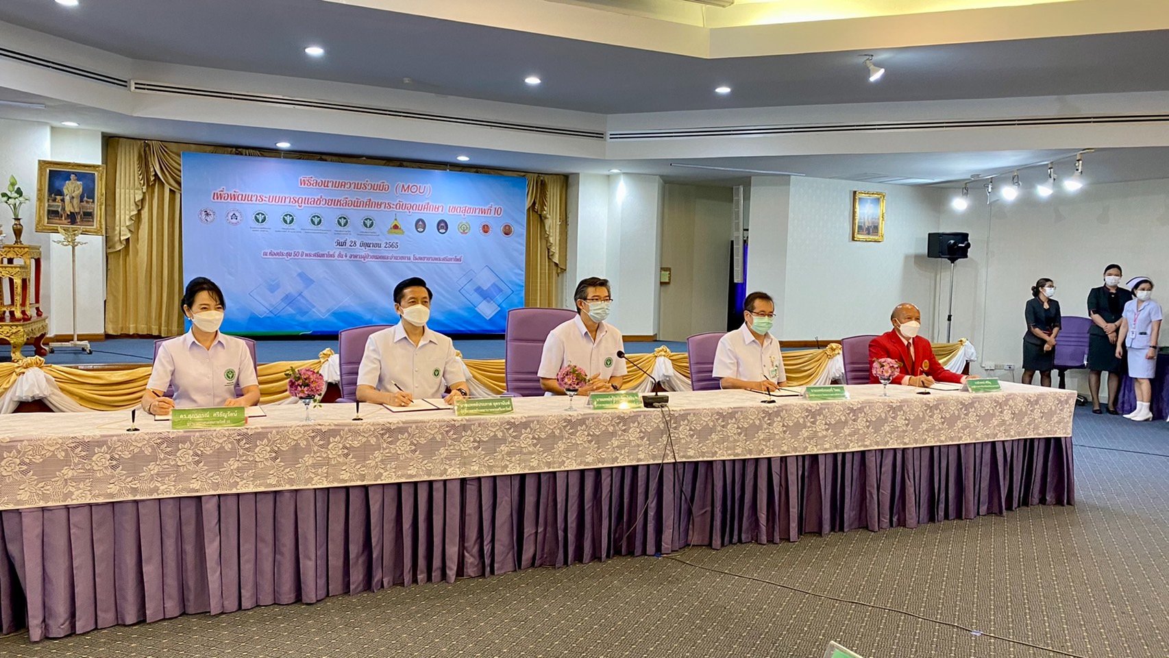 วันที่ ๒๘ มิถุนายน ๒๕๖๕ เวลา ๐๘.๐๐ น. นายธาตรี พิบูลมณฑาผู้อำนวยการวิทยาลัยเทคนิคอุบลราชธานี มอบหมายให้ นายไวพจน์ ศรีธัญ รองผู้อำนวยการฝ่ายพัฒนากิจการนักเรียนนักศึกษา พร้อมด้วย ว่าที่ร้อยตรี กรีฑาวุฒิ ทนงจิตร หัวหน้างานความร่วมมือ นำคณะครู และบุคลากรที่เกี่ยวข้อง เข้าร่วมพิธีลงนามบันทึกความร่วมมือ (MOU) เพื่อพัฒนาระบบการดูแลช่วยเหลือนักศึกษาระดับอุดมศึกษาเขตสุขภาพที่ ๑๐ ณ ห้องประชุม ๕๐ ปี ชั้น ๔ โรงพยาบาลพระศรีมหาโพธิ์ อำเภอเมือง จังหวัดอุบลราชธานี โดยมี นายแพทย์ทวีศิลป์ วิษณุโยธิน ผู้ตรวจราชการกระทรวงสาธารณสุข เขตสุขภาที่ ๑๐ เป็นประธานในพิธีเปิด ทั้งนี้เพื่อสร้างเครือข่ายในการดูแลสุขภาพจิตและพัฒนาระบบดูแลช่วยเหลือนักศึกษาระหว่างหน่วยงานสังกัดกรมสุขภาพจิตโรงพยาบาลคู่เครือข่าย และวิทยาลัยต่อไป