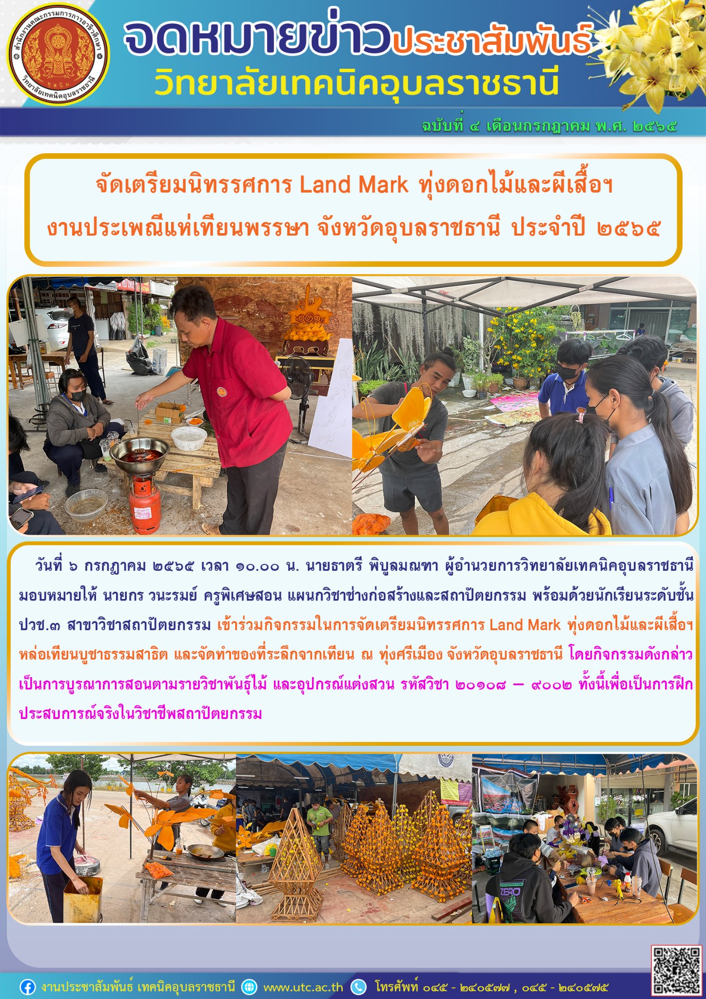 วันที่ ๖ กรกฎาคม ๒๕๖๕เวลา ๑๐.๐๐ น. นายธาตรี พิบูลมณฑา ผู้อำนวยการวิทยาลัยเทคนิคอุบลราชธานี มอบหมายให้ นายกร วนะรมย์ ครูพิเศษสอน แผนกวิชาช่างก่อสร้างและสถาปัตยกรรม พร้อมด้วยนักเรียนระดับชั้น ปวช.๓ สาขาวิชาสถาปัตยกรรม เข้าร่วมกิจกรรมในการจัดเตรียมนิทรรศการ Land Mark ทุ่งดอกไม้และผีเสือ หล่อเทียนบูชาธรรมสาธิต และจัดทำของที่ระลึกจากเทียน ณ ทุ่งศรีเมือง จังหวัดอุบลราชธานี โดยกิจกรรมดังกล่าวเป็นการบูรณาการสอนตามรายวิชาพันธุ์ไม้ และอุปกรณ์แต่งสวน รหัสวิชา ๒๐๑๐๘ – ๙๐๐๒ ทั้งนี้เพื่อเป็นการฝึกประสบการณ์จริงในวิชาชีพสถาปัตยกรรม