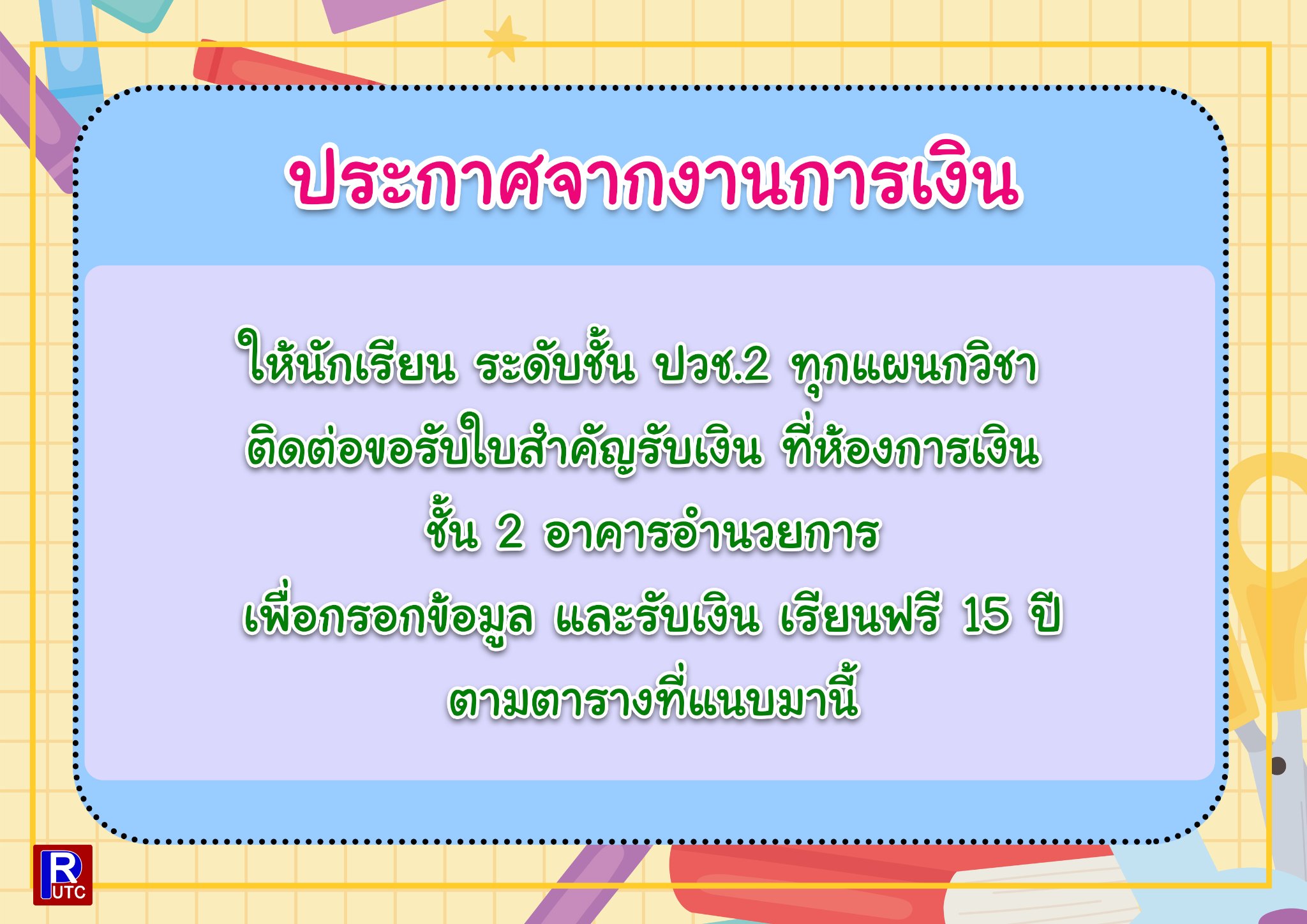 ประกาศให้นักเรียน ระดับชั้น ปวช.2 ทุกแผนกวิชา ติดต่อขอรับใบสำคัญรับเงิน ที่ห้องการเงิน ชั้น 2 อาคารอำนวยการ และรับเงิน เรียนฟรี 15 ปี