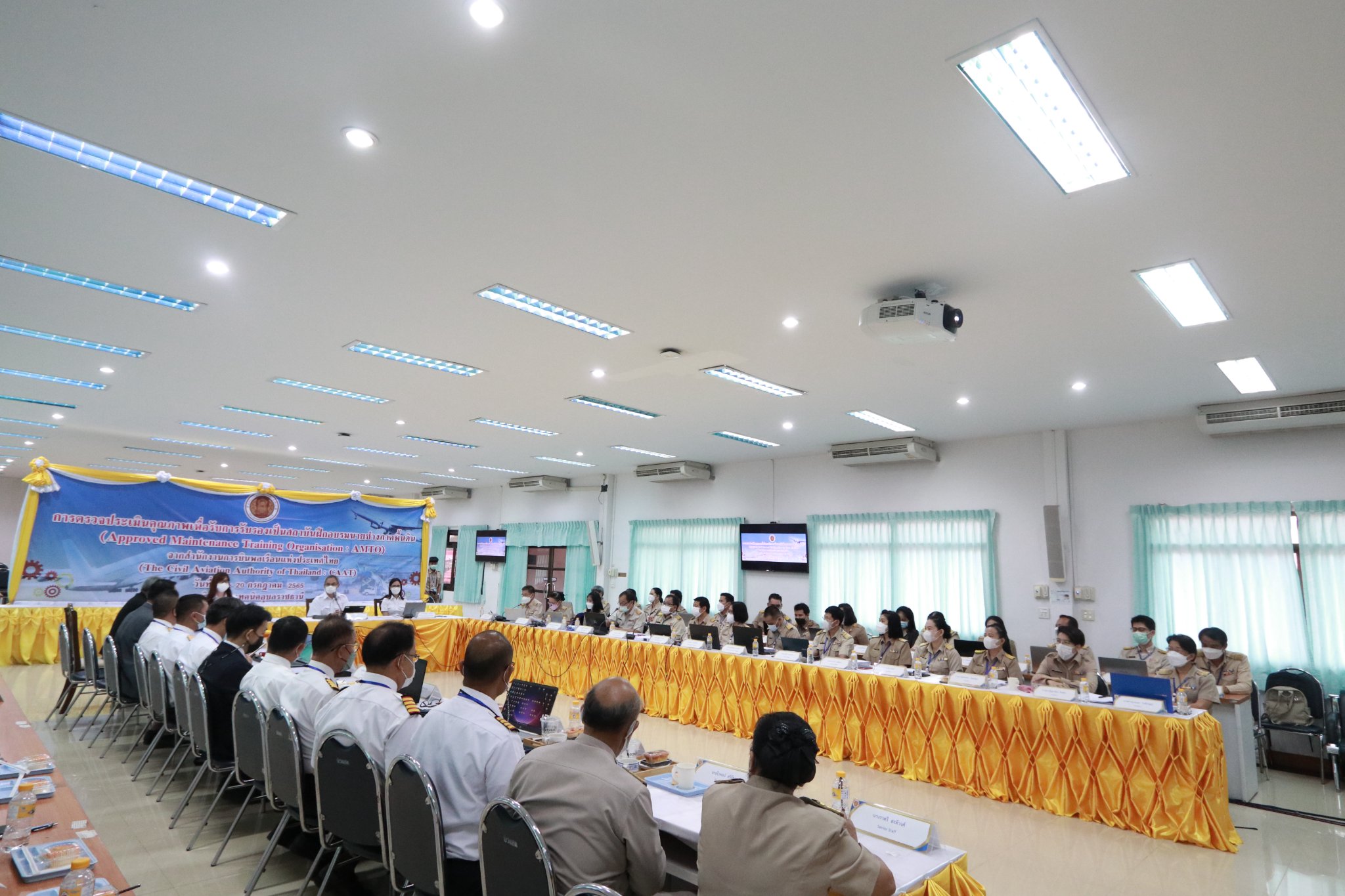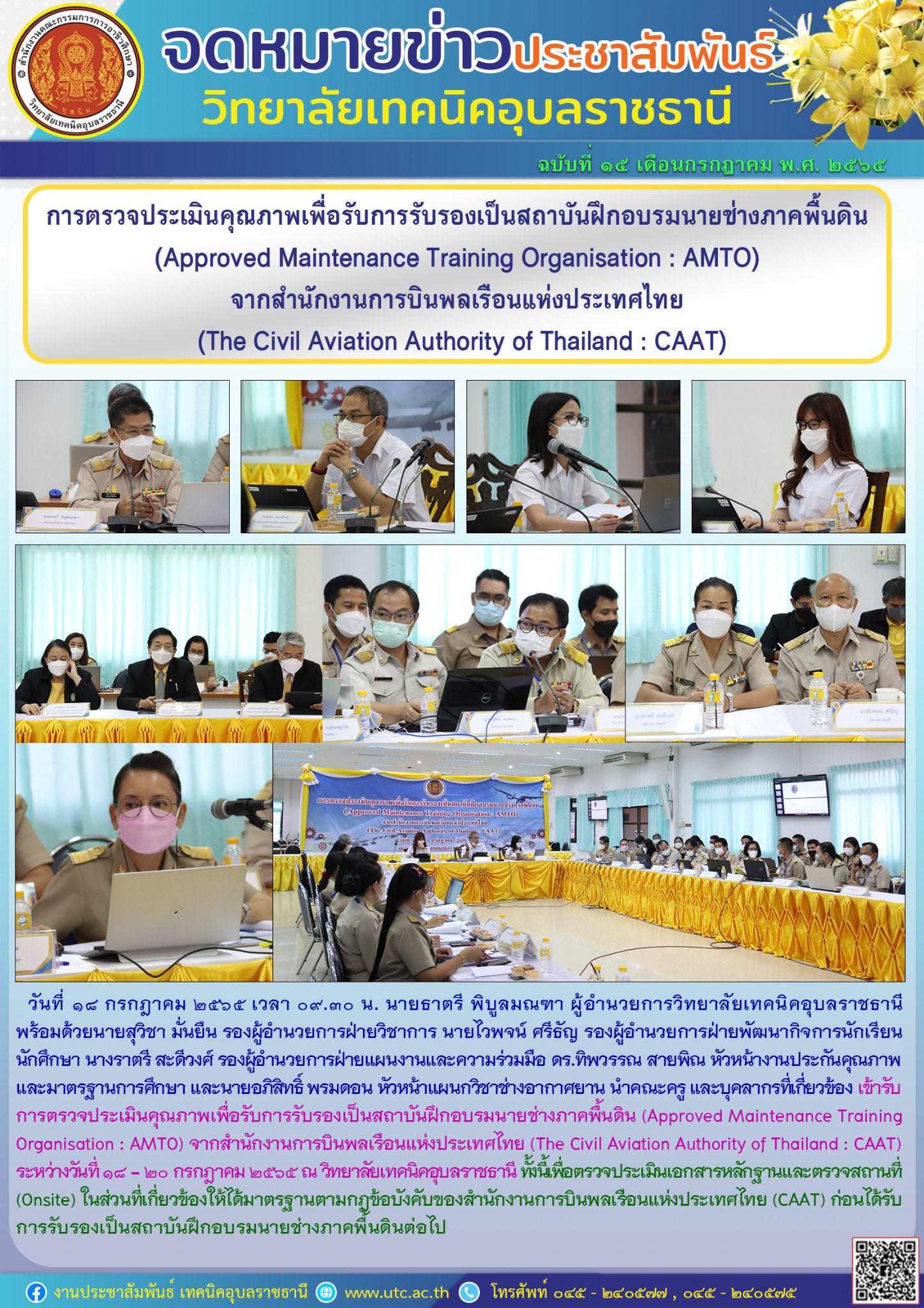 วันที่ ๑๘ กรกฎาคม ๒๕๖๕ เวลา ๐๙.๓๐ น. นายธาตรี พิบูลมณฑา ผู้อำนวยการวิทยาลัยเทคนิคอุบลราชธานี พร้อมด้วยนายสุวิชา มั่นยืน รองผู้อำนวยการฝ่ายวิชาการ นายไวพจน์ ศรีธัญ รองผู้อำนวยการฝ่ายพัฒนากิจการนักเรียนนักศึกษา นางราตรี สะดีวงศ์ รองผู้อำนวยการฝ่ายแผนงานและความร่วมมือ ดร.ทิพวรรณ สายพิณ หัวหน้างานประกันคุณภาพและมาตรฐานการศึกษา และนายอภิสิทธิ์ พรมดอน หัวหน้าแผนกวิชาช่างอากาศยาน นำคณะครู และบุคลากรที่เกี่ยวข้อง เข้ารับการตรวจประเมินคุณภาพเพื่อรับการรับรองเป็นสถาบันฝึกอบรมนายช่างภาคพื้นดิน (Approved Maintenance Training Organisation : AMTO) จากสำนักงานการบินพลเรือนแห่งประเทศไทย (The Civil Aviation Authority of Thailand : CAAT) ระหว่างวันที่ ๑๘ – ๒๐ กรกฎาคม ๒๕๖๕ ณ วิทยาลัยเทคนิคอุบลราชธานี ทั้งนี้เพื่อตรวจประเมินเอกสารหลักฐานและตรวจสถานที่ (Onsite) ในส่วนที่เกี่ยวข้องให้ได้มาตรฐานตามกฎข้อบังคับของสำนักงานการบินพลเรือนแห่งประเทศไทย (CAAT) ก่อนได้รับการรับรองเป็นสถาบันฝึกอบรมนายช่างภาคพื้นดินต่อไป