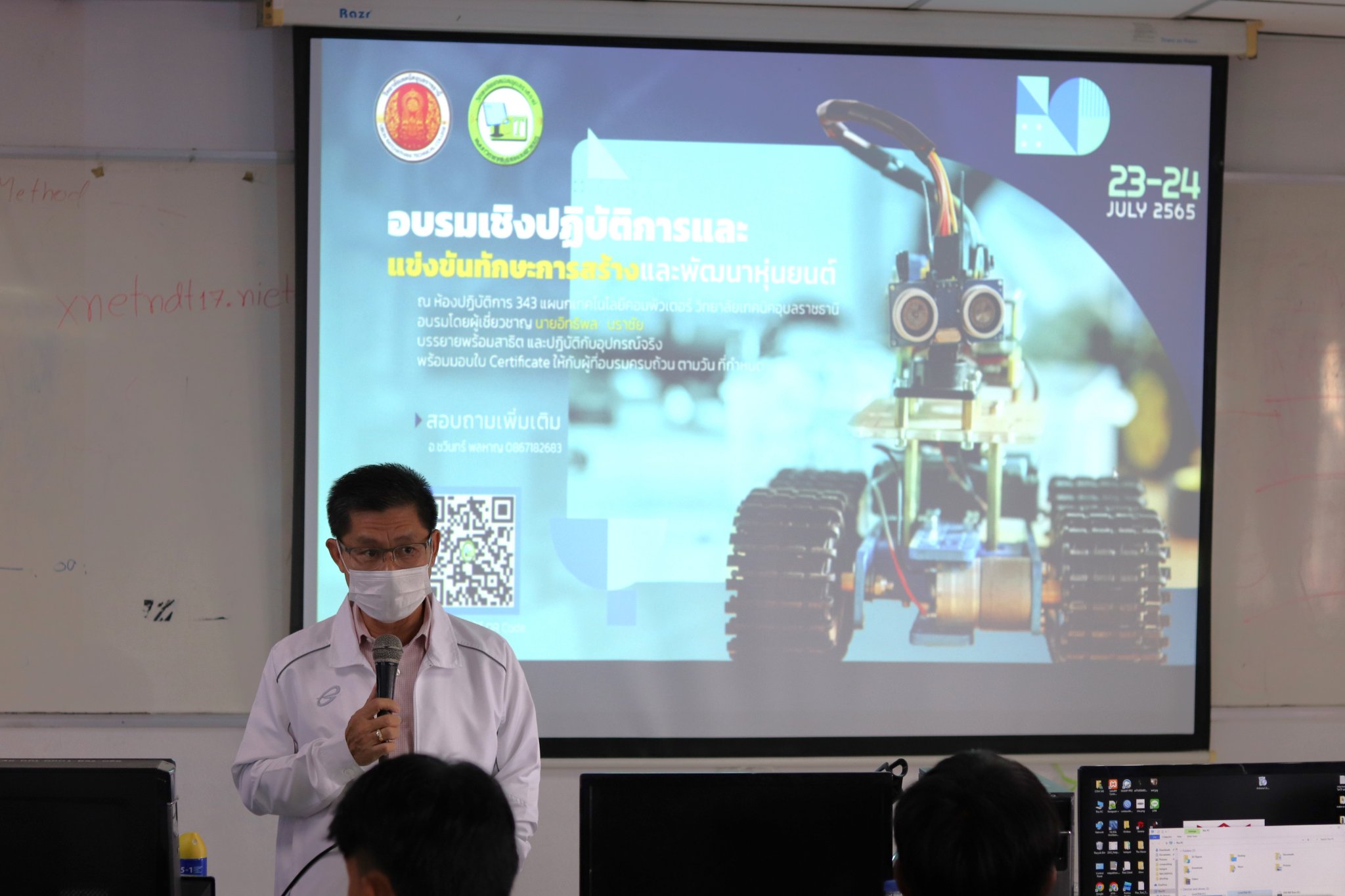 วันที่ ๒๓ กรกฎาคม ๒๕๖๕ เวลา ๐๙.๓๐ น. นายธาตรีพิบูลมณฑา ผู้อำนวยการวิทยาลัยเทคนิคอุบลราชธานี ให้เกียรติเป็นประธานในพิธีเปิดโครงการอบรมเชิงปฏิบัติการและแข่งขันทักษะการสร้างและพัฒนาหุ่นยนต์ ณ ห้องปฏิบัติการ ๓๔๓ แผนกวิชาเทคโนโลยีคอมพิวเตอร์ วิทยาลัยเทคนิคอุบลราชธานี โดยมีนายชวินทร์ พลหาญ หัวหน้าแผนกวิชาเทคโนโลยีคอมพิวเตอร์ คณะครู บุคลากรที่เกี่ยวข้อง และตัวแทนนักเรียน นักศึกษา เข้าร่วมโครงการอบรมอย่างพร้อมเพรียง ในการนี้ได้รับความอนุเคราะห์จาก นายอิทธิพล นราชัย ครูแผนกวิชาเทคโนโลยีคอมพิวเตอร์ ให้เกียรติเป็นวิทยากรในการจัดอบรม ทั้งนี้เพื่อให้นักเรียน นักศึกษา ได้รับความรู้ประสบการณ์ในการประกอบหุ่นยนต์ การเขียนโปรแกรมควบคุมหุ่นยนต์ การพัฒนาทักษะความคิดอย่างเป็นระบบ การพัฒนาตนเองให้ทันต่อโลกเทคโนโลยีในชีวิตประจำวัน และอนาคตต่อไป