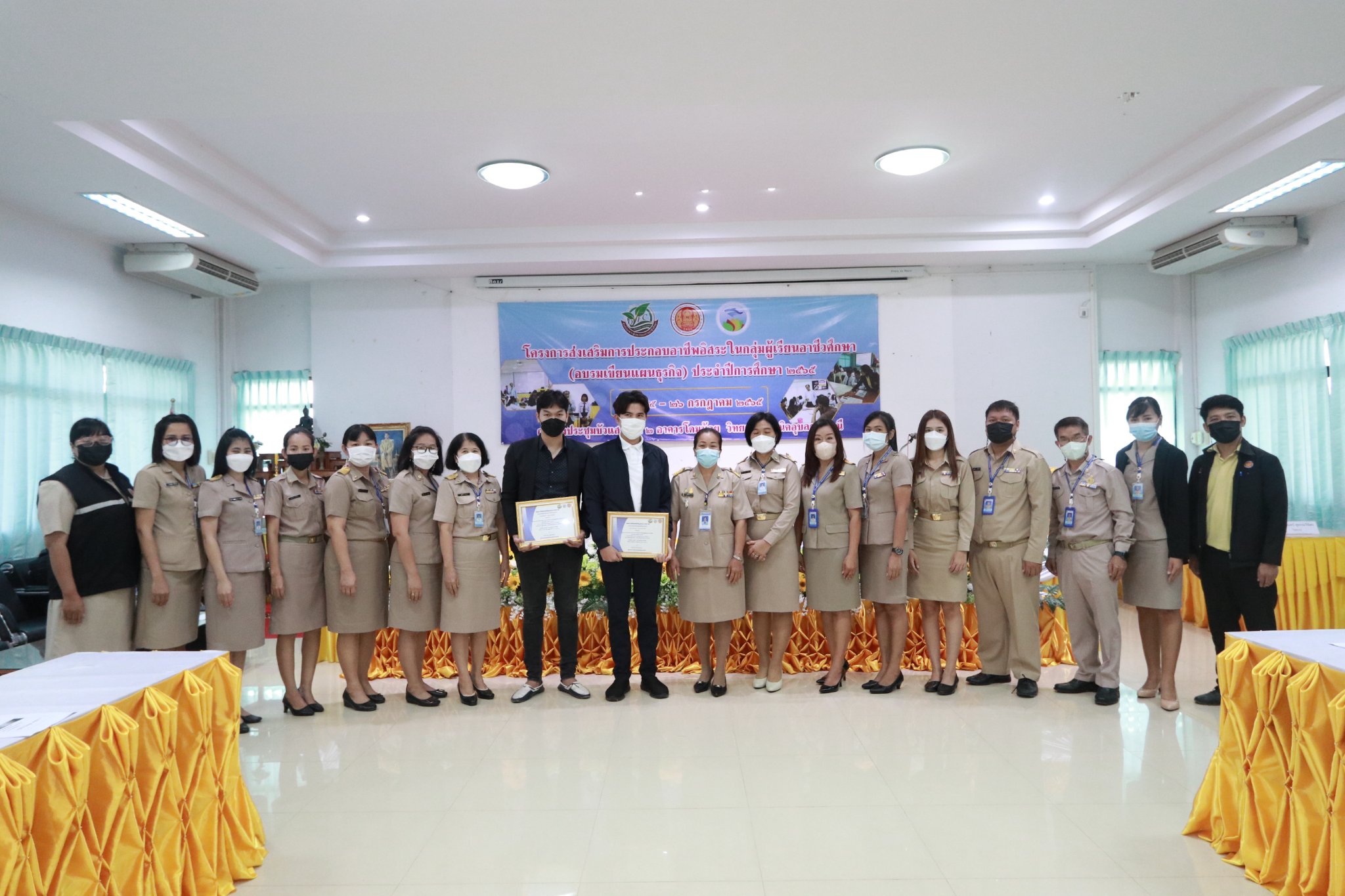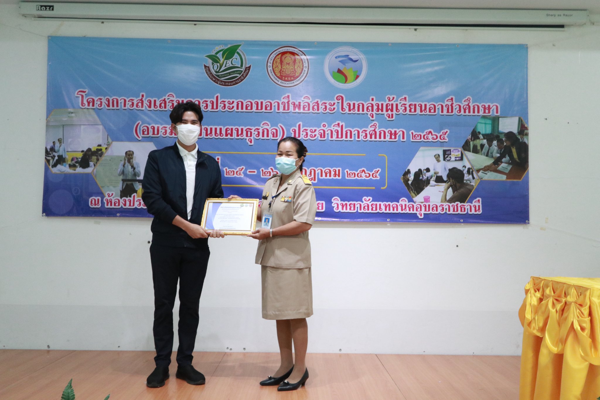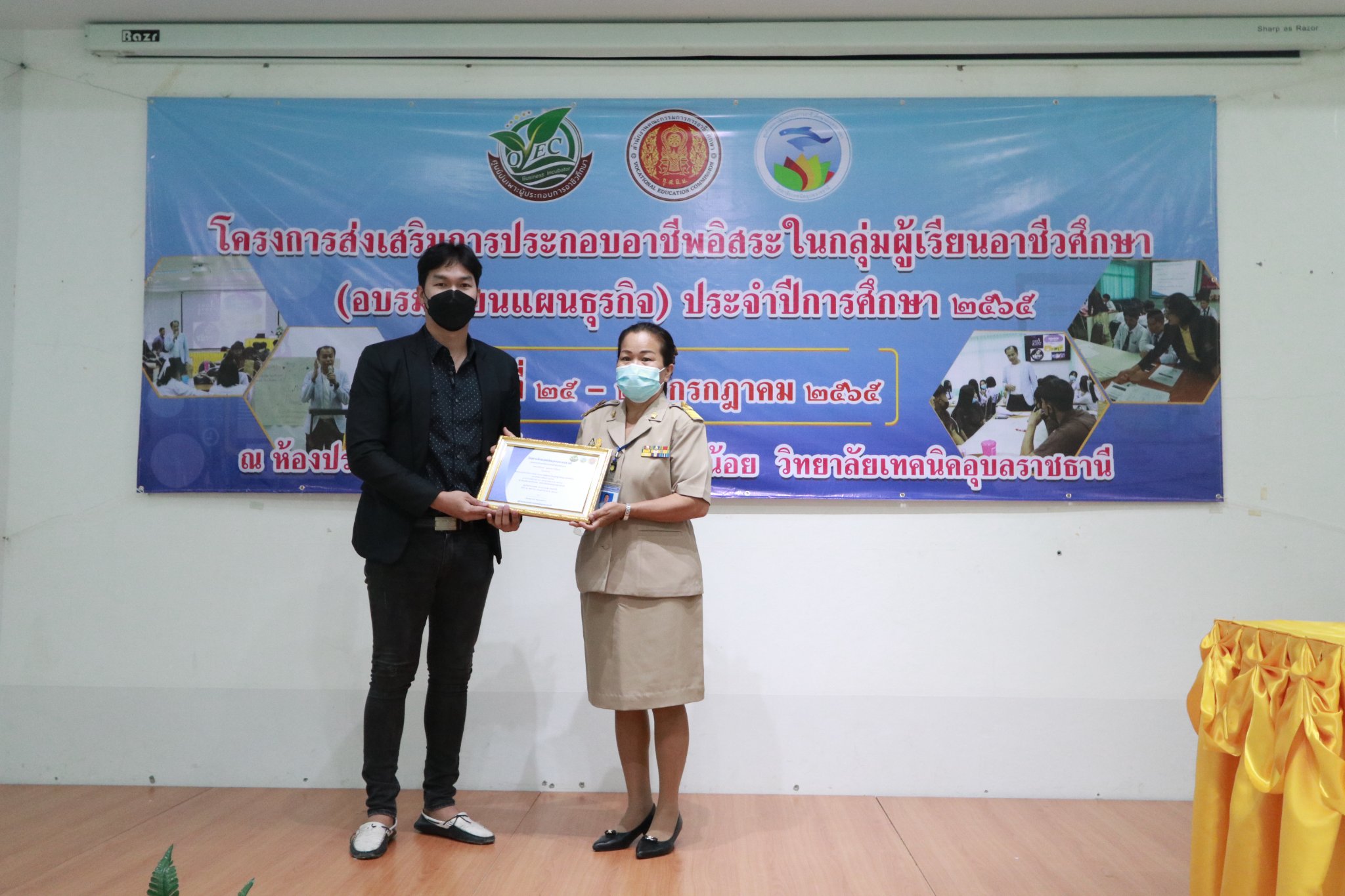 วันที่ ๒๕ กรกฎาคม ๒๕๖๕ เวลา ๐๘.๓๐ น. นายธาตรี พิบูลมณฑา ผู้อำนวยการวิทยาลัยเทคนิคอุบลราชธานี ได้มอบหมายให้ นางราตรีสะดีวงศ์ รองผู้อำนวยการฝ่ายแผนงานและความร่วมมือ เป็นประธานในพิธีเปิดโครงการส่งเสริมการประกอบอาชีพอิสระในกลุ่มผู้เรียนอาชีวศึกษา ระหว่างวันที่ ๒๕ – ๒๖ กรกฎาคม ๒๕๖๕ ณ ห้องประชุมบัวแสด ดำเนินการโดย งานส่งเสริมผลิตผล การค้า และประกอบธุรกิจ ฝ่ายแผนงานและความร่วมมือ โดยได้รับความอนุเคราะห์วิทยากรจากหน่วยงานภายนอก จำนวน ๓ ท่าน คือ ๑. นายวสวรรธน์ พวงพรศรี กรรมการผู้จัดการฝ่ายการตลาด บริษัทเอี่ยมบูรพา ให้เกียรติบรรยายเรื่อง แหล่งเงินทุน และการเขียนแผนธุรกิจ ในช่วงเช้า ๒. นายชนินทร์ สุธรรมวิจิตร เจ้าของธุรกิจเครื่องดื่มและโครงการบ้านจัดสรร ให้เกียรติบรรยายเรื่อง แนวทางธุรกิจในยุคดิจิทัล ในช่วงบ่าย ของวันที่ ๒๕ กรกฎาคม ๒๕๖๕ และ ๓. อาจารย์ชวพจน์ ศุภสาร อาจารย์ประจำคณะบริหารธุรกิจ มหาวิทยาลัยอุบลราชธานี ให้เกียรติบรรยายเรื่อง ความเป็นไปได้ของแผนธุรกิจ ในวันที่ ๒๖ กรกฎาคม ๒๕๖๕ ตลอดทั้งวัน ทั้งนี้มี นางสุภาพร ไชยชนะ หัวหน้างานส่งเสริมผลิตผล การค้า และการประกอบธุรกิจ ครู บุคลากรที่เกี่ยวข้อง และตัวแทนนักเรียน นักศึกษา เข้าร่วมการอบรมเชิงปฏิบัติการอย่างพร้อมเพรียง