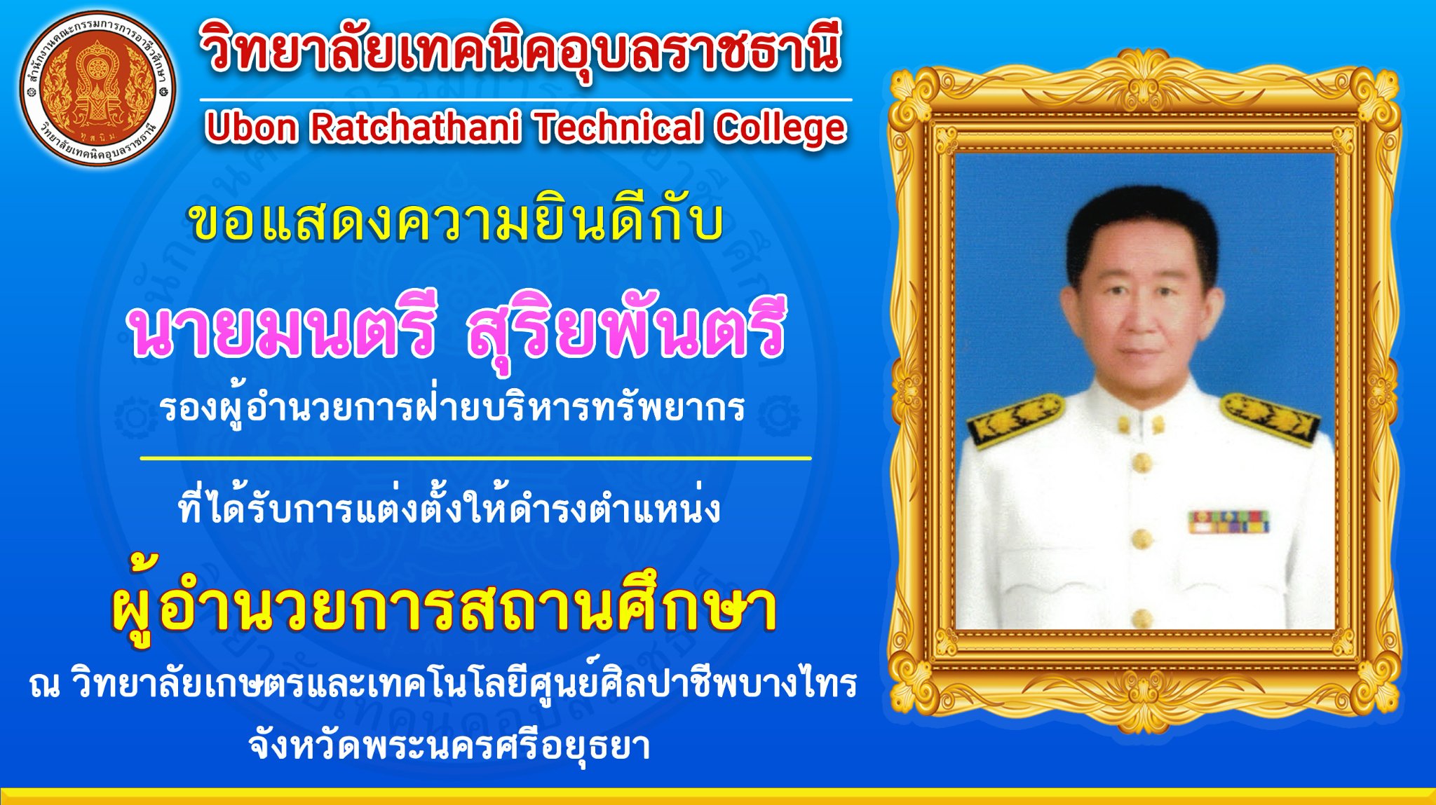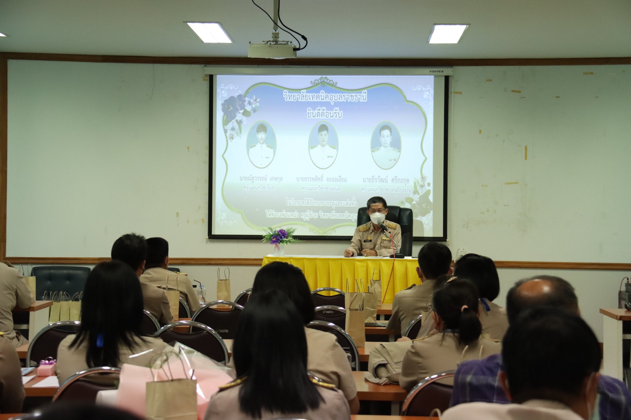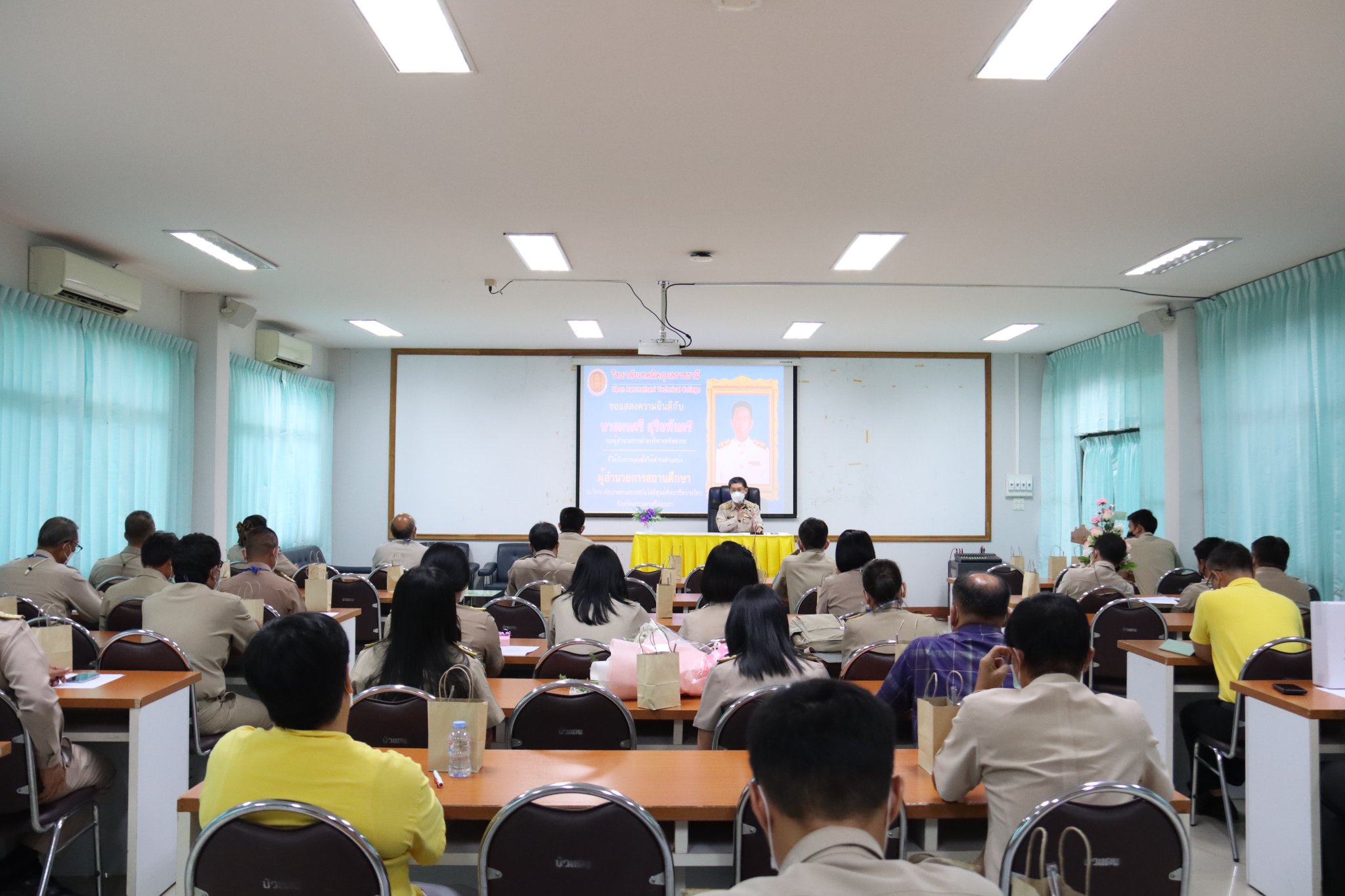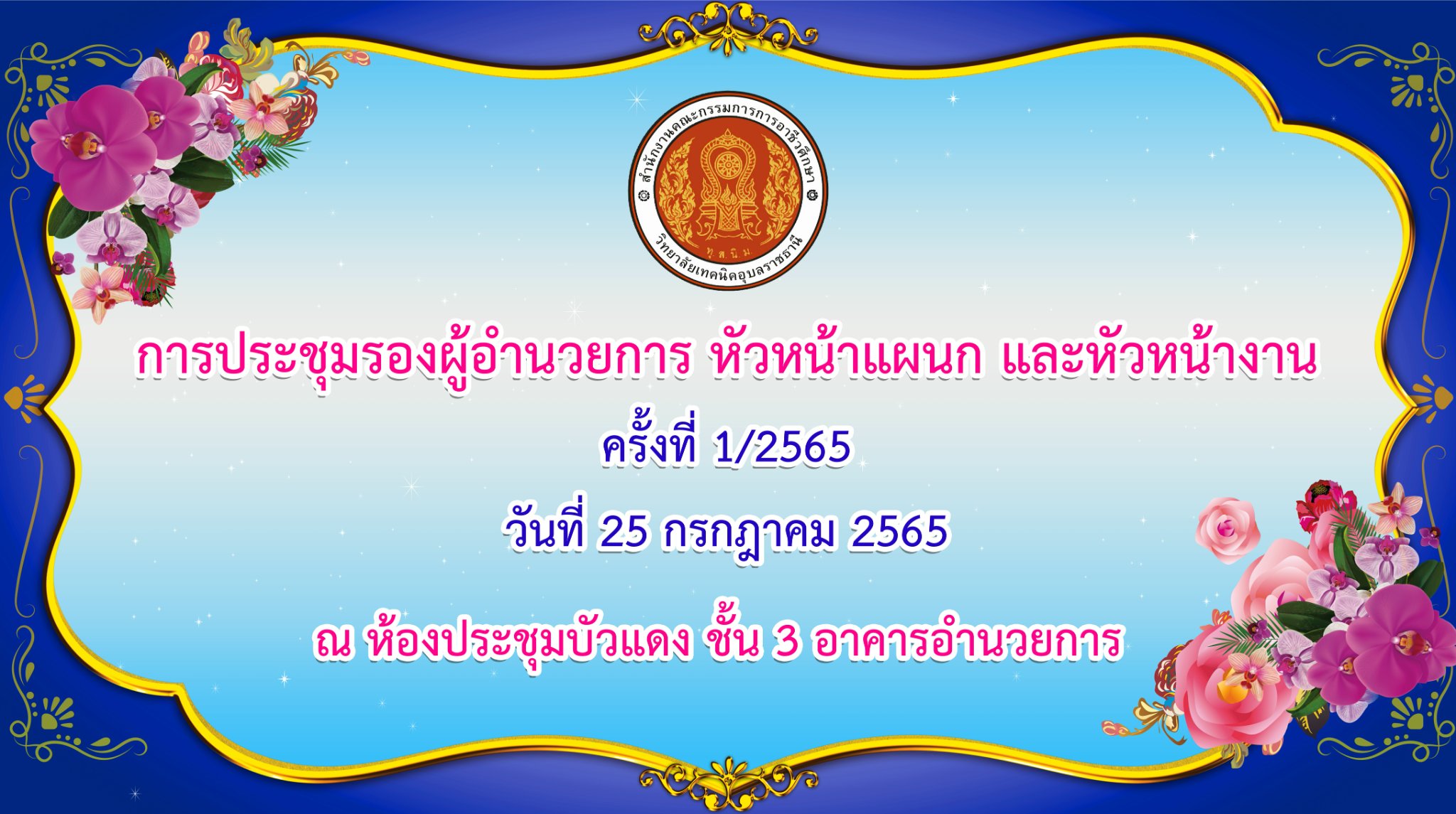 วันที่ ๒๕ กรกฎาคม ๒๕๖๕ เวลา ๑๖.๐๐ น. นายธาตรี พิบูลมณฑา ผู้อำนวยการวิทยาลัยเทคนิคอุบลราชธานี ให้เกียรติเป็นประธานในการประชุมรองผู้อำนวยการ หัวหน้าแผนกวิชา และหัวหน้างาน ครั้งที่ ๑/๒๕๖๕ ณ ห้องประชุมบัวแดง โดยเริ่มการประชุมตามระเบียบวาระการประชุม และถือโอกาสกล่าวแสดงความยินดีกับ นายมนตรี สุริยพันตรี รองผู้อำนวยการฝ่ายบริหารทรัพยากร ที่ได้รับการบรรจุและแต่งตั้งให้ดำรงตำแหน่งผู้อำนวยการสถานศึกษา พร้อมทั้งแนะนำบุคลากรใหม่ที่ย้ายมาปฏิบัติราชการ จำนวน ๒ คน ได้แก่ นายเศรษฐสิทธิ์ วงศ์สวัสดิ์ แผนกวิชาช่างไฟฟ้ากำลัง ย้ายมาจากวิทยาลัยการอาชีพพระสมุทรเจดีย์ จังหวัดสมุทรปราการ และนางสาวดุษฎีพร ดวงศรี หมวดวิชาภาษาต่างประเทศ แผนกวิชาสามัญสัมพันธ์ ย้ายมาจากวิทยาลัยเกษตรและเทคโนโลยีสุพรรณบุรี จังหวัดสุพรรณบุรี และบุคลากรที่มาบรรจุและแต่งตั้งให้ดำรงตำแหน่งครูผู้ช่วย จำนวน ๓ คน ได้แก่ นายณัฐวรรธน์ เกษกุล แผนกวิชาโยธา นายสรรพสิทธิ์ ละออเอี่ยม แผนกวิชาช่างยนต์ และนายธรีวัฒน์ ศรีกะกุล แผนกวิชาช่างกลโรงงาน หลังจากนั้นได้จัดกิจกรรมแสดงความยินดีกับนายมนตรี สุริยพันตรี รองผู้อำนวยการฝ่ายบริหารทรัพยากร ในโอกาสที่ได้รับการบรรจุและแต่งตั้งให้ดำรงตำแหน่งผู้อำนวยการสถานศึกษา ในวันที่ ๒๗ กรกฎาคม ๒๕๖๕ ที่วิทยาลัยเกษตรและเทคโนโลยีศูนย์ศิลปาชีพบางไทร จังหวัดพระนครศรีอยุธยา ณ หอประชุมโดมน้อย โดยมีคณะผู้บริหาร ครู บุคลากร เข้าร่วมกิจกรรมอย่างพร้อมเพรียง