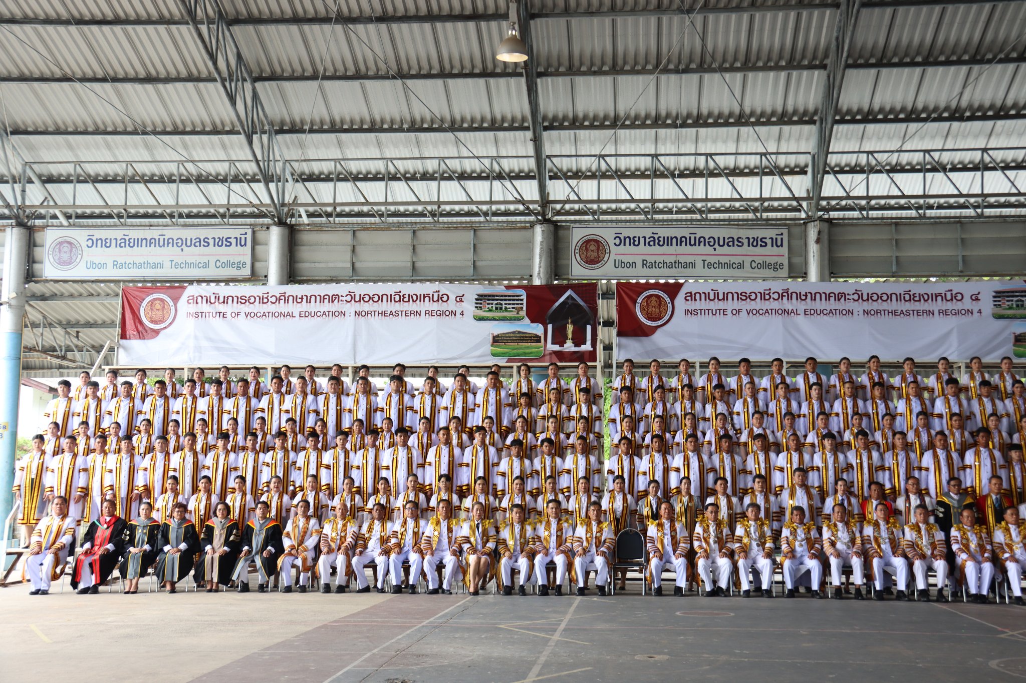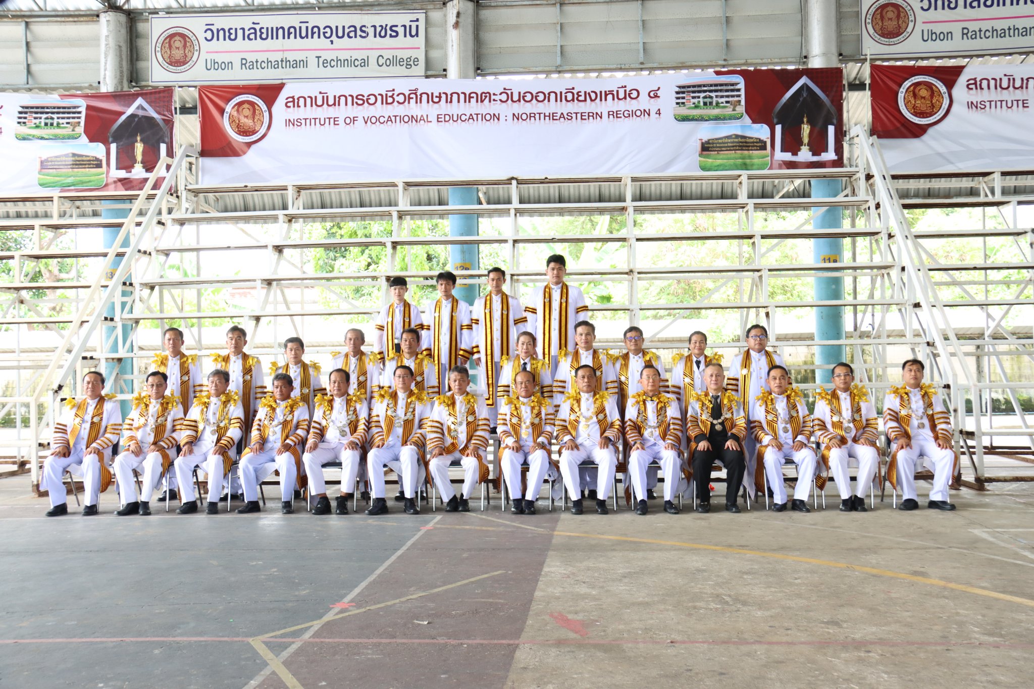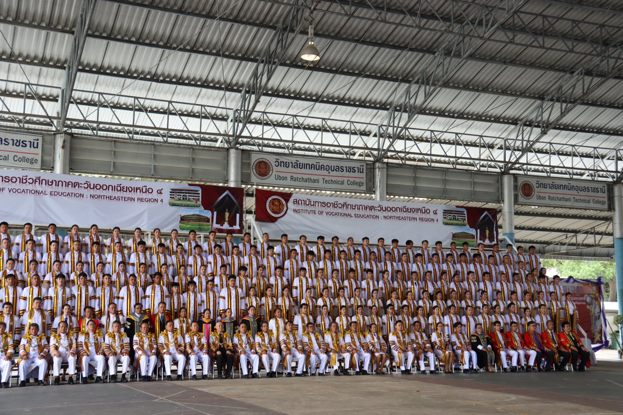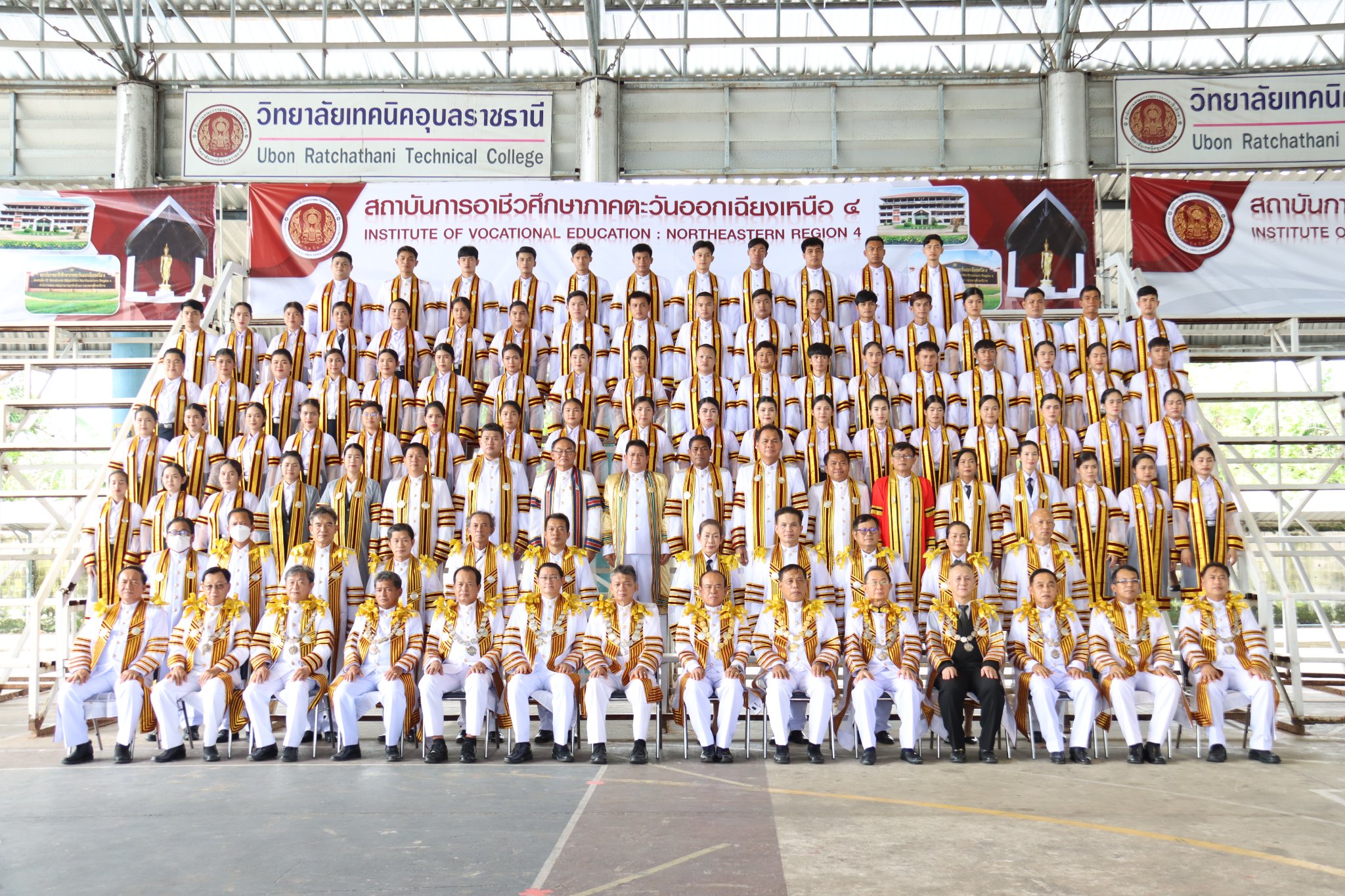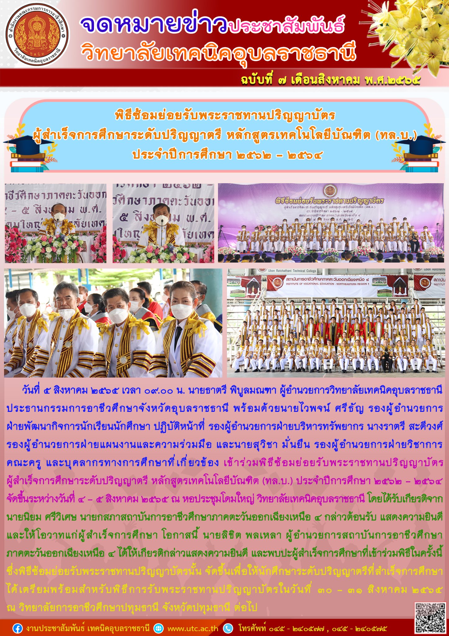 วันที่ ๕ สิงหาคม ๒๕๖๕เวลา ๐๙.๐๐ น. นายธาตรี พิบูลมณฑา ผู้อำนวยการวิทยาลัยเทคนิคอุบลราชธานีประธานกรรมการอาชีวศึกษาจังหวัดอุบลราชธานี พร้อมด้วยนายไวพจน์ ศรีธัญ รองผู้อำนวยการฝ่ายพัฒนากิจการนักเรียนนักศึกษา ปฏิบัติหน้าที่ รองผู้อำนวยการฝ่ายบริหารทรัพยากร นางราตรี สะดีวงศ์ รองผู้อำนวยการฝ่ายแผนงานและความร่วมมือ และนายสุวิชา มั่นยืน รองผู้อำนวยการฝ่ายวิชาการ คณะครู และบุคลากรทางการศึกษาที่เกี่ยวข้อง เข้าร่วมพิธีซ้อมย่อยรับพระราชทานปริญญาบัตร ผู้สำเร็จการศึกษาระดับปริญญาตรี หลักสูตรเทคโนโลยีบัณฑิต (ทล.บ.) ประจำปีการศึกษา ๒๕๖๒ – ๒๕๖๔ จัดขึ้นระหว่างวันที่ ๔ – ๕ สิงหาคม ๒๕๖๕ ณ หอประชุมโดมใหญ่ วิทยาลัยเทคนิคอุบลราชธานี โดยได้รับเกียรติจาก นายนิยม ศรีวิเศษ นายกสภาสถาบันการอาชีวศึกษาภาคตะวันออกเฉียงเหนือ ๔ กล่าวต้อนรับ แสดงความยินดี และให้โอวาทแก่ผู้สำเร็จการศึกษา โอกาสนี้ นายลิขิต พลเหลา ผู้อำนวยการสถาบันการอาชีวศึกษาภาคตะวันออกเฉียงเหนือ ๔ ได้ให้เกียรติกล่าวแสดงความยินดี และพบปะผู้สำเร็จการศึกษาที่เข้าร่วมพิธีในครั้งนี้ ซึ่งพิธีซ้อมย่อยรับพระราชทานปริญญาบัตรนั้น จัดขึ้นเพื่อให้นักศึกษาระดับปริญญาตรีที่สำเร็จการศึกษาได้เตรียมพร้อมสำหรับพิธีการรับพระราชทานปริญญาบัตรในวันที่ ๓๐ – ๓๑ สิงหาคม ๒๕๖๕ ณ วิทยาลัยการอาชีวศึกษาปทุมธานี จังหวัดปทุมธานี ต่อไป