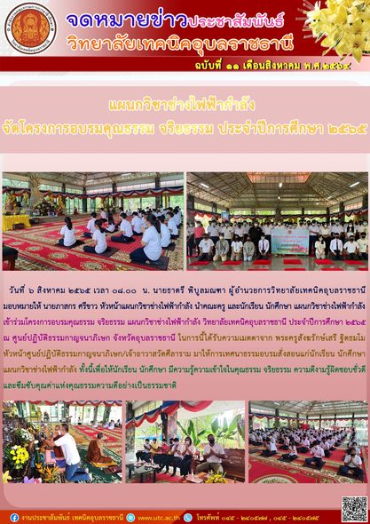 วันที่ ๖ สิงหาคม ๒๕๖๕ เวลา ๐๘.๐๐ น. นายธาตรี พิบูลมณฑา ผู้อำนวยการวิทยาลัยเทคนิคอุบลราชธานี มอบหมายให้ นายภาสกร ศรีขาวหัวหน้าแผนกวิชาช่างไฟฟ้ากำลัง นำคณะครู และนักเรียน นักศึกษา แผนกวิชาช่างไฟฟ้ากำลัง เข้าร่วมโครงการอบรมคุณธรรม จริยธรรม แผนกวิชาช่างไฟฟ้ากำลัง วิทยาลัยเทคนิคอุบลราชธานี ประจำปีการศึกษา ๒๕๖๕ ณ ศูนย์ปฏิบัติธรรมกาญจนาภิเษก จังหวัดอุบลราชธานี ในการนี้ได้รับความเมตตาจาก พระครูสังฆรักษ์เสรี ฐิตธมโม หัวหน้าศูนย์ปฏิบัติธรรมกาญจนาภิเษก/เจ้าอาวาสวัดศีลาราม มาให้การเทศนาธรรมอบรมสั่งสอนแก่นักเรียน นักศึกษา แผนกวิชาช่างไฟฟ้ากำลัง ทั้งนี้เพื่อให้นักเรียน นักศึกษา มีความรู้ความเข้าใจในคุณธรรม จริยธรรม ความดีงามรู้ผิดชอบชั่วดี และซึมซับคุณค่าแห่งคุณธรรมความดีอย่างเป็นธรรมชาติ