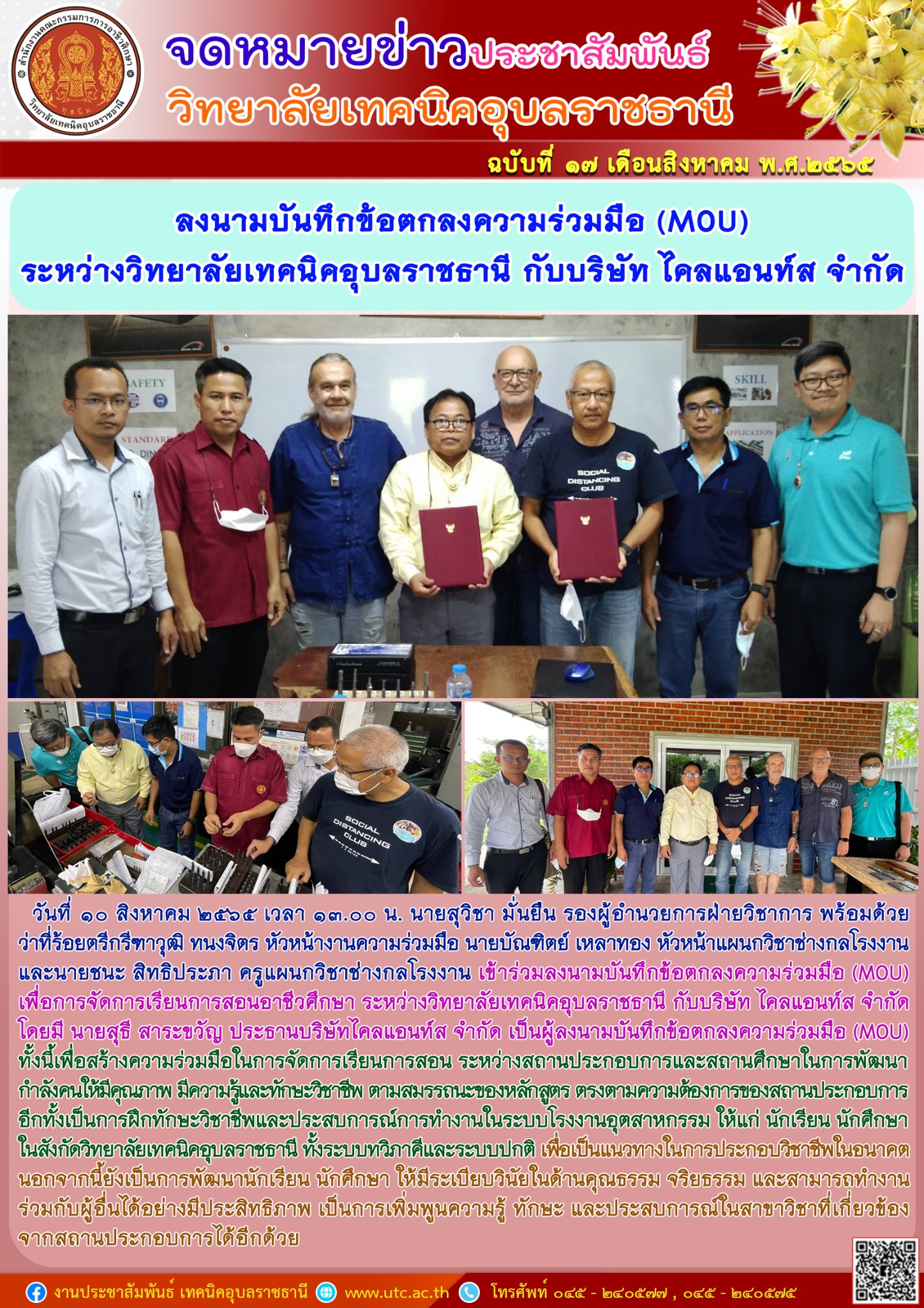 วันที่ ๑๐ สิงหาคม ๒๕๖๕ เวลา ๑๓.๐๐ น. นายสุวิชา มั่นยืน รองผู้อำนวยการฝ่ายวิชาการ พร้อมด้วย ว่าที่ร้อยตรีกรีฑาวุฒิ ทนงจิตรหัวหน้างานความร่วมมือ นายบัณฑิตย์ เหลาทอง หัวหน้าแผนกวิชาช่างกลโรงงาน และนายชนะ สิทธิประภา ครูแผนกวิชาช่างกลโรงงาน เข้าร่วมลงนามบันทึกข้อตกลงความร่วมมือ (MOU) เพื่อการจัดการเรียนการสอนอาชีวศึกษา ระหว่างวิทยาลัยเทคนิคอุบลราชธานี กับบริษัท ไคลแอนท์ส จำกัด โดยมี นายสุธี สาระขวัญ ประธานบริษัทไคลแอนท์ส จำกัด เป็นผู้ลงนามบันทึกข้อตกลงความร่วมมือ (MOU) ทั้งนี้เพื่อสร้างความร่วมมือในการจัดการเรียนการสอน ระหว่างสถานประกอบการและสถานศึกษาในการพัฒนากำลังคนให้มีคุณภาพ มีความรู้และทักษะวิชาชีพ ตามสมรรถนะของหลักสูตร ตรงตามความต้องการของสถานประกอบการ อีกทั้งเป็นการฝึกทักษะวิชาชีพและประสบการณ์การทำงานในระบบโรงงานอุตสาหกรรม ให้แก่ นักเรียน นักศึกษาในสังกัดวิทยาลัยเทคนิคอุบลราชธานี ทั้งระบบทวิภาคีและระบบปกติ เพื่อเป็นแนวทางในการประกอบวิชาชีพในอนาคต นอกจากนี้ยังเป็นการพัฒนานักเรียน นักศึกษา ให้มีระเบียบวินัยในด้านคุณธรรม จริยธรรม และสามารถทำงานร่วมกับผู้อื่นได้อย่างมีประสิทธิภาพ เป็นการเพิ่มพูนความรู้ ทักษะ และประสบการณ์ในสาขาวิชาที่เกี่ยวข้องจากสถานประกอบการได้อีกด้วย