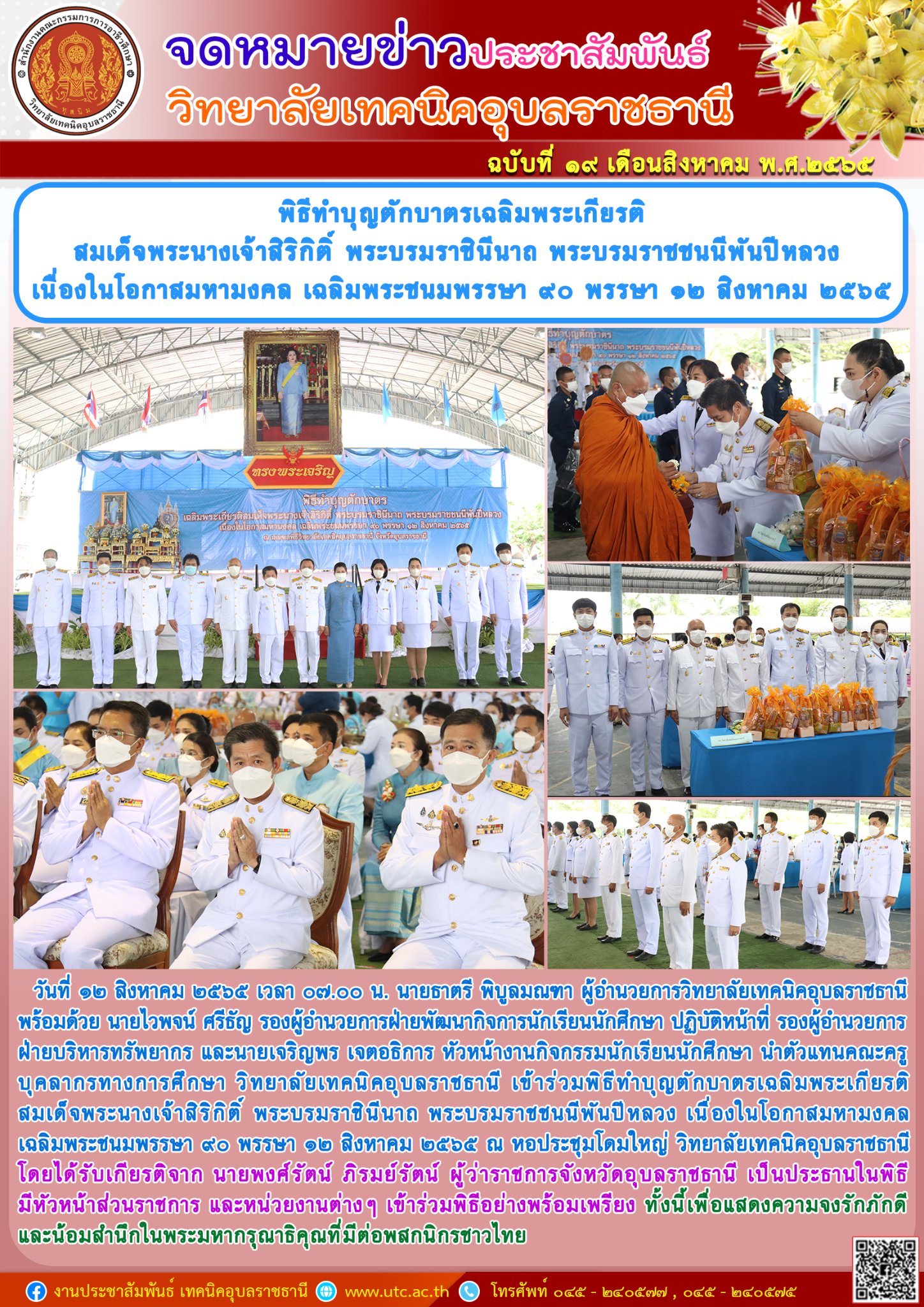 วันที่ ๑๒ สิงหาคม ๒๕๖๕เวลา ๐๗.๐๐ น. นายธาตรี พิบูลมณฑา ผู้อำนวยการวิทยาลัยเทคนิคอุบลราชธานี พร้อมด้วย นายไวพจน์ ศรีธัญ รองผู้อำนวยการฝ่ายพัฒนากิจการนักเรียนนักศึกษา ปฏิบัติหน้าที่ รองผู้อำนวยการฝ่ายบริหารทรัพยากร และนายเจริญพร เจตอธิการ หัวหน้างานกิจกรรมนักเรียนนักศึกษา นำตัวแทนคณะครู บุคลากรทางการศึกษา วิทยาลัยเทคนิคอุบลราชธานี เข้าร่วมพิธีทำบุญตักบาตรเฉลิมพระเกียรติสมเด็จพระนางเจ้าสิริกิติ์ พระบรมราชินีนาถ พระบรมราชชนนีพันปีหลวง เนื่องในโอกาสมหามงคลเฉลิมพระชนมพรรษา ๙๐ พรรษา ๑๒ สิงหาคม ๒๕๖๕ ณ หอประชุมโดมใหญ่ วิทยาลัยเทคนิคอุบลราชธานี โดยได้รับเกียรติจาก นายพงศ์รัตน์ ภิรมย์รัตน์ ผู้ว่าราชการจังหวัดอุบลราชธานี เป็นประธานในพิธี มีหัวหน้าส่วนราชการ และหน่วยงานต่างๆ เข้าร่วมพิธีอย่างพร้อมเพรียง ทั้งนี้เพื่อแสดงความจงรักภักดี และน้อมสำนึกในพระมหากรุณาธิคุณที่มีต่อพสกนิกรชาวไทย