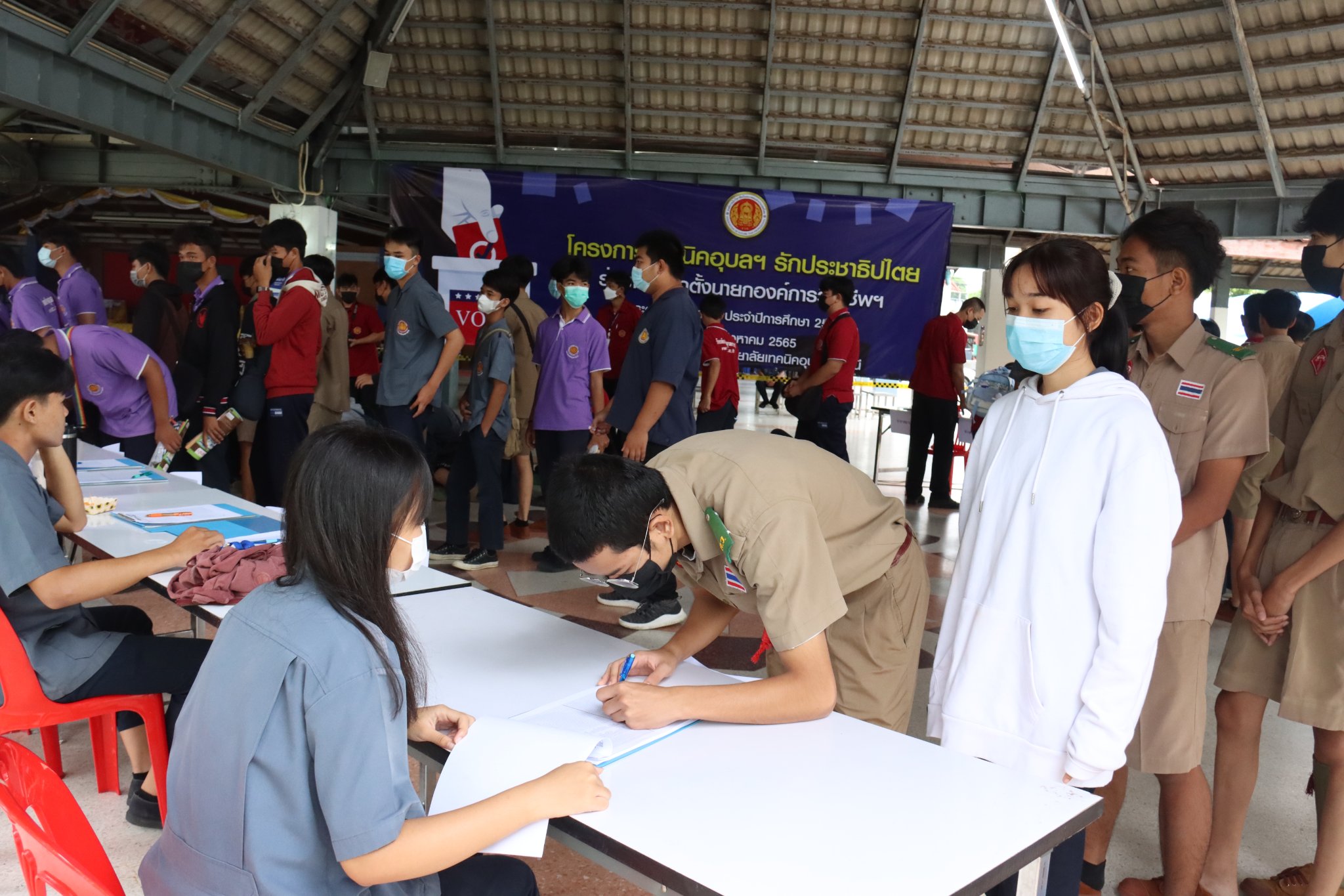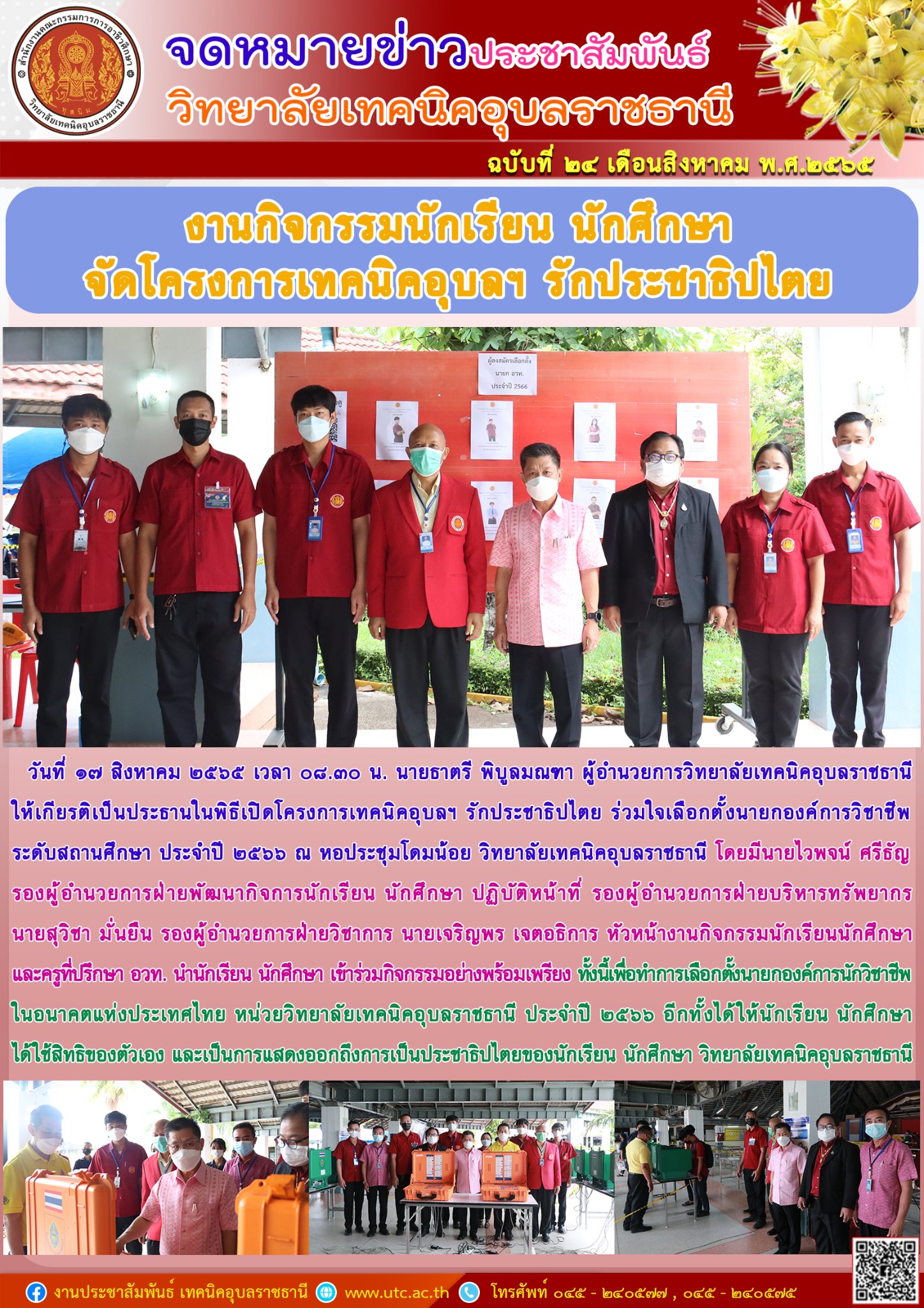 วันที่ ๑๗ สิงหาคม ๒๕๖๕ เวลา ๐๘.๓๐ น. นายธาตรี พิบูลมณฑา ผู้อำนวยการวิทยาลัยเทคนิคอุบลราชธานีให้เกียรติเป็นประธานในพิธีเปิดโครงการเทคนิคอุบลฯ รักประชาธิปไตย ร่วมใจเลือกตั้งนายกองค์การวิชาชีพ ระดับสถานศึกษา ประจำปี ๒๕๖๖ ณ หอประชุมโดมน้อย วิทยาลัยเทคนิคอุบลราชธานี โดยมีนายไวพจน์ ศรีธัญ รองผู้อำนวยการฝ่ายพัฒนากิจการนักเรียน นักศึกษา ปฏิบัติหน้าที่ รองผู้อำนวยการฝ่ายบริหารทรัพยากร นายสุวิชา มั่นยืน รองผู้อำนวยการฝ่ายวิชาการ นายเจริญพร เจตอธิการ หัวหน้างานกิจกรรมนักเรียนนักศึกษา และครูที่ปรึกษา อวท. นำนักเรียน นักศึกษา เข้าร่วมกิจกรรมอย่างพร้อมเพรียง ทั้งนี้เพื่อทำการเลือกตั้งนายกองค์การนักวิชาชีพในอนาคตแห่งประเทศไทย หน่วยวิทยาลัยเทคนิคอุบลราชธานี ประจำปี ๒๕๖๖ อีกทั้งได้ให้นักเรียน นักศึกษา ได้ใช้สิทธิของตัวเอง และเป็นการแสดงออกถึงการเป็นประชาธิปไตยของนักเรียน นักศึกษา วิทยาลัยเทคนิคอุบลราชธานี