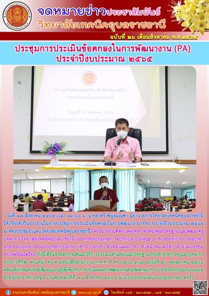 วันที่ ๑๗ สิงหาคม ๒๕๖๕ เวลา ๑๓.๐๐ น. นายธาตรี พิบูลมณฑา ผู้อำนวยการวิทยาลัยเทคนิคอุบลราชธานีให้เกียรติเป็นประธานในการประชุมการประเมินข้อตกลงในการพัฒนางาน (PA) ประจำปีงบประมาณ ๒๕๖๕ ณ ห้องประชุมบัวแดง วิทยาลัยเทคนิคอุบลราชธานี โดยมีนายบัณฑิตย์ เหลาทอง หัวหน้าศูนย์วิทยฐานะและพัฒนาครู บุคลากร วิทยาลัยเทคนิคอุบลราชธานี Ubon Ratchathani Technical College of Academic for Teacher and Personnel Development Center (ATD Center) หัวหน้าแผนกวิชา หัวหน้าหมวดวิชา เข้าร่วมประชุมอย่างพร้อมเพรียง ทั้งนี้เพื่อแจ้งหลักเกณฑ์และวิธีการประเมินตำแหน่งและวิทยฐานะของข้าราชการครูและบุคลากรทางการศึกษา ตำแหน่ง ครู ตามหนังสือสำนักงาน ก.ค.ศ. ที่ ศธ ๐๒๐๖.๓/ว๙ ลงวันที่ ๒๐ พฤษภาคม ๒๕๖๔ พร้อมทั้งกำหนดประชุมชี้แจงแนวปฏิบัติเกี่ยวกับการประเมินผลการพัฒนางานตามข้อตกลง (PA) ประจำปีงบประมาณ ๒๕๖๕ สำหรับข้าราชการครู ในวันพฤหัสบดีที่ ๑๘ สิงหาคม ๒๕๖๕ ผ่านระบบออนไลน์ Google meet ต่อไป