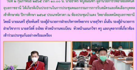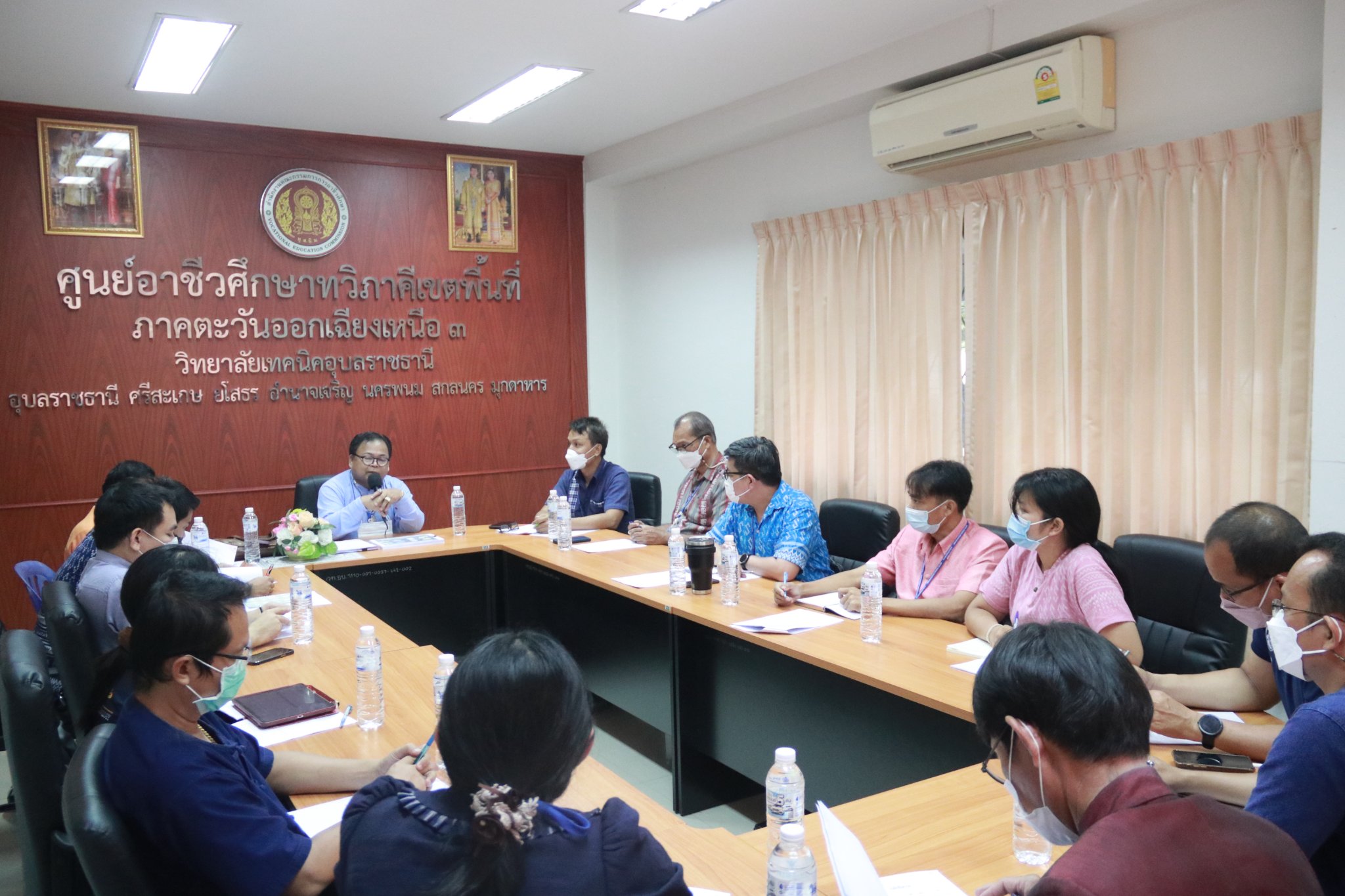 วันที่ ๑๙ สิงหาคม ๒๕๖๕ เวลา ๐๙.๐๐ น. นายธาตรี พิบูลมณฑา ผู้อำนวยการวิทยาลัยเทคนิคอุบลราชธานี ได้มอบหมายให้ นายสุวิชา มั่นยืนรองผู้อำนวยการฝ่ายวิชาการ เป็นประธานในการประชุม การดำเนินงานของงานอาชีวศึกษาระบบทวิภาคี ฝ่ายวิชาการ ณ ห้องประชุมศูนย์อาชีวศึกษาทวิภาคีเขตพื้นที่ ภาคตะวันออกเฉียงเหนือ ๓ วิทยาลัยเทคนิคอุบลราชธานี โดยมี นายทรงศักดิ์ สัตนาโค หัวหน้างานอาชีวศึกษาระบบทวิภาคี พร้อมด้วยหัวหน้าแผนกวิชาทุกแผนกวิชา เข้าร่วมประชุมอย่างพร้อมเพรียง ทั้งนี้เพื่อชี้แจงเรื่องมาตรฐานการจัดการอาชีวศึกษาระบบทวิภาคี การทำบันทึกข้อตกลงความร่วมมือ ระหว่างสถานศึกษาและสถานประกอบการ การนิเทศติดตามการฝึกงาน/ฝึกอาชีพในรูปแบบปกติและรูปแบบออนไลน์ที่จะนำมาปรับใช้ในอนาคตต่อไป