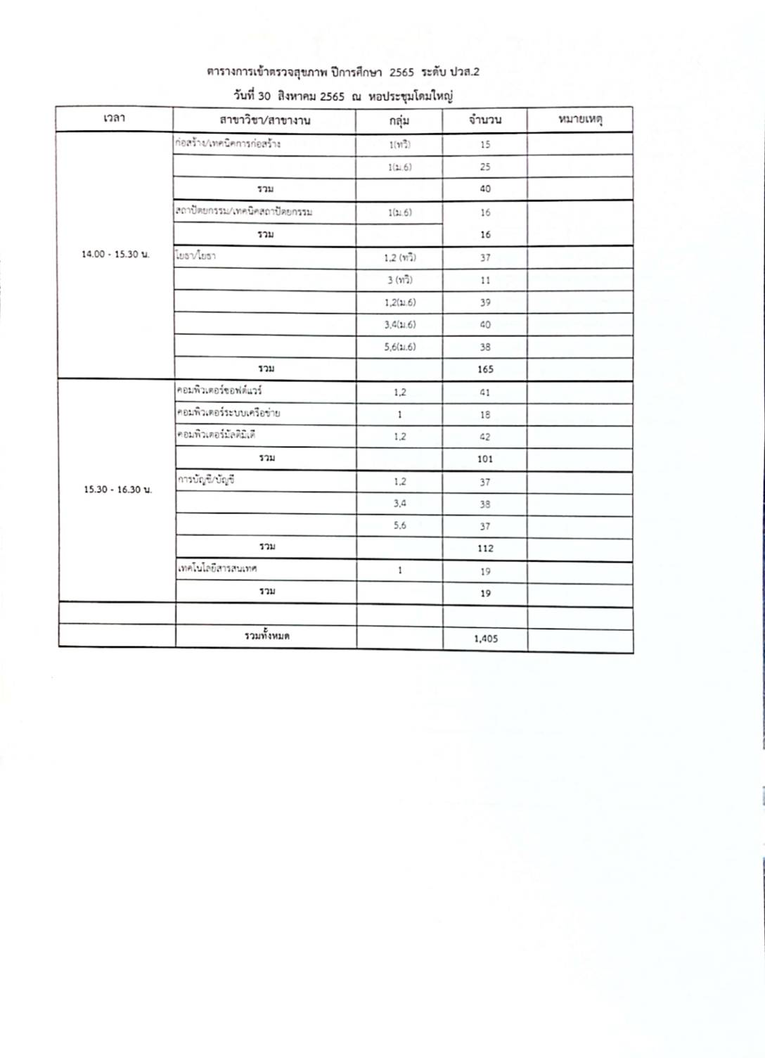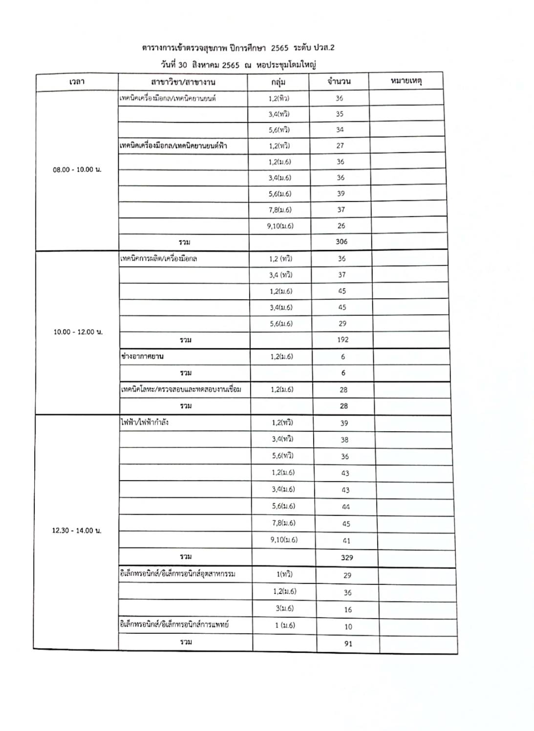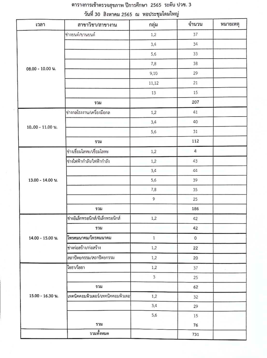 ให้นักเรียน นักศึกษาระดับชั้น ปวช.3 และ ปวส.2 เข้ารับการตรวจสุขภาพ ในวันที่ 30 สิงหาคม 2565 ตามตารางการตรวจสุขภาพ