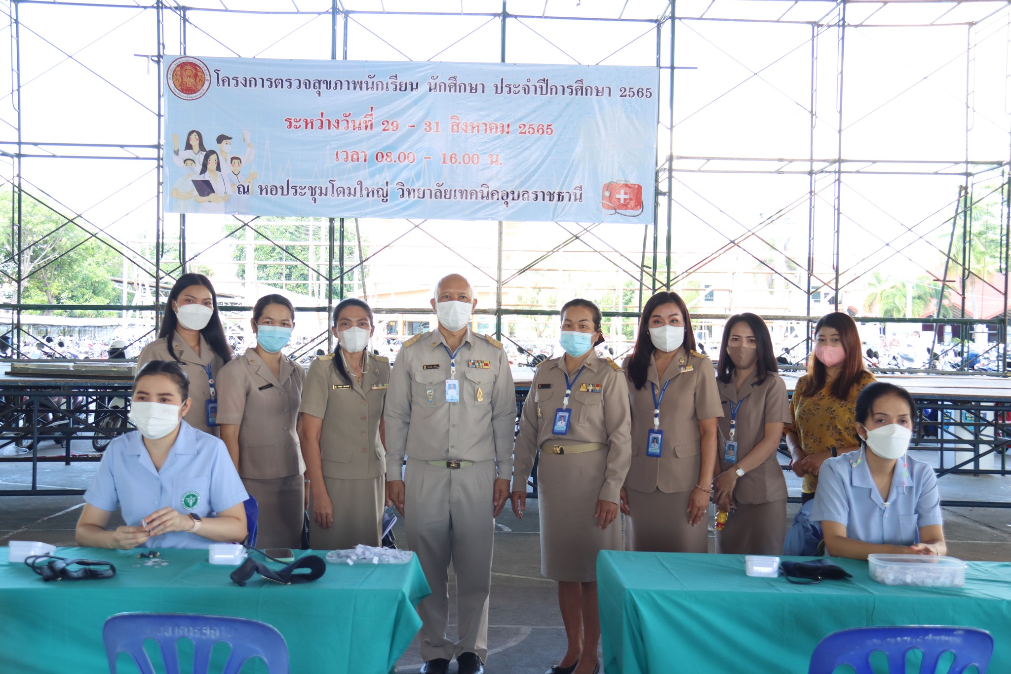 วันที่ ๒๙ สิงหาคม ๒๕๖๕ เวลา ๐๙.๐๐ น. นายธาตรี พิบูลมณฑา ผู้อำนวยการวิทยาลัยเทคนิคอุบลราชธานี ได้มอบหมายให้ นายไวพจน์ ศรีธัญรองผู้อำนวยการฝ่ายพัฒนากิจการนักเรียนนักศึกษา ปฏิบัติหน้าที่ รองผู้อำนวยการฝ่ายบริหารทรัพยากร นางราตรี สะดีวงศ์ รองผู้อำนวยการฝ่ายแผนงานและความร่วมมือ นำคณะครู นักเรียน นักศึกษา เข้าร่วมโครงการตรวจสุขภาพนักเรียน นักศึกษา ปีการศึกษา ๒๕๖๕ โดยดำเนินการระหว่างวันที่ ๒๙ – ๓๑ สิงหาคม ๒๕๖๕ ตั้งแต่เวลา ๐๘.๐๐ – ๑๖.๐๐ น. ณ หอประชุมโดมใหญ่ วิทยาลัยเทคนิคอุบลราชธานี ทั้งนี้เพื่อเก็บข้อมูลสุขภาพนักเรียน นักศึกษา วิทยาลัยเทคนิคอุบลราชธานีให้เป็นไปด้วยความเรียบร้อยต่อไป