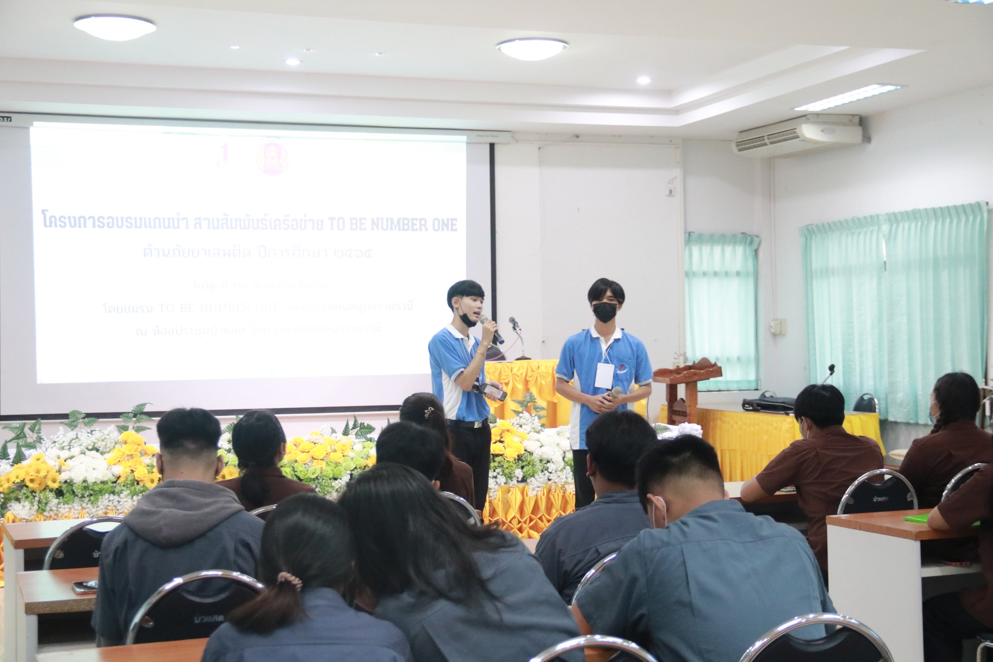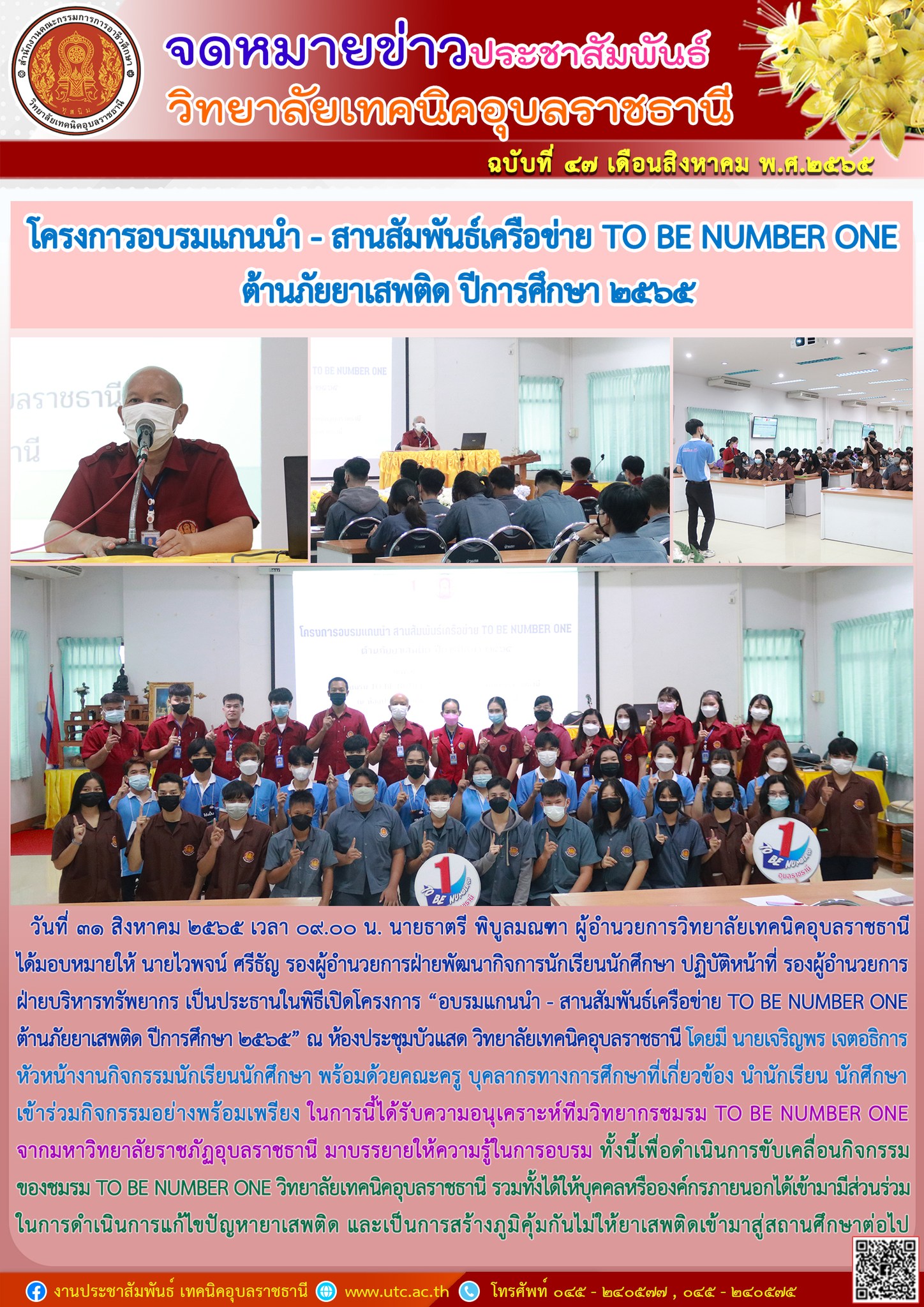 วันที่ ๓๑ สิงหาคม ๒๕๖๕ เวลา ๐๙.๐๐ น. นายธาตรี พิบูลมณฑาผู้อำนวยการวิทยาลัยเทคนิคอุบลราชธานี ได้มอบหมายให้ นายไวพจน์ ศรีธัญ รองผู้อำนวยการฝ่ายพัฒนากิจการนักเรียนนักศึกษา ปฏิบัติหน้าที่ รองผู้อำนวยการฝ่ายบริหารทรัพยากร เป็นประธานในพิธีเปิดโครงการ “อบรมแกนนำ – สานสัมพันธ์เครือข่าย TO BE NUMBER ONE ต้านภัยยาเสพติด ปีการศึกษา ๒๕๖๕” ณ ห้องประชุมบัวแสด วิทยาลัยเทคนิคอุบลราชธานี โดยมี นายเจริญพร เจตอธิการ หัวหน้างานกิจกรรมนักเรียนนักศึกษา พร้อมด้วยคณะครู บุคลากรทางการศึกษาที่เกี่ยวข้อง นำนักเรียน นักศึกษา เข้าร่วมกิจกรรมอย่างพร้อมเพรียง ในการนี้ได้รับความอนุเคราะห์ทีมวิทยากรชมรม TO BE NUMBER ONE จากมหาวิทยาลัยราชภัฏอุบลราชธานี มาบรรยายให้ความรู้ในการอบรม ทั้งนี้เพื่อดำเนินการขับเคลื่อนกิจกรรมของชมรม TO BE NUMBER ONE วิทยาลัยเทคนิคอุบลราชธานี รวมทั้งได้ให้บุคคลหรือองค์กรภายนอกได้เข้ามามีส่วนร่วมในการดำเนินการแก้ไขปัญหายาเสพติด และเป็นการสร้างภูมิคุ้มกันไม่ให้ยาเสพติดเข้ามาสู่สถานศึกษาต่อไป