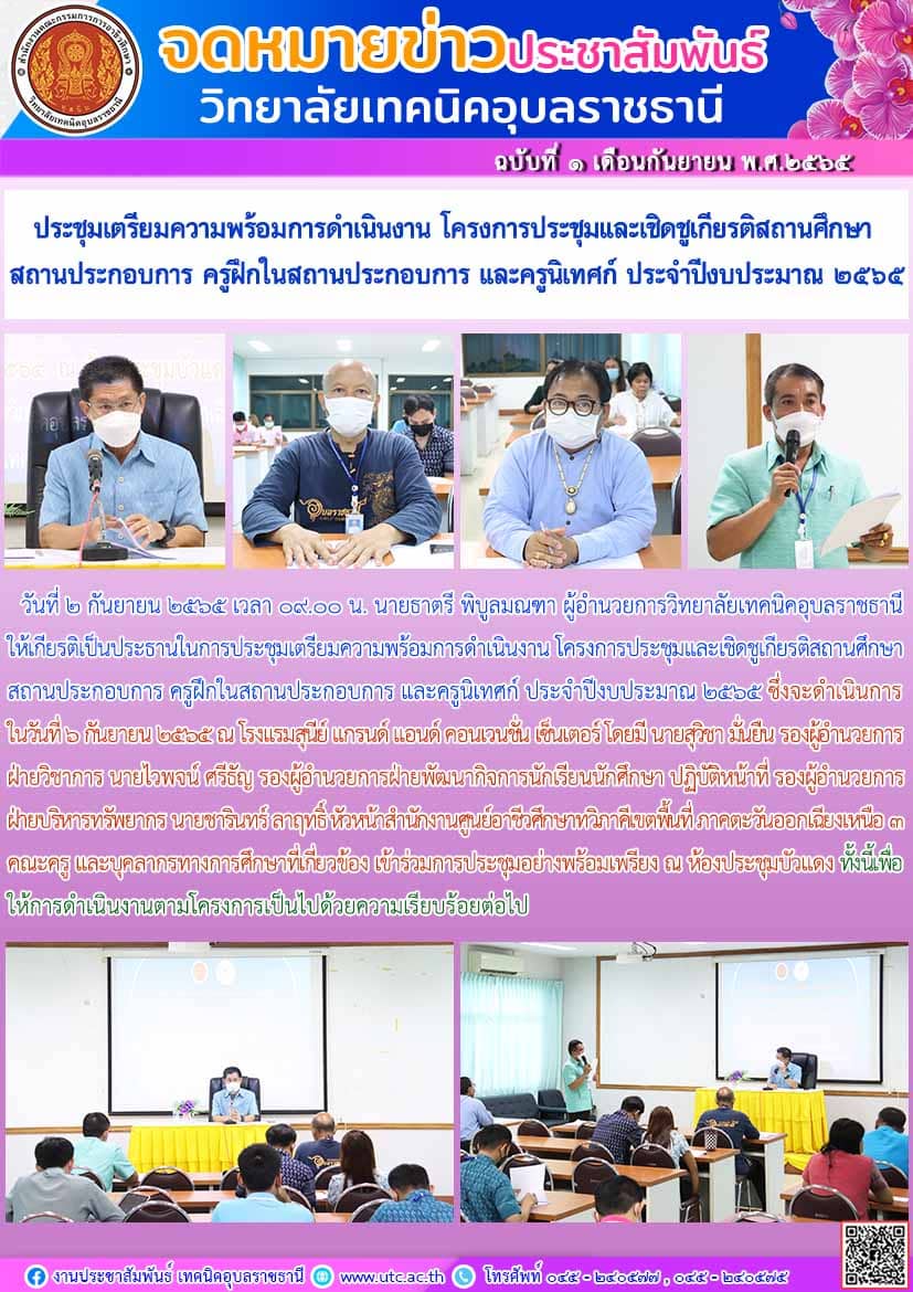 วันที่ ๒ กันยายน ๒๕๖๕ เวลา ๐๙.๐๐ น. นายธาตรี พิบูลมณฑา ผู้อำนวยการวิทยาลัยเทคนิคอุบลราชธานีให้เกียรติเป็นประธานในการประชุมเตรียมความพร้อมการดำเนินงาน โครงการประชุมและเชิดชูเกียรติสถานศึกษา สถานประกอบการ ครูฝึกในสถานประกอบการ และครูนิเทศก์ ประจำปีงบประมาณ ๒๕๖๕ ซึ่งจะดำเนินการในวันที่ ๖ กันยายน ๒๕๖๕ ณ โรงแรมสุนีย์ แกรนด์ แอนด์ คอนเวนชั่น เซ็นเตอร์ โดยมี นายสุวิชา มั่นยืน รองผู้อำนวยการฝ่ายวิชาการ นายไวพจน์ ศรีธัญ รองผู้อำนวยการฝ่ายพัฒนากิจการนักเรียนนักศึกษา ปฏิบัติหน้าที่ รองผู้อำนวยการฝ่ายบริหารทรัพยากร นายชารินทร์ ลาฤทธิ์ หัวหน้าสำนักงานศูนย์อาชีวศึกษาทวิภาคีเขตพื้นที่ ภาคตะวันออกเฉียงเหนือ ๓ คณะครู และบุคลากรทางการศึกษาที่เกี่ยวข้อง เข้าร่วมการประชุมอย่างพร้อมเพรียง ณ ห้องประชุมบัวแดง ทั้งนี้เพื่อให้การดำเนินงานตามโครงการเป็นไปด้วยความเรียบร้อยต่อไป
