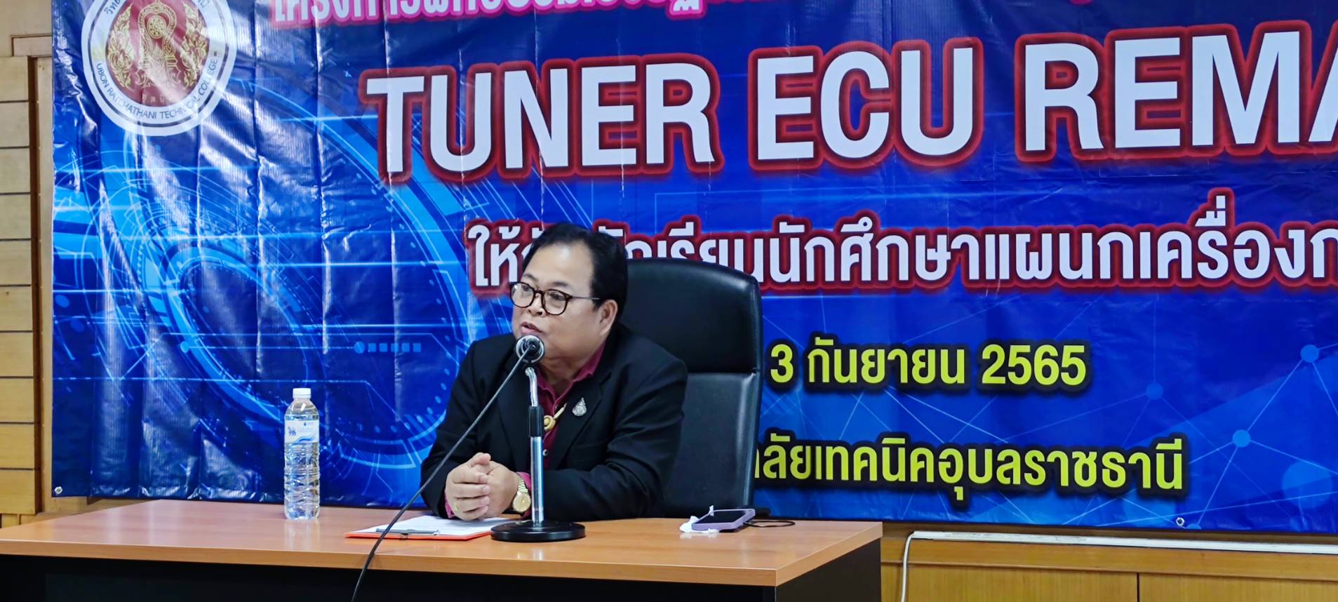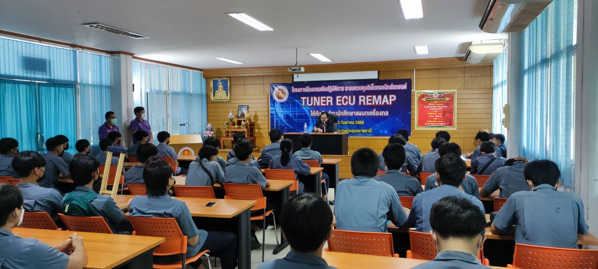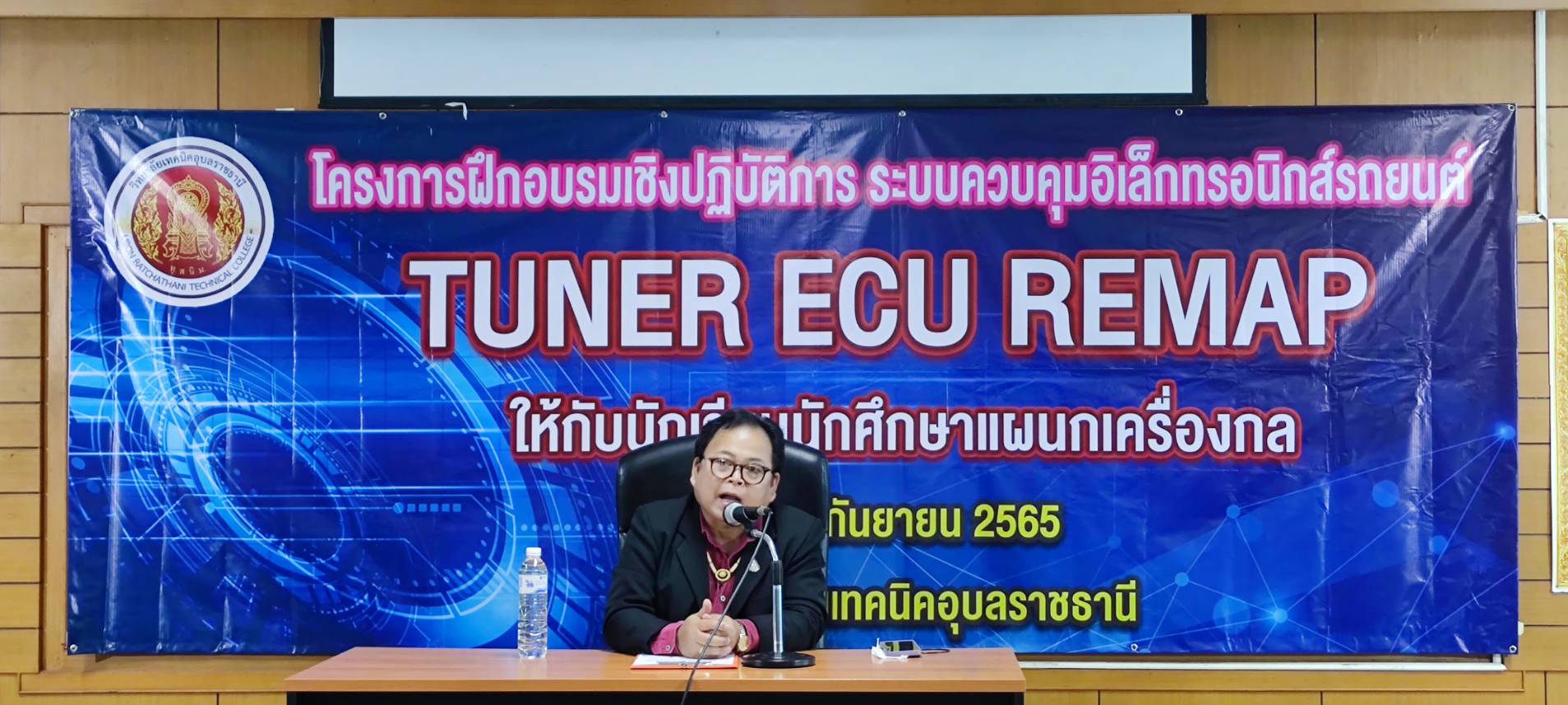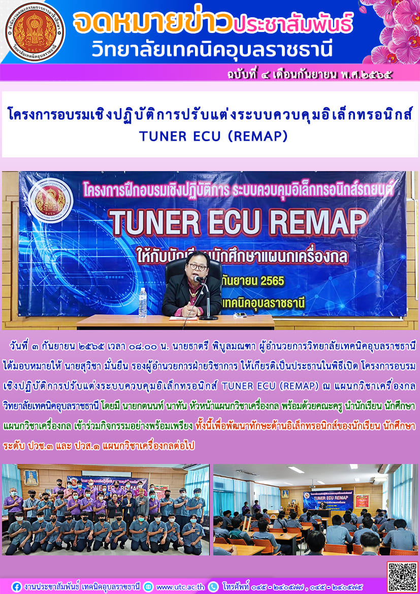 วันที่ ๓ กันยายน ๒๕๖๕ เวลา ๐๘.๐๐ น. นายธาตรี พิบูลมณฑา ผู้อำนวยการวิทยาลัยเทคนิคอุบลราชธานีได้มอบหมายให้ นายสุวิชา มั่นยืน รองผู้อำนวยการฝ่ายวิชาการ ให้เกียรติเป็นประธานในพิธีเปิด โครงการอบรมเชิงปฏิบัติการปรับแต่งระบบควบคุมอิเล็กทรอนิกส์ TUNER ECU (REMAP) ณ แผนกวิชาเครื่องกล วิทยาลัยเทคนิคอุบลราชธานี โดยมี นายกตนนท์ นาทัน หัวหน้าแผนกวิชาเครื่องกล พร้อมด้วยคณะครู นำนักเรียน นักศึกษา แผนกวิชาเครื่องกล เข้าร่วมกิจกรรมอย่างพร้อมเพรียง ทั้งนี้เพื่อพัฒนาทักษะด้านอิเล็กทรอนิกส์ของนักเรียน นักศึกษา ระดับ ปวช.๓ และ ปวส.๑ แผนกวิชาเครื่องกลต่อไป