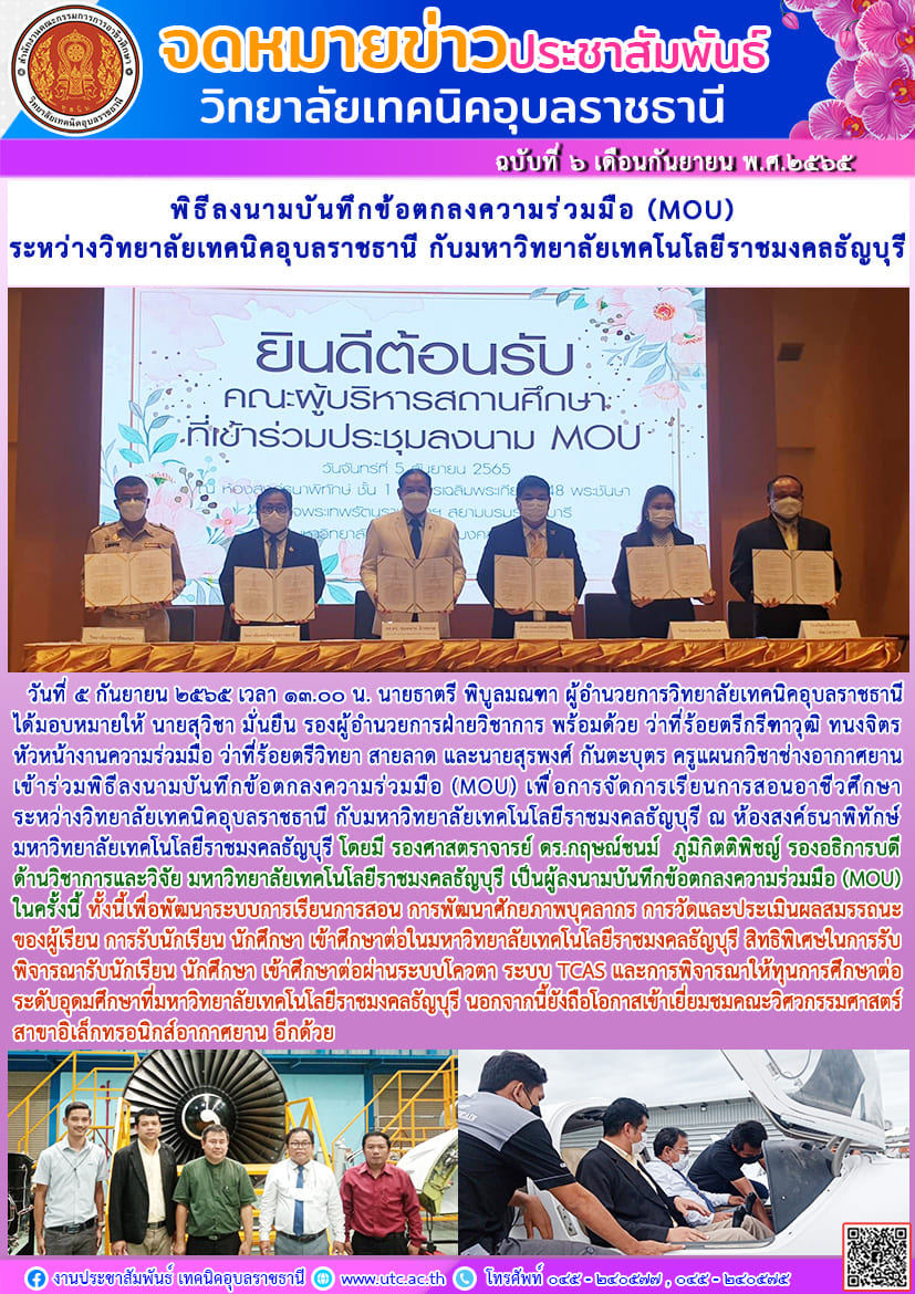 วันที่ ๕ กันยายน ๒๕๖๕เวลา ๑๓.๐๐ น. นายธาตรี พิบูลมณฑา ผู้อำนวยการวิทยาลัยเทคนิคอุบลราชธานี ได้มอบหมายให้ นายสุวิชา มั่นยืน รองผู้อำนวยการฝ่ายวิชาการ พร้อมด้วย ว่าที่ร้อยตรีกรีฑาวุฒิ ทนงจิตร หัวหน้างานความร่วมมือ ว่าที่ร้อยตรีวิทยา สายลาด และนายสุรพงศ์ กันตะบุตร ครูแผนกวิชาช่างอากาศยาน เข้าร่วมพิธีลงนามบันทึกข้อตกลงความร่วมมือ (MOU) เพื่อการจัดการเรียนการสอนอาชีวศึกษา ระหว่างวิทยาลัยเทคนิคอุบลราชธานี กับมหาวิทยาลัยเทคโนโลยีราชมงคลธัญบุรี ณ ห้องสงค์ธนาพิทักษ์ มหาวิทยาลัยเทคโนโลยีราชมงคลธัญบุรี โดยมี รองศาสตราจารย์ ดร.กฤษณ์ชนม์ ภูมิกิตติพิชญ์ รองอธิการบดี ด้านวิชาการและวิจัย มหาวิทยาลัยเทคโนโลยีราชมงคลธัญบุรี เป็นผู้ลงนามบันทึกข้อตกลงความร่วมมือ (MOU) ในครั้งนี้ ทั้งนี้เพื่อพัฒนาระบบการเรียนการสอน การพัฒนาศักยภาพบุคลากร การวัดและประเมินผลสมรรถนะของผู้เรียน การรับนักเรียน นักศึกษา เข้าศึกษาต่อในมหาวิทยาลัยเทคโนโลยีราชมงคลธัญบุรี สิทธิพิเศษในการรับพิจารณารับนักเรียน นักศึกษา เข้าศึกษาต่อผ่านระบบโควตา ระบบ TCAS และการพิจารณาให้ทุนการศึกษาต่อระดับอุดมศึกษาที่มหาวิทยาลัยเทคโนโลยีราชมงคลธัญบุรี นอกจากนี้ยังถือโอกาสเข้าเยี่ยมชมคณะวิศวกรรมศาสตร์ สาขาอิเล็กทรอนิกส์อากาศยาน อีกด้วย