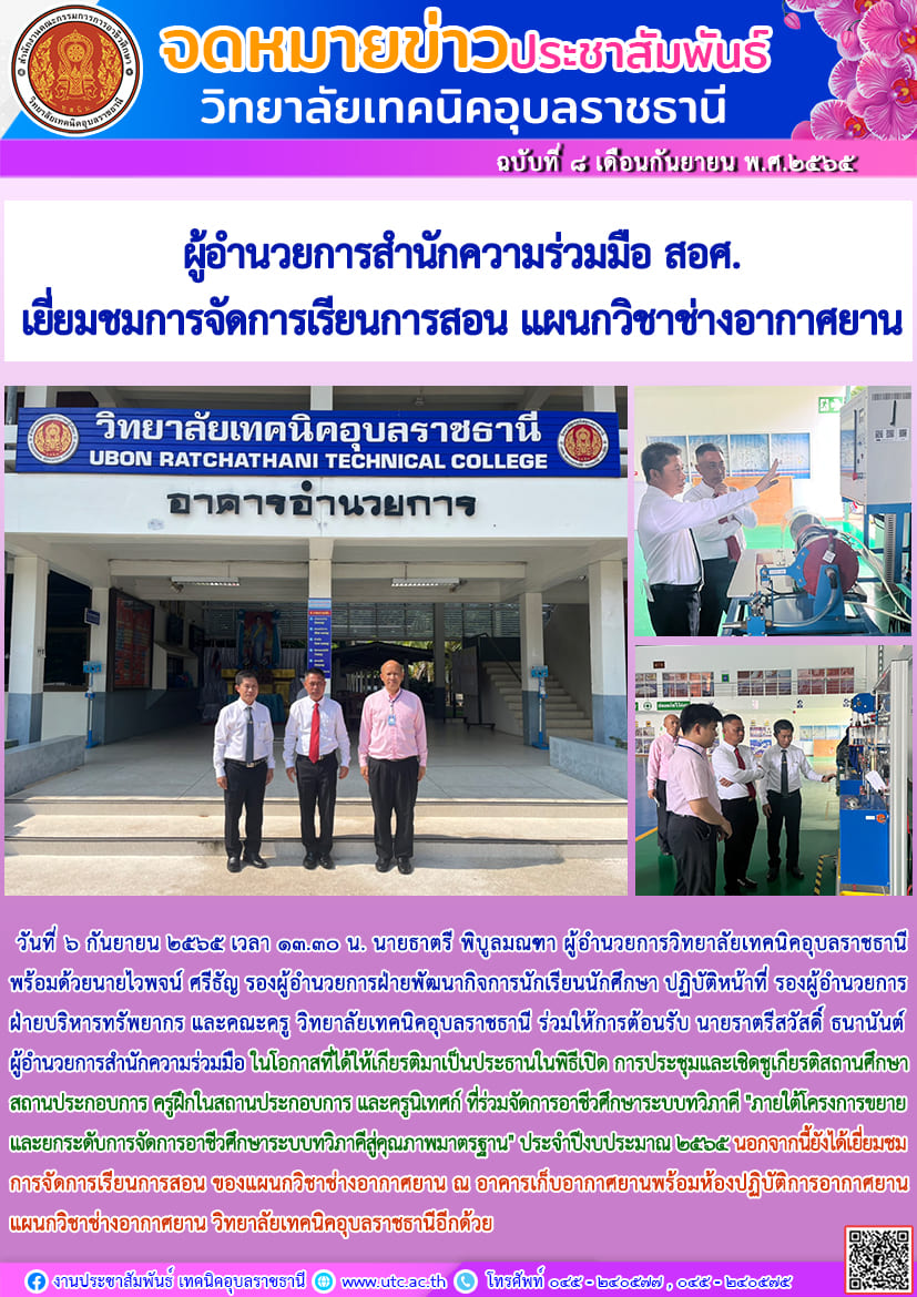วันที่ ๖ กันยายน ๒๕๖๕ เวลา ๑๓.๓๐ น. นายธาตรี พิบูลมณฑาผู้อำนวยการวิทยาลัยเทคนิคอุบลราชธานี พร้อมด้วยนายไวพจน์ ศรีธัญ รองผู้อำนวยการฝ่ายพัฒนากิจการนักเรียนนักศึกษา ปฏิบัติหน้าที่ รองผู้อำนวยการฝ่ายบริหารทรัพยากร และคณะครู วิทยาลัยเทคนิคอุบลราชธานี ร่วมให้การต้อนรับ นายราตรีสวัสดิ์ ธนานันต์ ผู้อำนวยการสำนักความร่วมมือ ในโอกาสที่ได้ให้เกียรติมาเป็นประธานในพิธีเปิด การประชุมและเชิดชูเกียรติสถานศึกษา สถานประกอบการ ครูฝึกในสถานประกอบการ และครูนิเทศก์ ที่ร่วมจัดการอาชีวศึกษาระบบทวิภาคี “ภายใต้โครงการขยายและยกระดับการจัดการอาชีวศึกษาระบบทวิภาคีสู่คุณภาพมาตรฐาน” ประจำปีงบประมาณ ๒๕๖๕ นอกจากนี้ยังได้เยี่ยมชมการจัดการเรียนการสอน ของแผนกวิชาช่างอากาศยาน ณ อาคารเก็บอากาศยานพร้อมห้องปฏิบัติการอากาศยาน แผนกวิชาช่างอากาศยาน วิทยาลัยเทคนิคอุบลราชธานีอีกด้วย