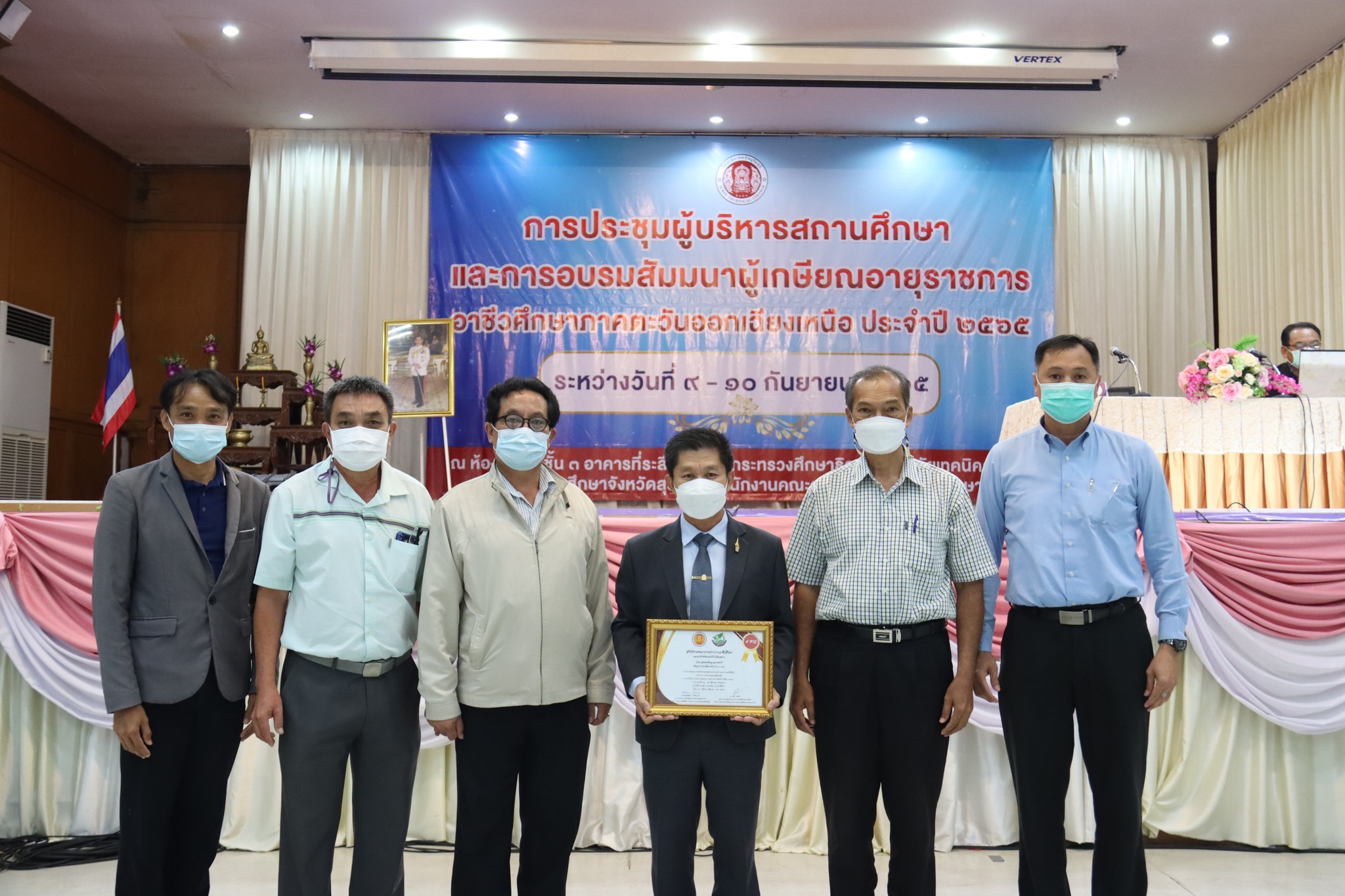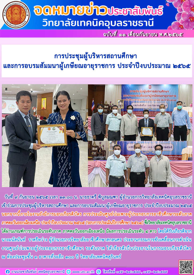 วันที่ ๙ กันยายน ๒๕๖๕ เวลา ๑๓.๐๐ น. นายธาตรี พิบูลมณฑา ผู้อำนวยการวิทยาลัยเทคนิคอุบลราชธานีเข้าร่วมการประชุมผู้บริหารสถานศึกษา และการอบรมสัมมนาผู้เกษียณอายุราชการ ประจำปีงบประมาณ ๒๕๖๕ นอกจากนี้ภายในงานยังมีการมอบเกียรติบัตร การประเมินศูนย์บ่มเพาะผู้ประกอบการอาชีวศึกษาระดับภาค ภาคตะวันออกเฉียงเหนือ ประจำปีงบประมาณ ๒๕๖๕ (รอบการประเมินปีการศึกษา ๒๕๖๔) ซึ่งวิทยาลัยเทคนิคอุบลราชธานี ได้ผ่านเกณฑ์การประเมินระดับภาค ภาคตะวันออกเฉียงเหนือ มีผลการประเมินระดับ ๔ ดาว โดยได้รับเกียรติจากนางมนัสนันท์ ราตรีหว่าง ผู้อำนวยการวิทยาลัยอาชีวศึกษาสกลนคร ประธานกรรมการขับเคลื่อนการดำเนินงานศูนย์บ่มเพาะผู้ประกอบการอาชีวศึกษา ระดับภาค ให้เกียรติเป็นประธานในการมอบเกียรติบัตร ณ ห้องประชุมชั้น ๓ อาคารที่ระลึก ๑๐๐ ปี วิทยาลัยเทคนิคสุรินทร์