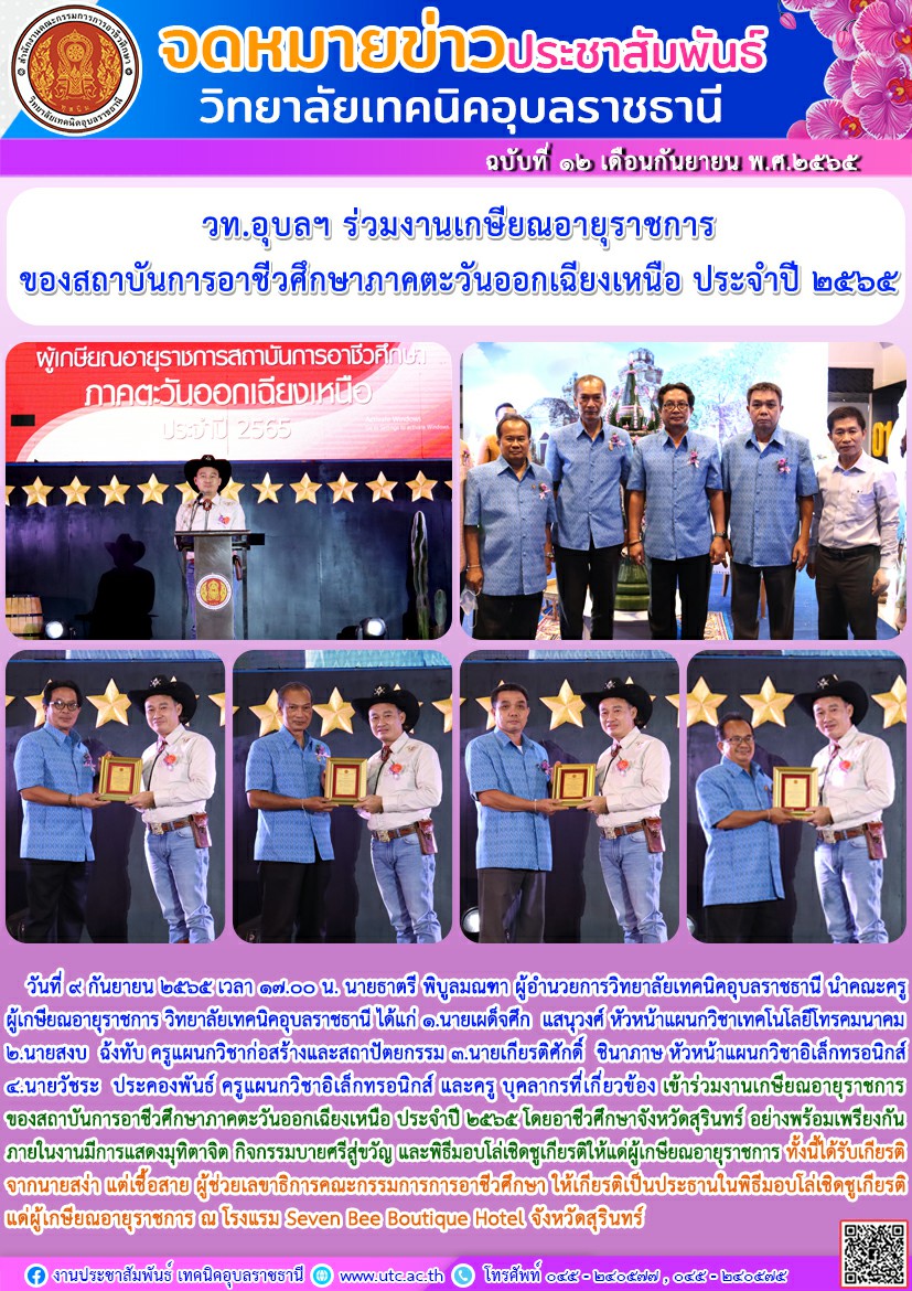 วันที่ ๙ กันยายน ๒๕๖๕ เวลา ๑๗.๐๐ น. นายธาตรี พิบูลมณฑาผู้อำนวยการวิทยาลัยเทคนิคอุบลราชธานี นำคณะครูผู้เกษียณอายุราชการ วิทยาลัยเทคนิคอุบลราชธานี ได้แก่ ๑.นายเผด็จศึก แสนุวงศ์ หัวหน้าแผนกวิชาเทคโนโลยีโทรคมนาคม ๒.นายสงบ ฉ้งทับ ครูแผนกวิชาช่างก่อสร้างและสถาปัตยกรรม ๓.นายเกียรติศักดิ์ ชินาภาษ หัวหน้าแผนกวิชาอิเล็กทรอนิกส์ ๔.นายวัชระ ประคองพันธ์ ครูแผนกวิชาอิเล็กทรอนิกส์ และครู บุคลากรที่เกี่ยวข้อง เข้าร่วมงานเกษียณอายุราชการ ของสถาบันการอาชีวศึกษาภาคตะวันออกเฉียงเหนือ ประจำปี ๒๕๖๕ โดยอาชีวศึกษาจังหวัดสุรินทร์ อย่างพร้อมเพรียงกัน ภายในงานมีการแสดงมุทิตาจิต กิจกรรมบายศรีสู่ขวัญ และพิธีมอบโล่เชิดชูเกียรติให้แด่ผู้เกษียณอายุราชการ ทั้งนี้ได้รับเกียรติจาก นายสง่า แต่เชื้อสาย ผู้ช่วยเลขาธิการคณะกรรมการการอาชีวศึกษา ให้เกียรติเป็นประธานในพิธีมอบโล่เชิดชูเกียรติแด่ผู้เกษียณอายุราชการ ณ โรงแรม Seven Bee Boutique Hotel จังหวัดสุรินทร์