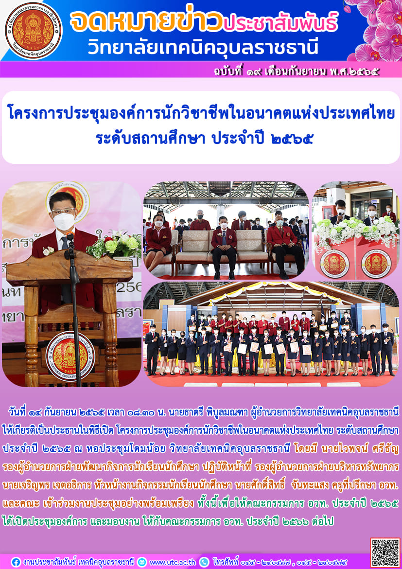 วันที่ ๑๔ กันยายน ๒๕๖๕ เวลา ๐๘.๓๐ น. นายธาตรี พิบูลมณฑา ผู้อำนวยการวิทยาลัยเทคนิคอุบลราชธานีให้เกียรติเป็นประธานในพิธีเปิด โครงการประชุมองค์การนักวิชาชีพในอนาคตแห่งประเทศไทย ระดับสถานศึกษา ประจำปี ๒๕๖๕ ณ หอประชุมโดมน้อย วิทยาลัยเทคนิคอุบลราชธานี โดยมี นายไวพจน์ ศรีธัญ รองผู้อำนวยการฝ่ายพัฒนากิจการนักเรียนนักศึกษา ปฏิบัติหน้าที่ รองผู้อำนวยการฝ่ายบริหารทรัพยากร นายเจริญพร เจตอธิการ หัวหน้างานกิจกรรมนักเรียนนักศึกษา นายศักดิ์สิทธิ์ จันทะแสง ครูที่ปรึกษา อวท. และคณะ เข้าร่วมงานประชุมอย่างพร้อมเพรียง ทั้งนี้เพื่อให้คณะกรรมการ อวท. ประจำปี ๒๕๖๕ ได้เปิดประชุมองค์การ และมอบงาน ให้กับคณะกรรมการ อวท. ประจำปี ๒๕๖๖ ต่อไป