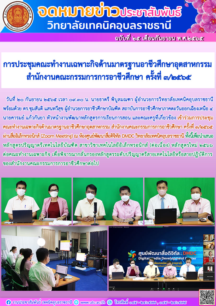 วันที่ ๒๐ กันยายน ๒๕๖๕เวลา ๐๙.๓๐ น. นายธาตรี พิบูลมณฑา ผู้อำนวยการวิทยาลัยเทคนิคอุบลราชธานี พร้อมด้วย ดร.ชุมสันติ แสนทวีสุข ผู้อำนวยการอาชีวศึกษาบัณฑิต สถาบันการอาชีวศึกษาภาคตะวันออกเฉียงเหนือ ๔ นายคารมย์ แก้วกันยา หัวหน้างานพัฒนาหลักสูตรการเรียนการสอน และคณะครู แผนกวิชาอิเล็กทรอนิกส์ที่เกี่ยวข้อง เข้าร่วมการประชุมคณะทำงานเฉพาะกิจด้านมาตรฐานอาชีวศึกษาอุตสาหกรรม สำนักงานคณะกรรมการการอาชีวศึกษา ครั้งที่ ๓/๒๕๖๕ ผ่านสื่ออิเล็กทรอนิกส์ (Zoom Meeting) ณ ห้องศูนย์พัฒนาสื่อดิจิทัล DMDC วิทยาลัยเทคนิคอุบลราชธานี ทั้งนี้เพื่อนำเสนอหลักสูตรปริญญาตรีเทคโนโลยีบัณฑิต สาขาวิชาเทคโนโลยีอิเล็กทรอนิกส์ (ต่อเนื่อง) หลักสูตรใหม่ 2566 ต่อคณะทำงานเฉพาะกิจ เพื่อพิจารณากลั่นกรองหลักสูตรระดับปริญญาตรีสายเทคโนโลยีหรือสายปฏิบัติการ ของสำนักงานคณะกรรมการการอาชีวศึกษาต่อไป