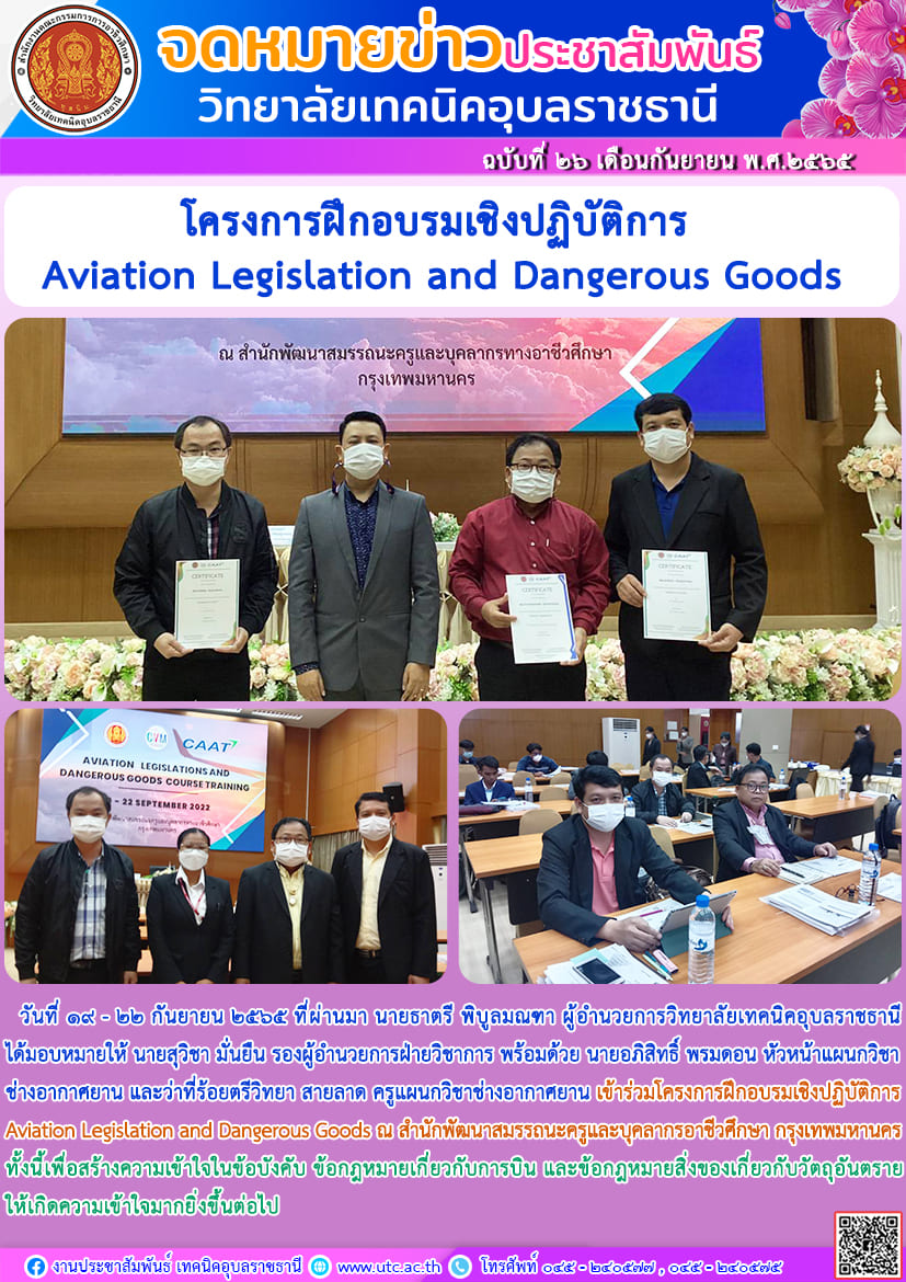 วันที่ ๑๙ – ๒๒ กันยายน ๒๕๖๕ ที่ผ่านมา นายธาตรี พิบูลมณฑาผู้อำนวยการวิทยาลัยเทคนิคอุบลราชธานี ได้มอบหมายให้ นายสุวิชา มั่นยืน รองผู้อำนวยการฝ่ายวิชาการ พร้อมด้วย นายอภิสิทธิ์ พรมดอน หัวหน้าแผนกวิชาช่างอากาศยาน และว่าที่ร้อยตรีวิทยา สายลาด ครูแผนกวิชาช่างอากาศยาน เข้าร่วมโครงการฝึกอบรมเชิงปฏิบัติการ Aviation Legislation and Dangerous Goods ณ สำนักพัฒนาสมรรถนะครูและบุคลากรอาชีวศึกษา กรุงเทพมหานคร ทั้งนี้เพื่อสร้างความเข้าใจในข้อบังคับ ข้อกฎหมายเกี่ยวกับการบิน และข้อกฎหมายสิ่งของเกี่ยวกับวัตถุอันตราย ให้เกิดความเข้าใจมากยิ่งขึ้นต่อไป