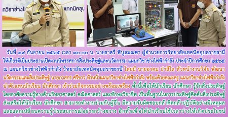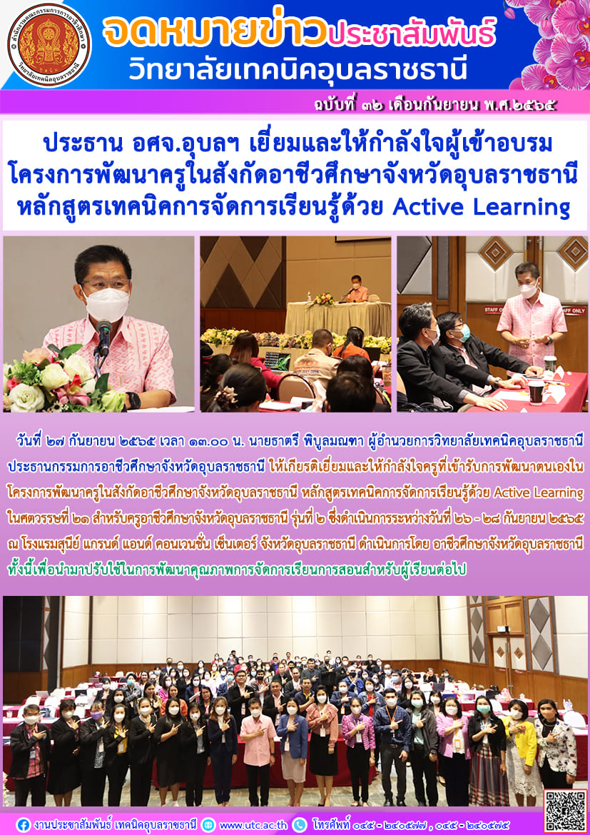 วันที่ ๒๗ กันยายน ๒๕๖๕ เวลา ๑๓.๐๐ น. นายธาตรี พิบูลมณฑา ผู้อำนวยการวิทยาลัยเทคนิคอุบลราชธานี ประธานกรรมการอาชีวศึกษาจังหวัดอุบลราชธานี ให้เกียรติเยี่ยมและให้กำลังใจครูที่เข้ารับการพัฒนาตนเองในโครงการพัฒนาครูในสังกัดอาชีวศึกษาจังหวัดอุบลราชธานี หลักสูตรเทคนิคการจัดการเรียนรู้ด้วย Active Learning ในศตวรรษที่ ๒๑ สำหรับครูอาชีวศึกษาจังหวัดอุบลราชธานี รุ่นที่ ๒ ซึ่งดำเนินการระหว่างวันที่ ๒๖ – ๒๘ กันยายน ๒๕๖๕ ณ โรงแรมสุนีย์ แกรนด์ แอนด์ คอนเวนชั่น เซ็นเตอร์ จังหวัดอุบลราชธานี ดำเนินการโดย อาชีวศึกษาจังหวัดอุบลราชธานี ทั้งนี้เพื่อนำมาปรับใช้ในการพัฒนาคุณภาพการจัดการเรียนการสอนสำหรับผู้เรียนต่อไป