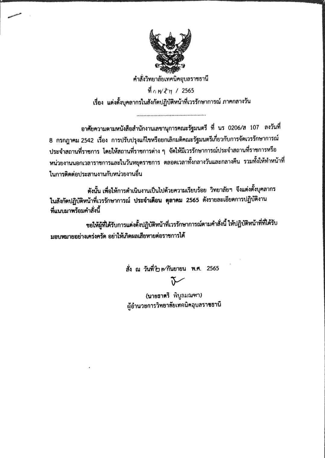 แต่งตั้งบุคคลากรในสังกัดปฏิบัติหน้าที่เวรรักษาการณ์ ภาคกลางคืน ประจำเดือนตุลาคม 2565