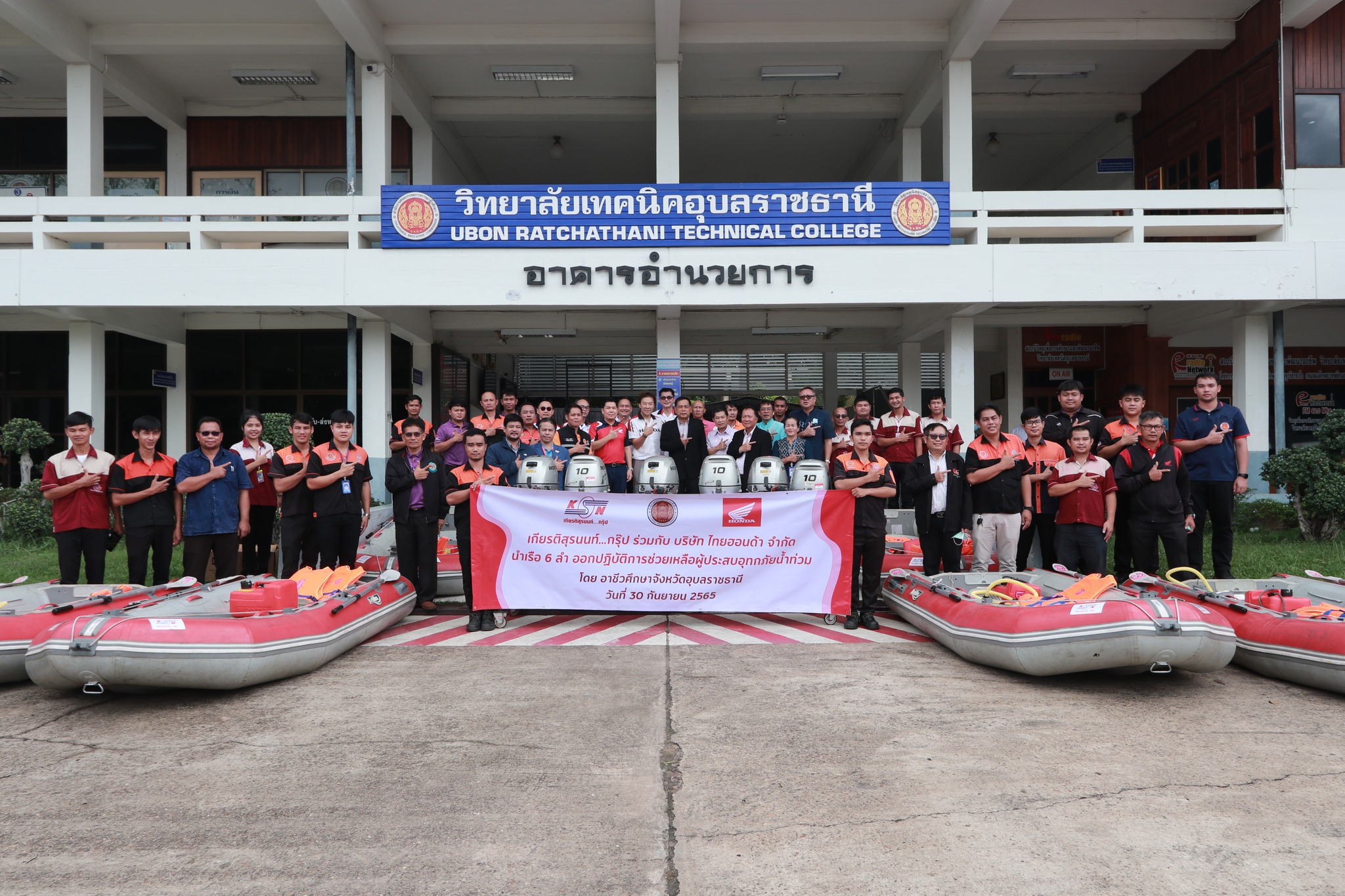 วันที่ ๓๐ กันยายน ๒๕๖๕ เวลา ๑๐.๓๐ น. นายธาตรี พิบูลมณฑา ผู้อำนวยการวิทยาลัยเทคนิคอุบลราชธานี พร้อมด้วย นายไวพจน์ ศรีธัญ รองผู้อำนวยการฝ่ายพัฒนากิจการนักเรียนนักศึกษา ปฏิบัติหน้าที่ รองผู้อำนวยการฝ่ายบริหารทรัพยากร นางราตรี สะดีวงศ์ รองผู้อำนวยการฝ่ายแผนงานและความร่วมมือ นายอภิสิทธิ์ โคนพันธ์ หัวหน้างานโครงการพิเศษและการบริการชุมชน นายชัยวัฒน์ เหล่าบุตรสา หัวหน้าศูนย์ซ่อมสร้างเพื่อชุมชน (Fix it Center) แบบถาวร วิทยาลัยเทคนิคอุบลราชธานี นำคณะครู และบุคลากรที่เกี่ยวข้อง เข้ารับมอบเรือยางพร้อมเครื่องยนต์ฮอนด้า จำนวน ๖ ลำ จากบริษัทไทยฮอนด้า จำกัด ร่วมกับบริษัทเกียรติสุรนนท์ กรุ๊ป ณ อาคารอำนวยการ วิทยาลัยเทคนิคอุบลราชธานี ในการนี้มี นายลิขิต พลเหลา ผู้อำนวยการสถาบันการอาชีวศึกษาภาคตะวันออกเฉียงเหนือ ๔ พร้อมคณะ ได้มาร่วมรับมอบในครั้งนี้ด้วย ทั้งนี้เพื่อนำไปช่วยเหลือผู้ที่ประสบภัยน้ำท่วมจากอิทธิพลของพายุโนรู ในเขตพื้นที่จังหวัดอุบลราชธานีต่อไป